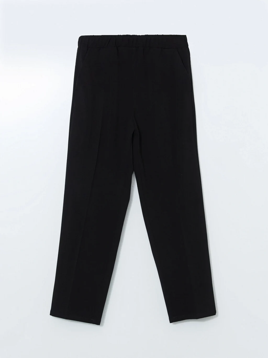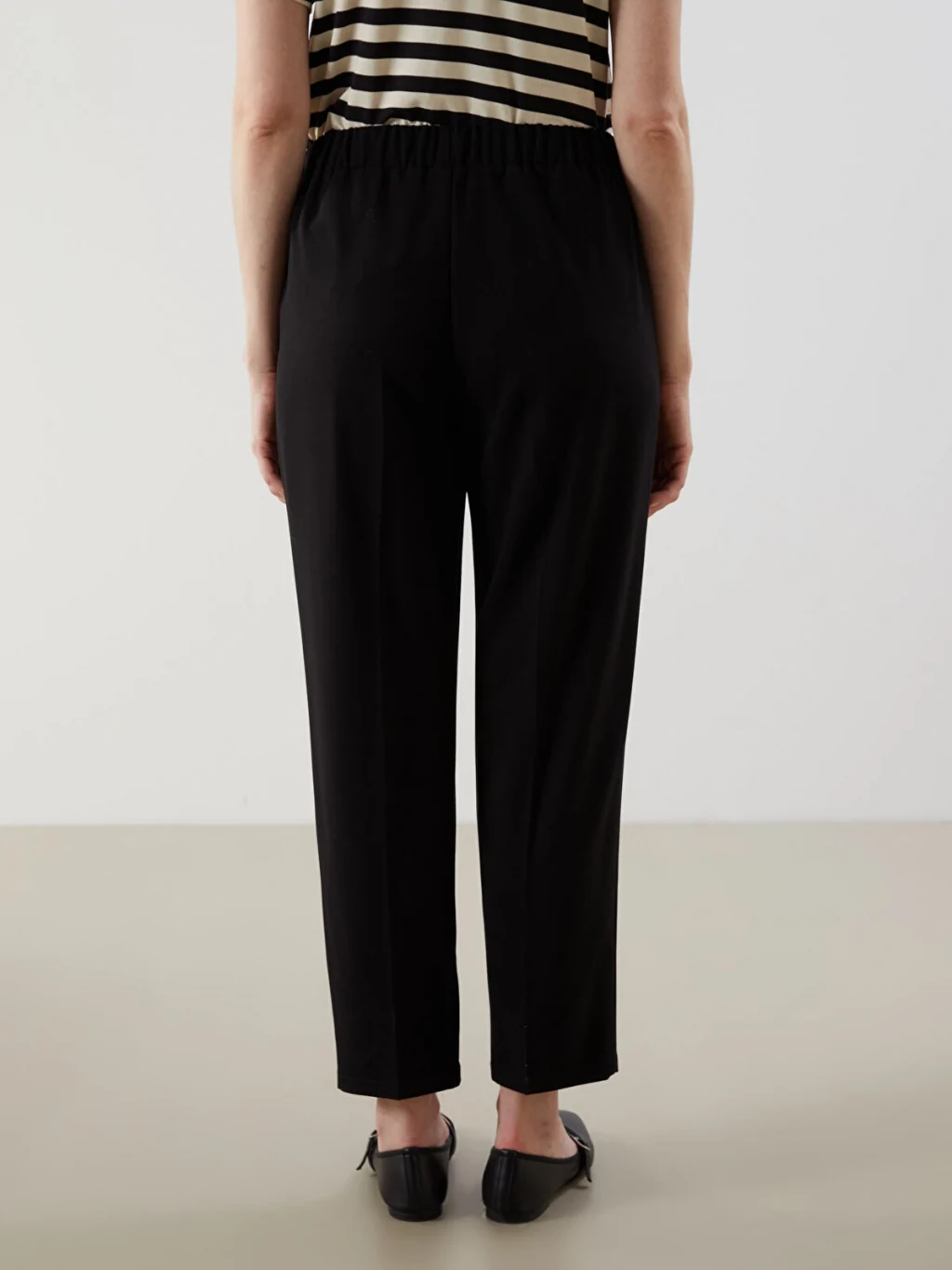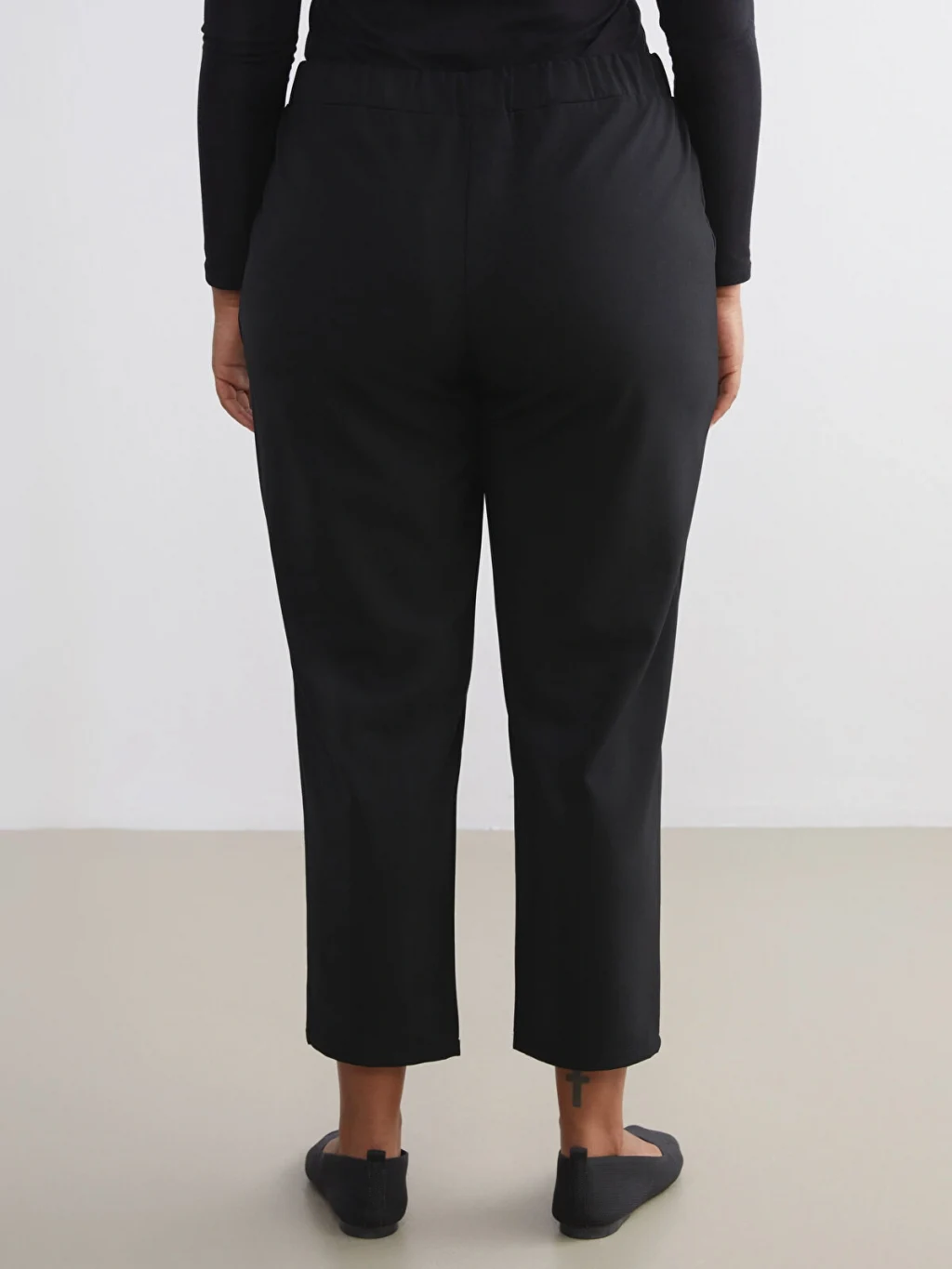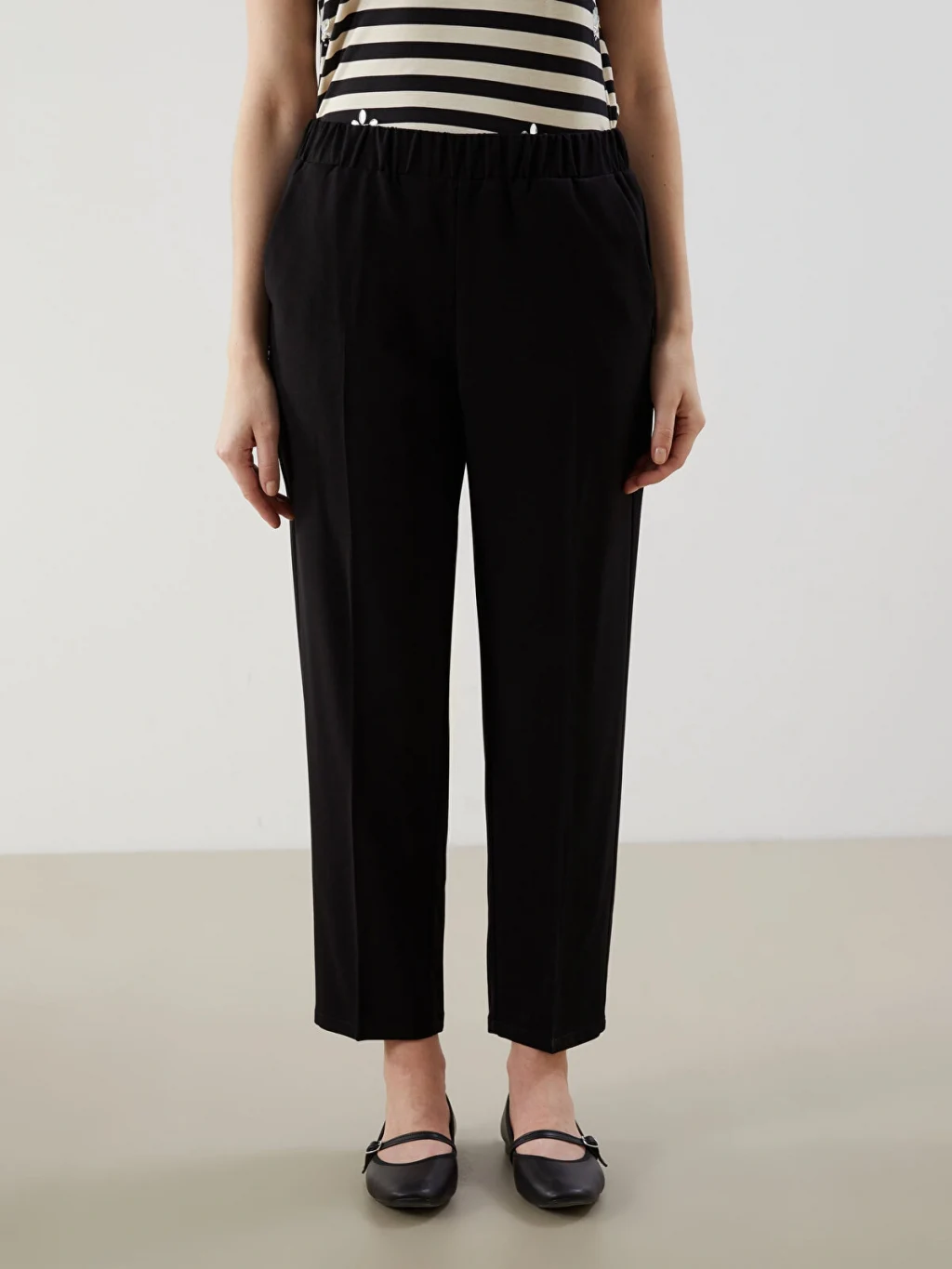 Beli lastikli kadın pantolon, viskoz karışımlı kumaştan üretilmiştir. İki yandan cepli tasarıma sahiptir.