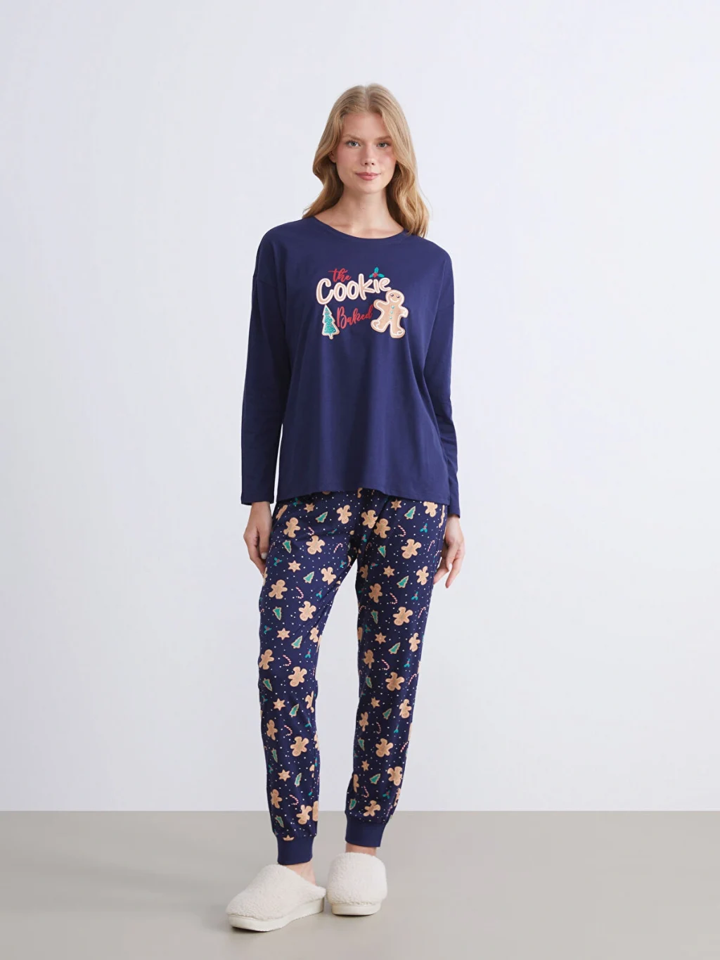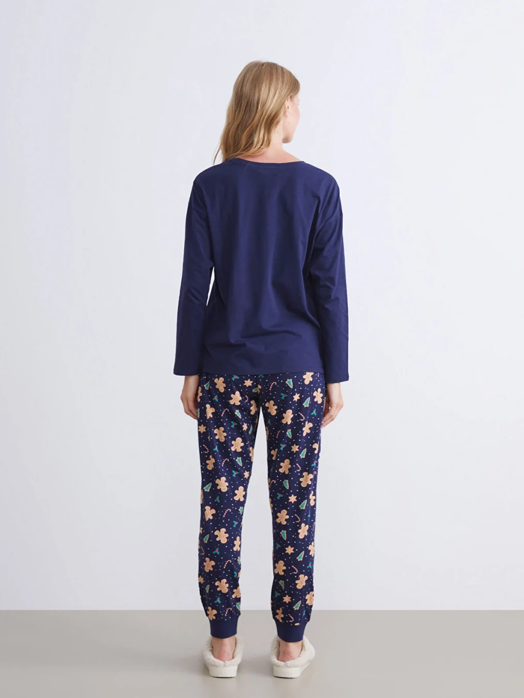 Penye kumaştan kadın pijama takımı; bisiklet yaka, uzun kollu üst ve beli lastikli, paçaları ribanalı desenli alttan oluşmaktadır.