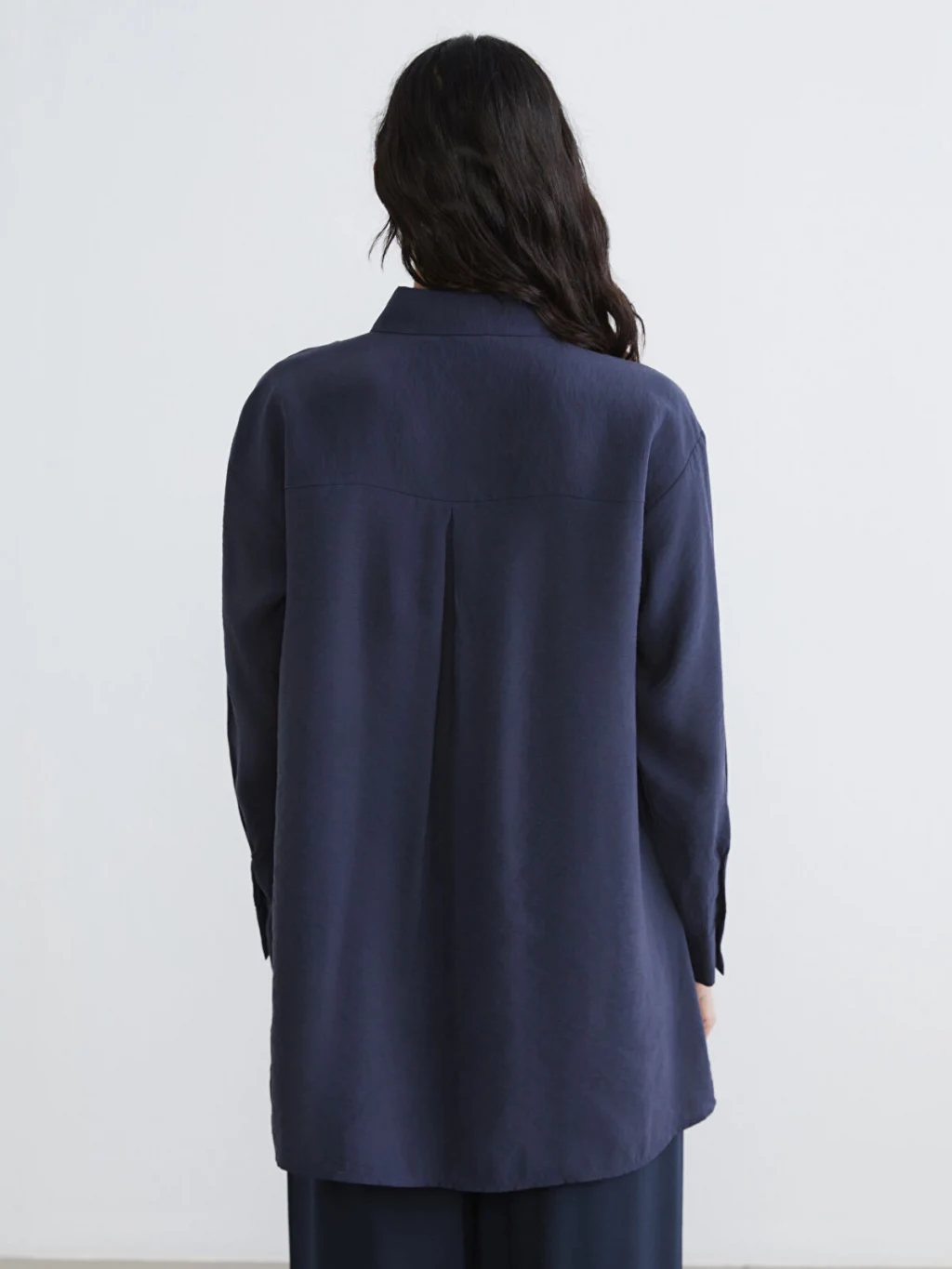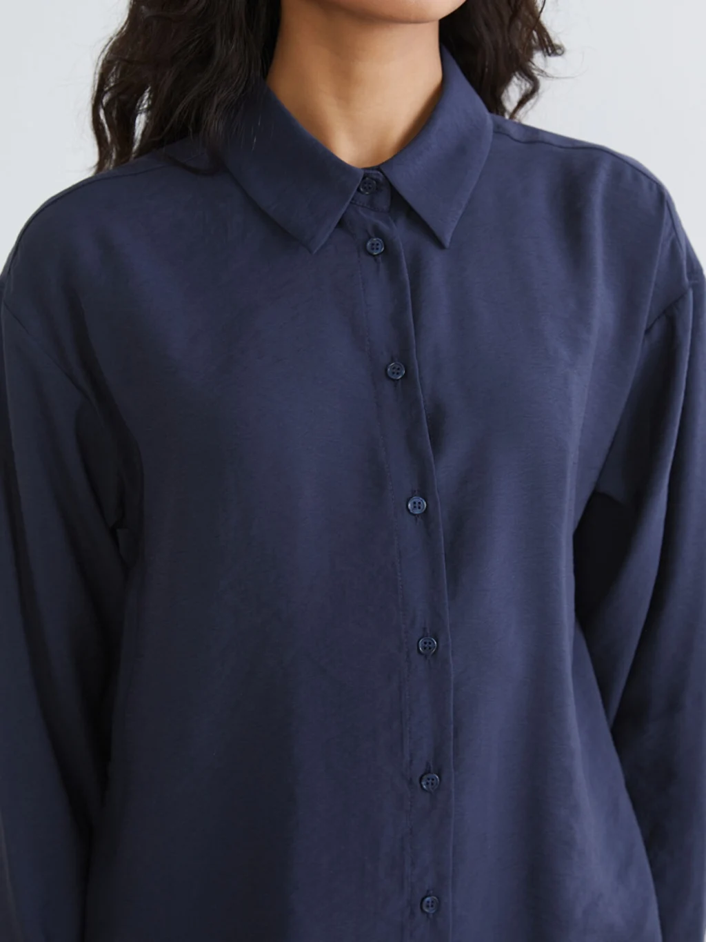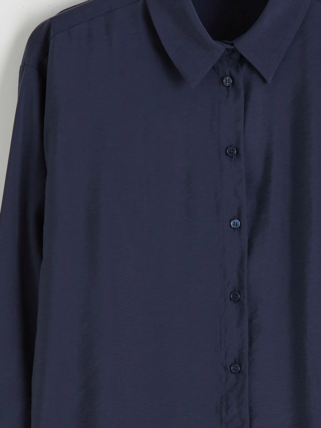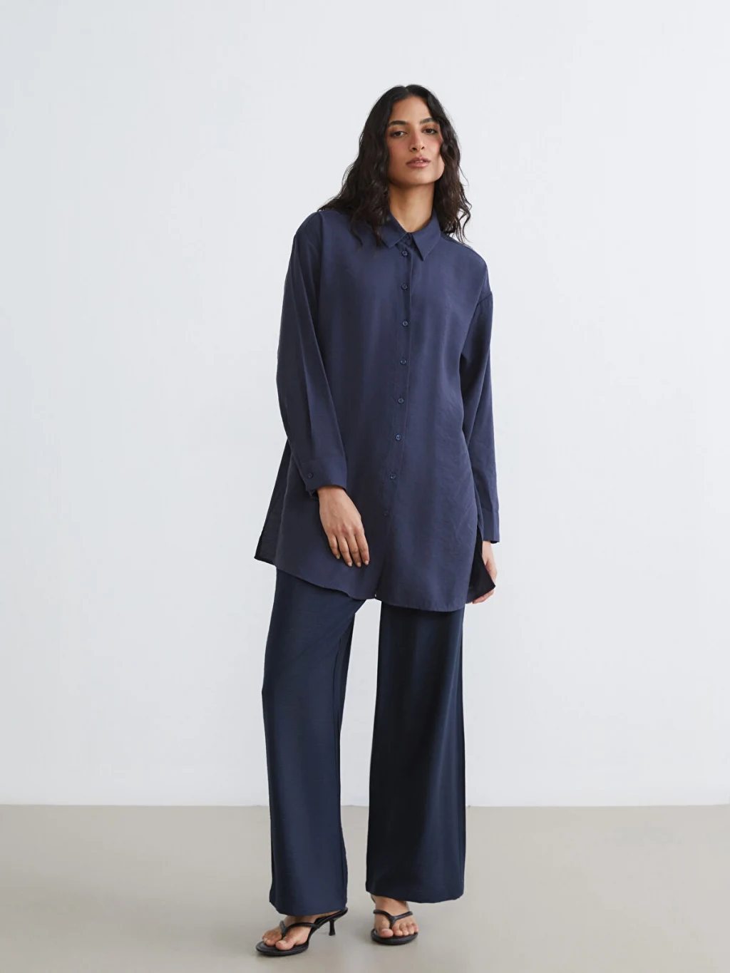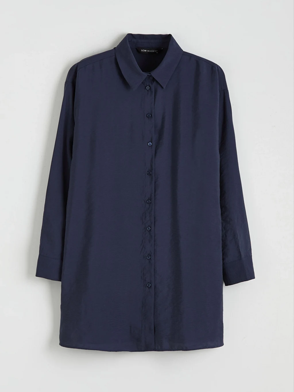 Kadın gömlek tunik, uzun kollu ve düz kesimlidir. Önden düğme kapamalı tasarıma sahip olup, kol uçları manşetlidir.