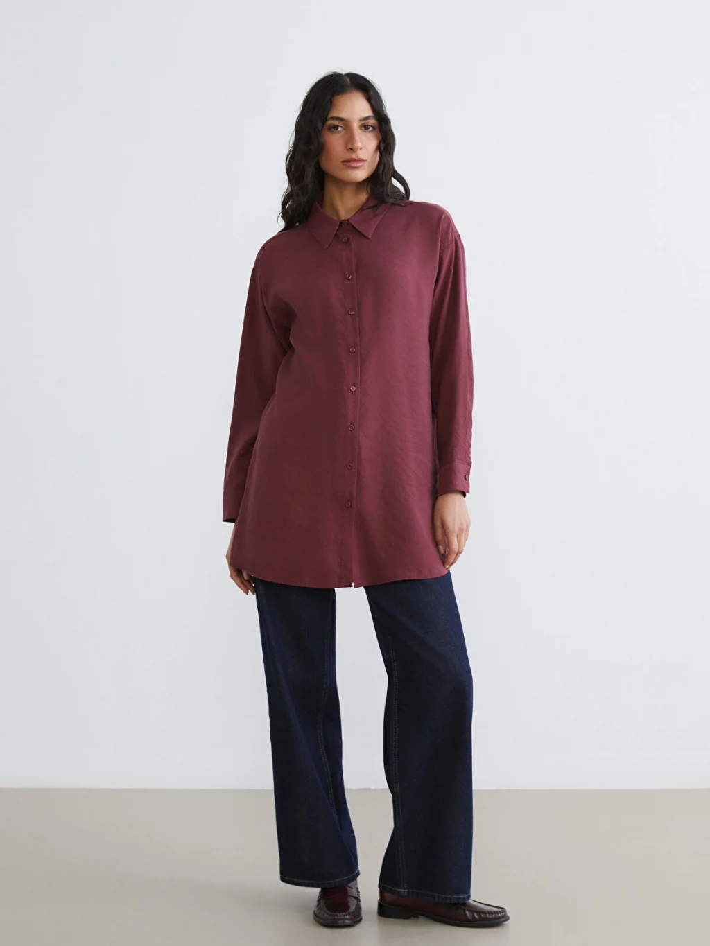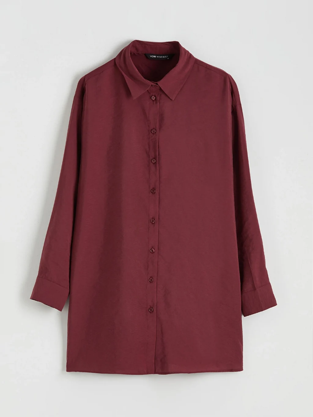 Yakalı ve uzun kollu kadın gömlek tunik, önden düğme kapamalıdır. Kolları manşetlidir ve düz kesime sahiptir.