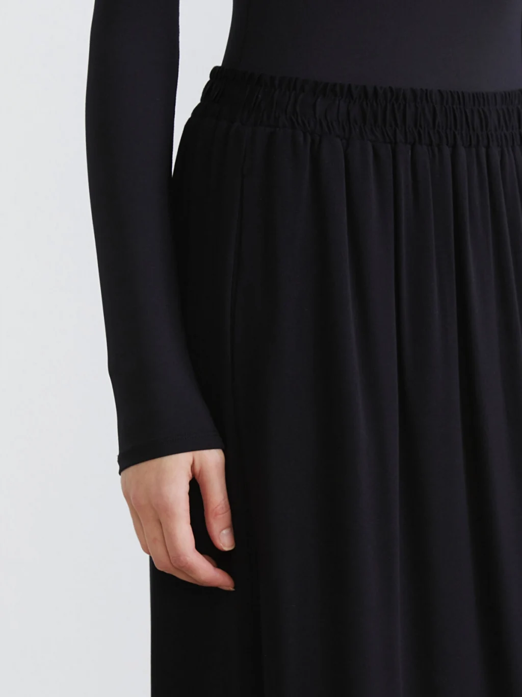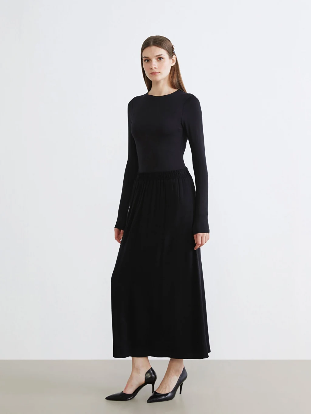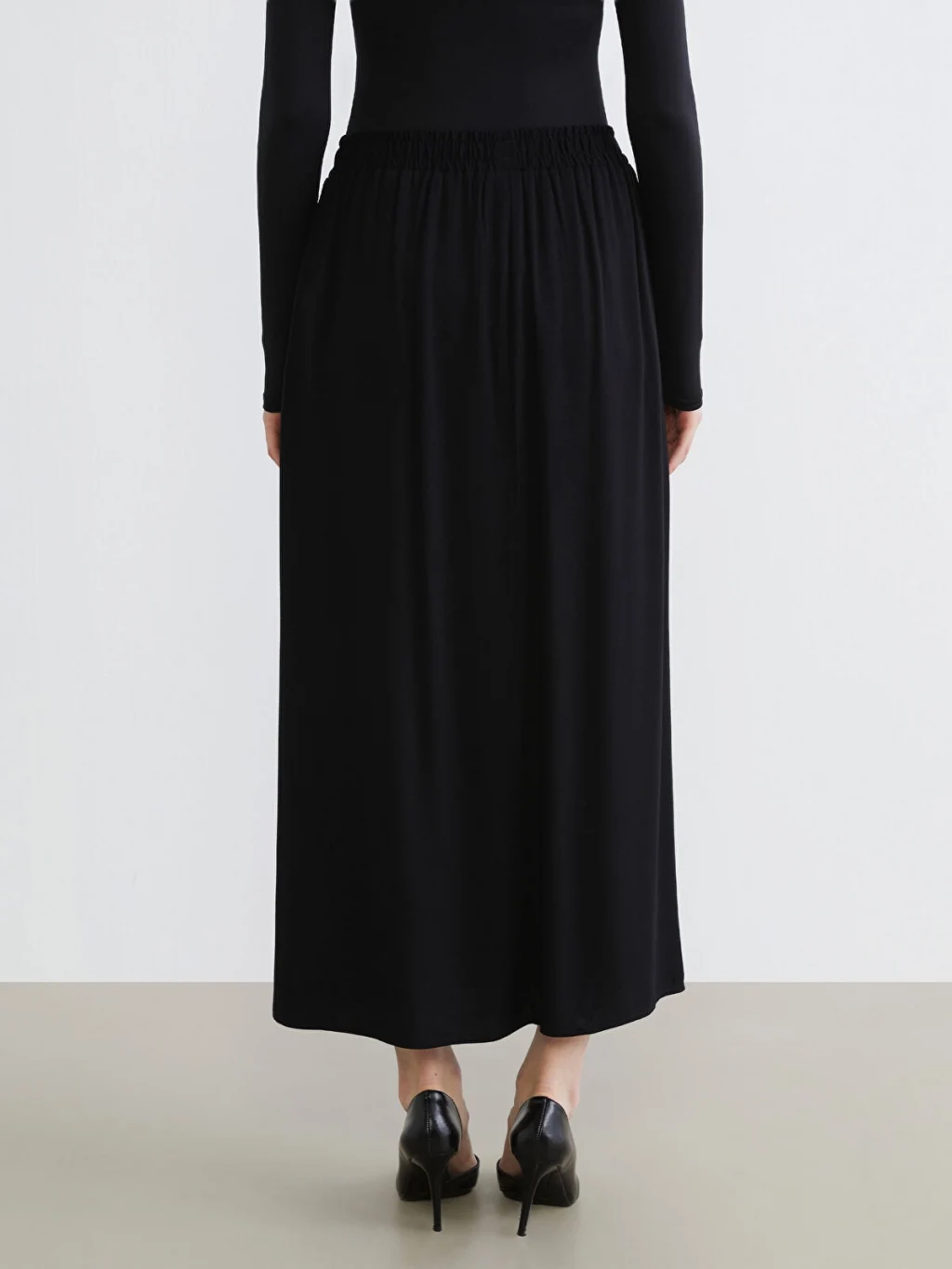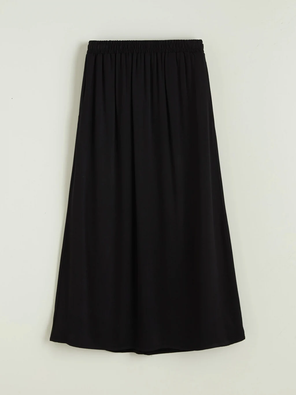 Beli lastikli ve genişleyen kesime sahip kadın etek, belmando kumaştan üretilmiştir. Uzun boylu ve astarsızdır.