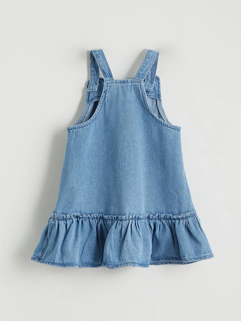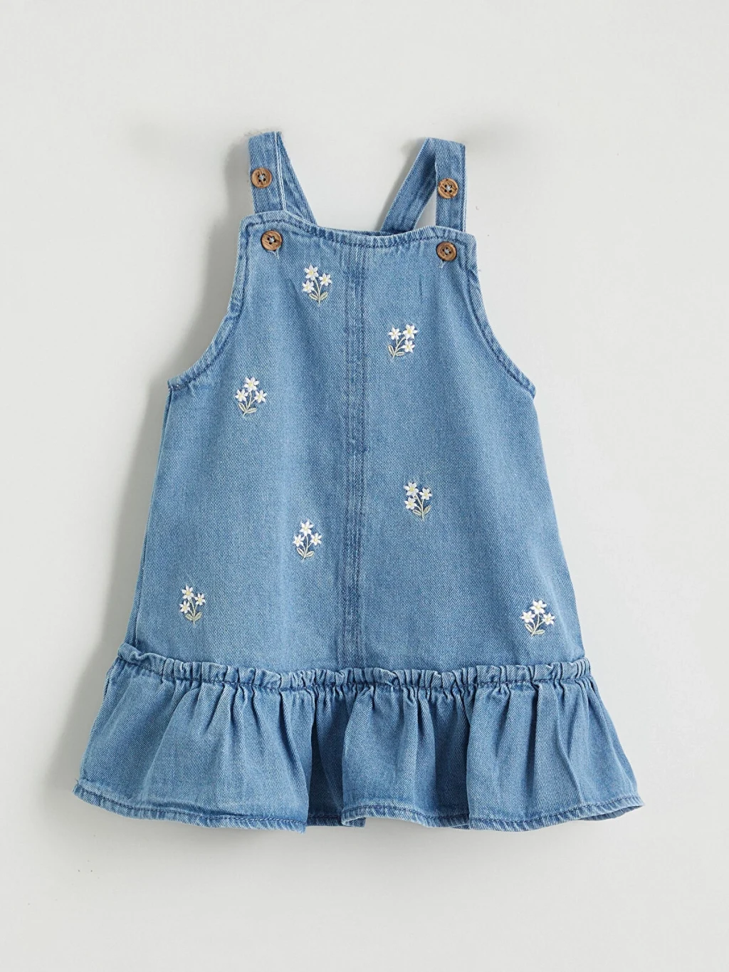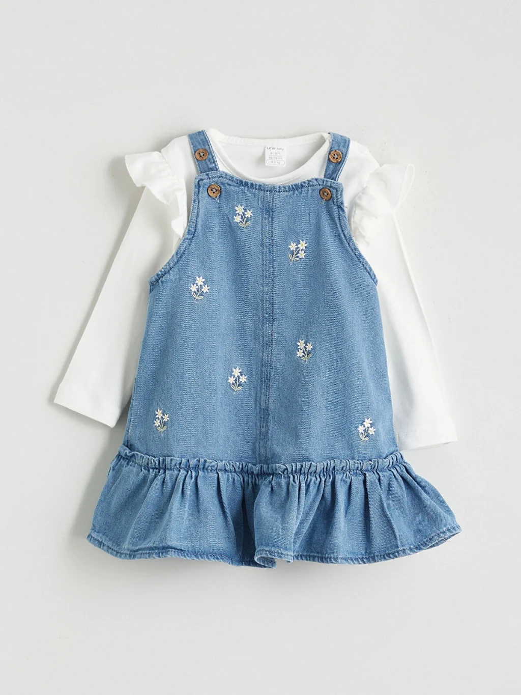 Kız bebek takım; bisiklet yaka, omuzları fırfırlı uzun kollu tişört ve çiçek işlemeli, askıları düğme kapamalı, etekleri fırfırlı jile elbise içerir.