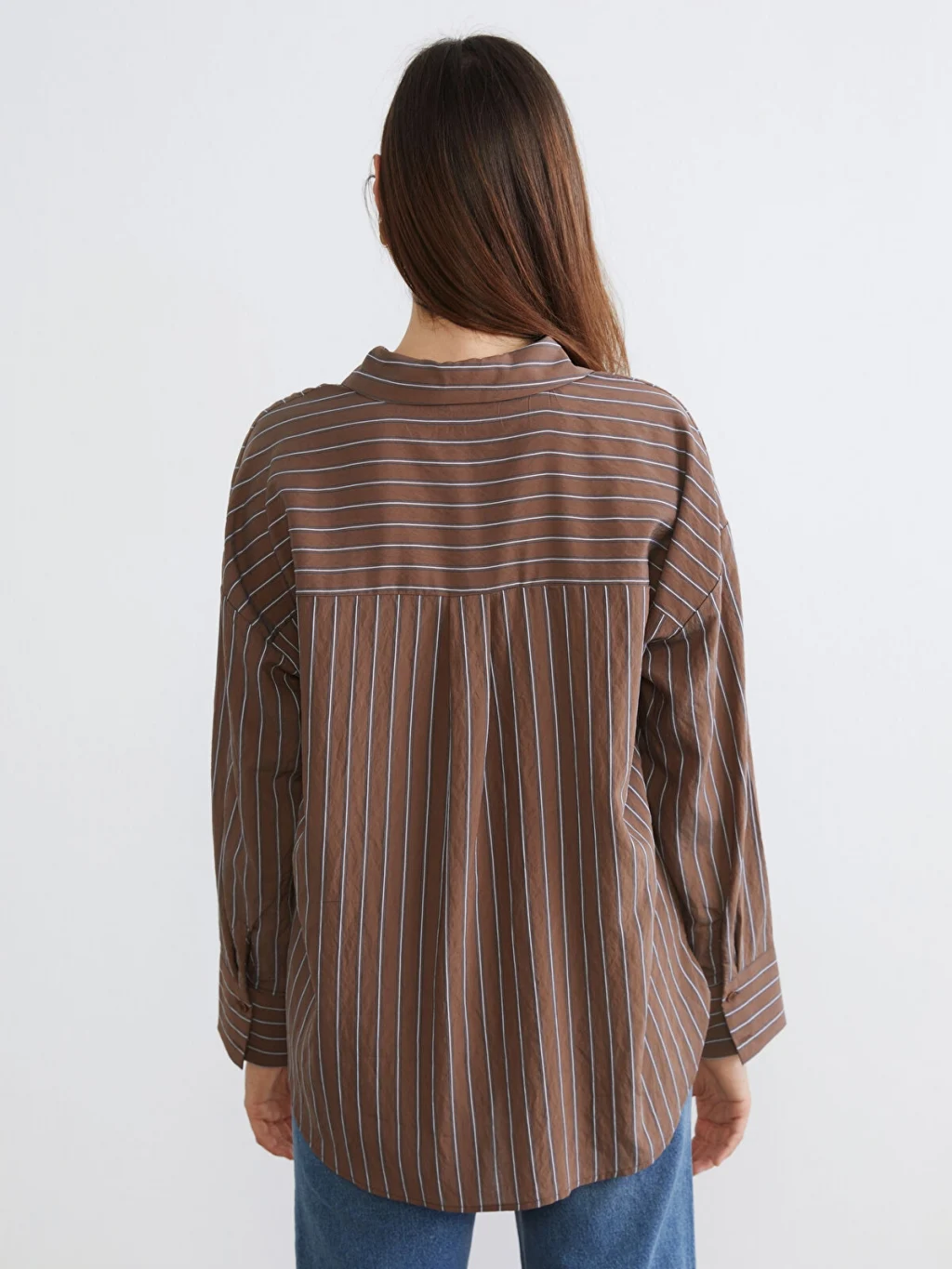 Çizgili desenli, uzun kollu kadın gömlek. Önden tam boy düğme kapamalı tasarıma sahiptir ve manşetleri düğmelidir.