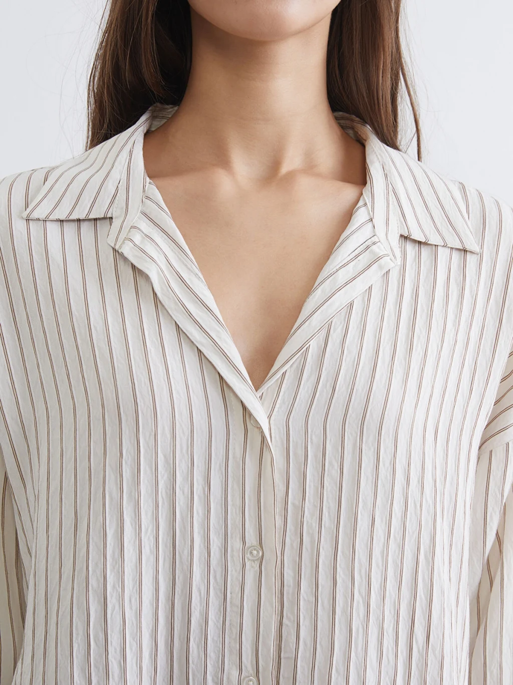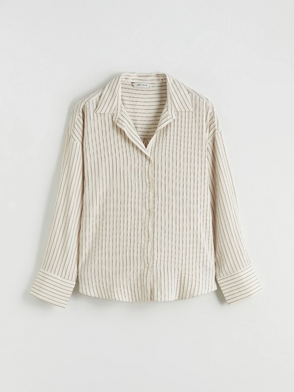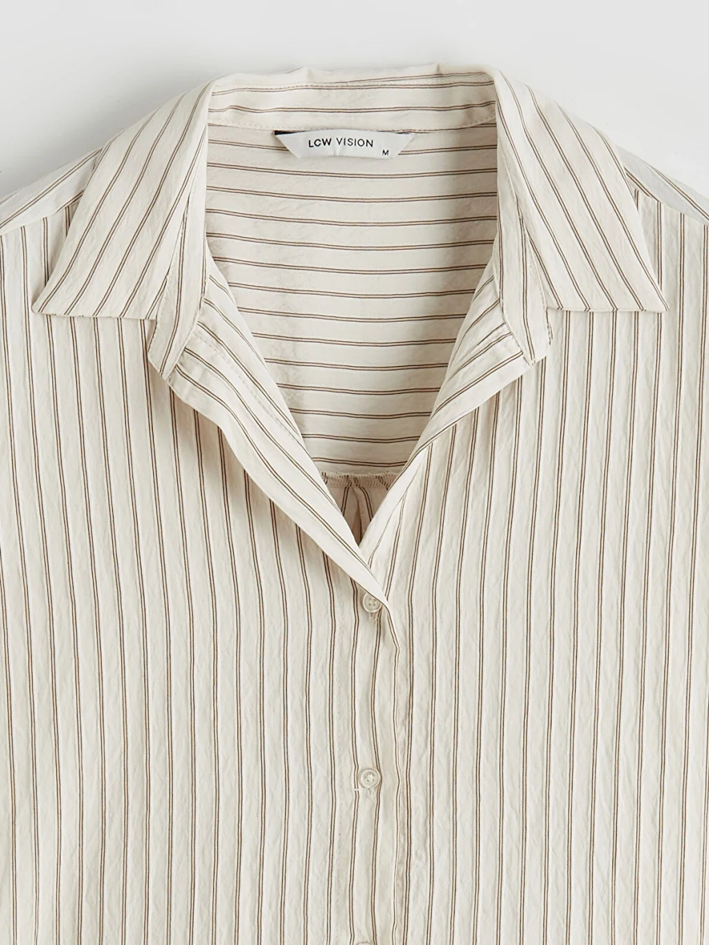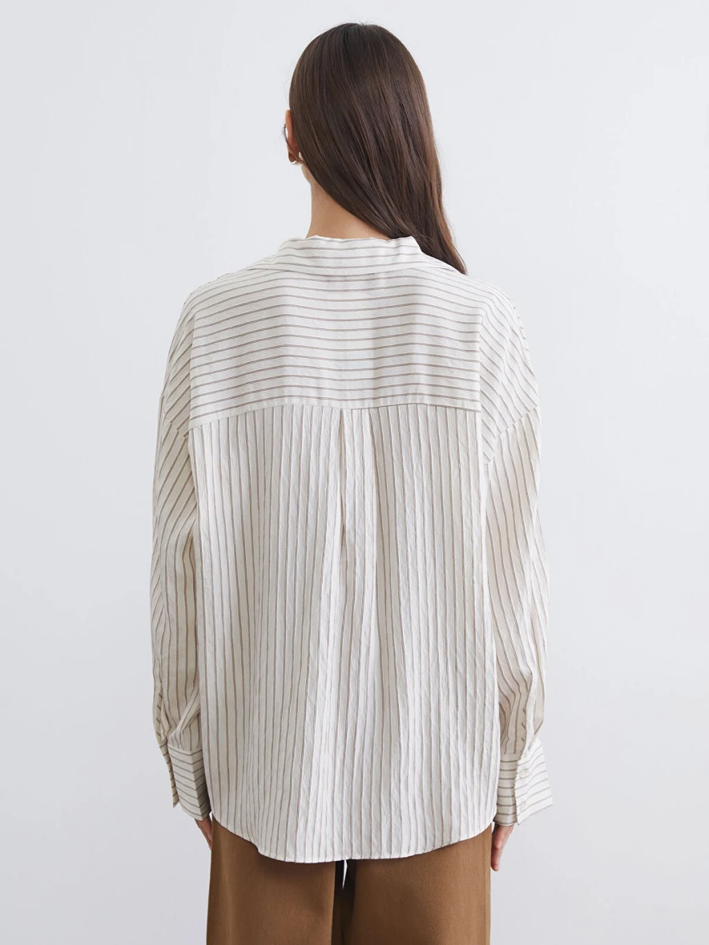 Yüksek pamuk içerikli kumaştan üretilmiş, çizgili kadın gömlek. Uzun kollu ve önden düğme kapamalıdır.