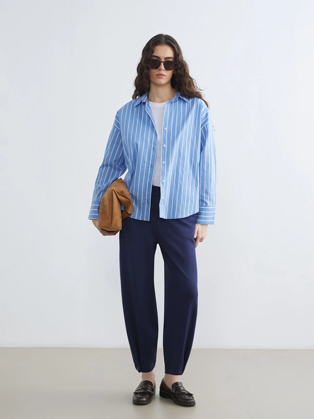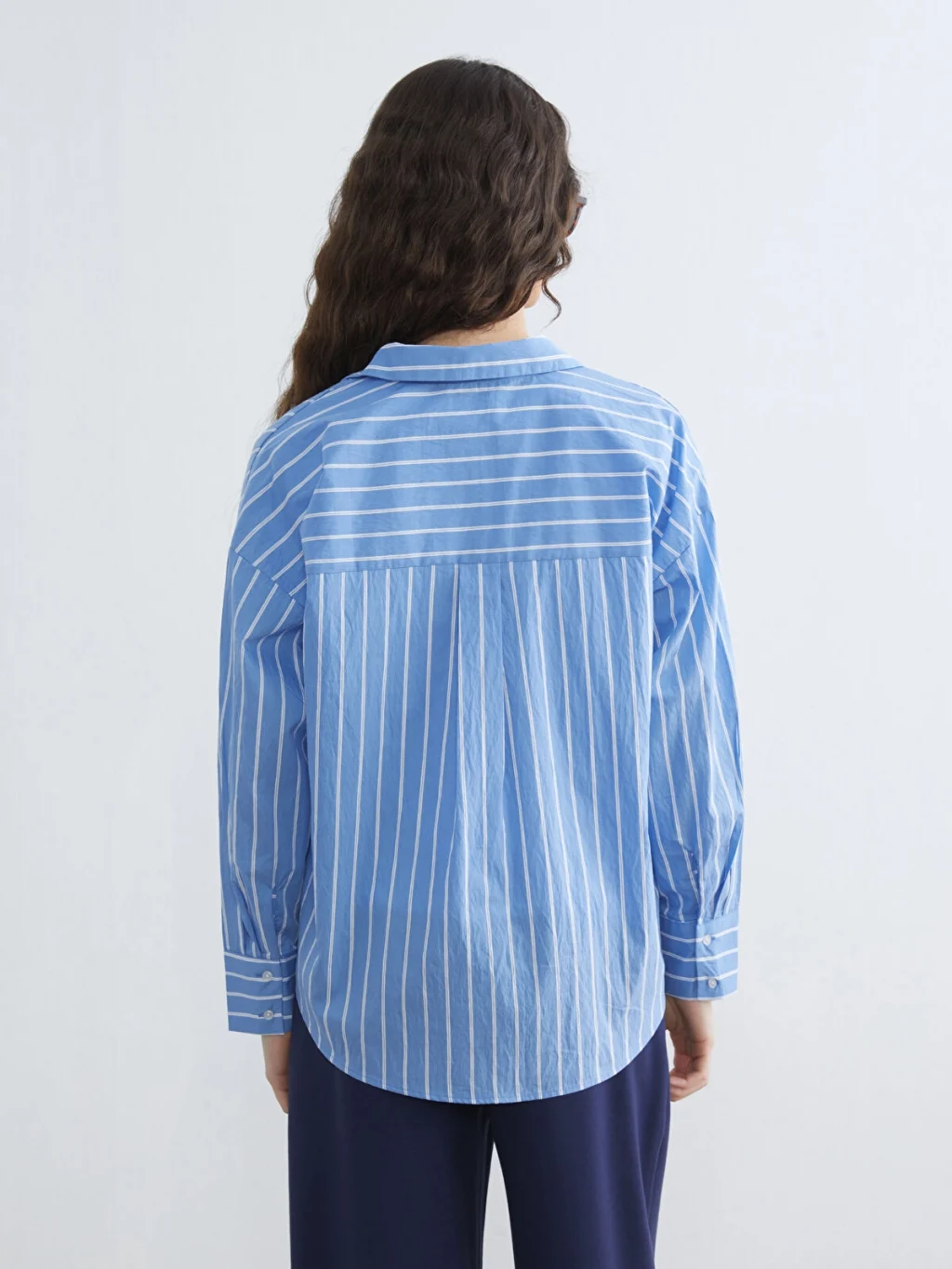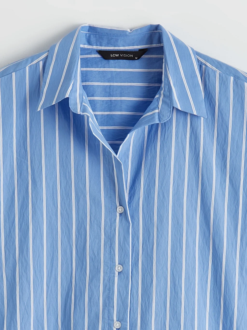 Yüksek pamuk içerikli, çizgili desenli, uzun kollu ve manşetli kadın gömlek, önden düğme kapamalıdır.