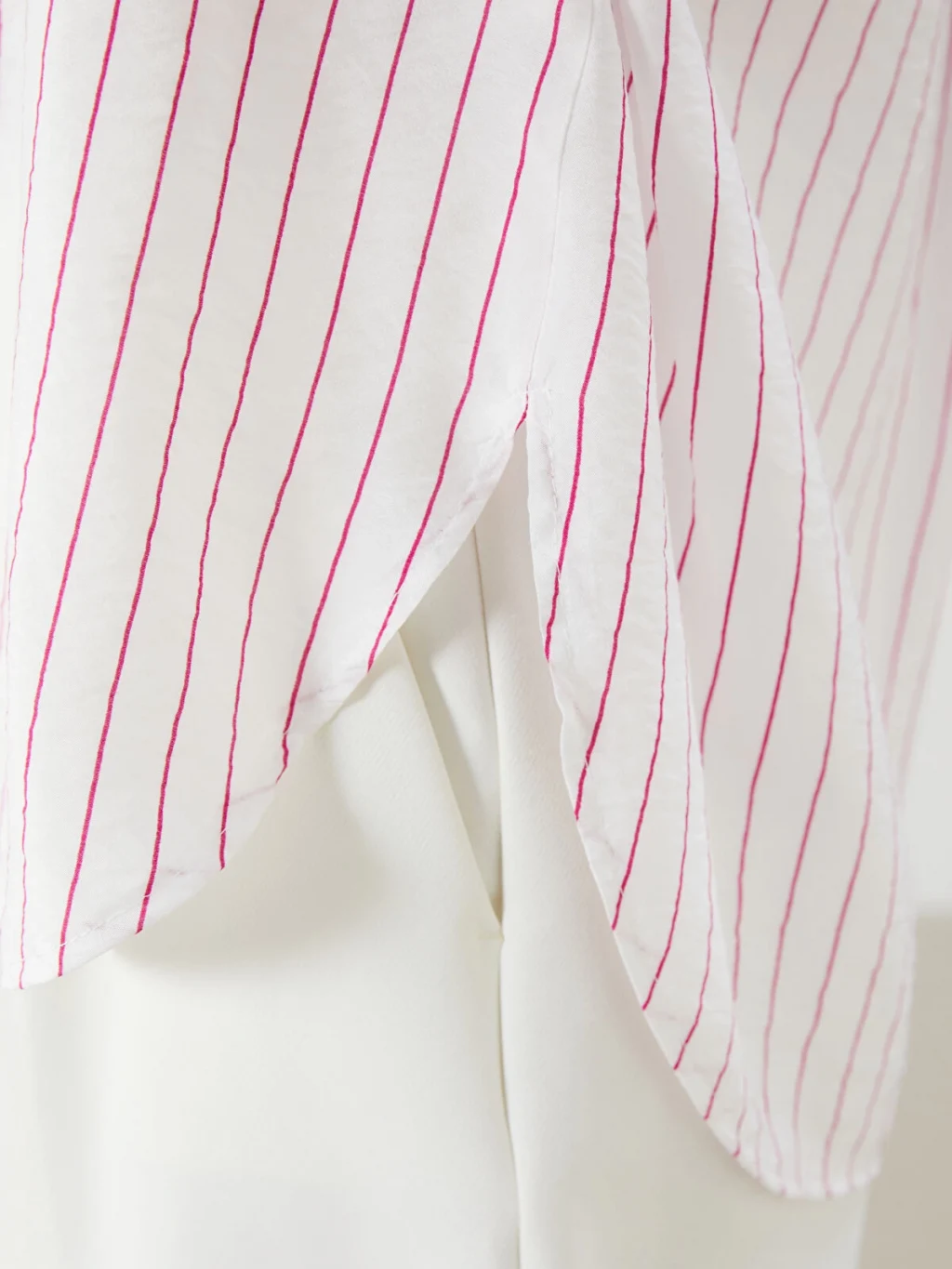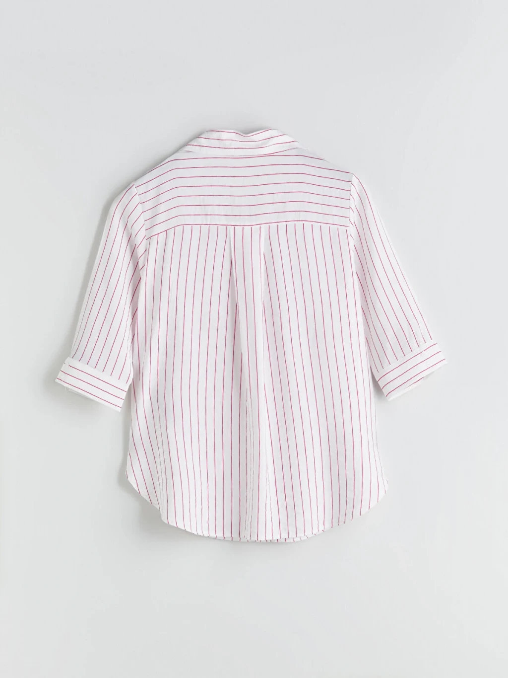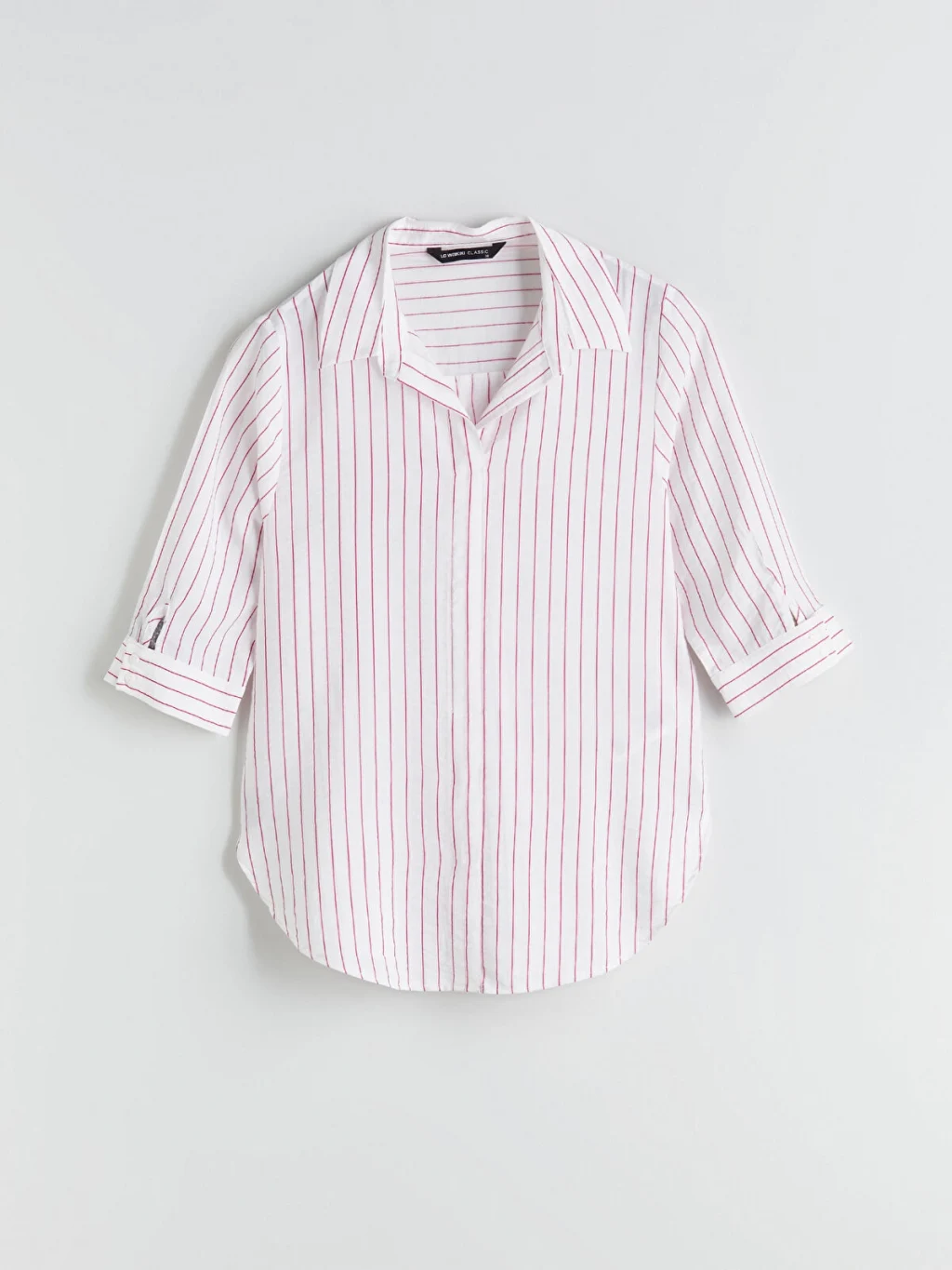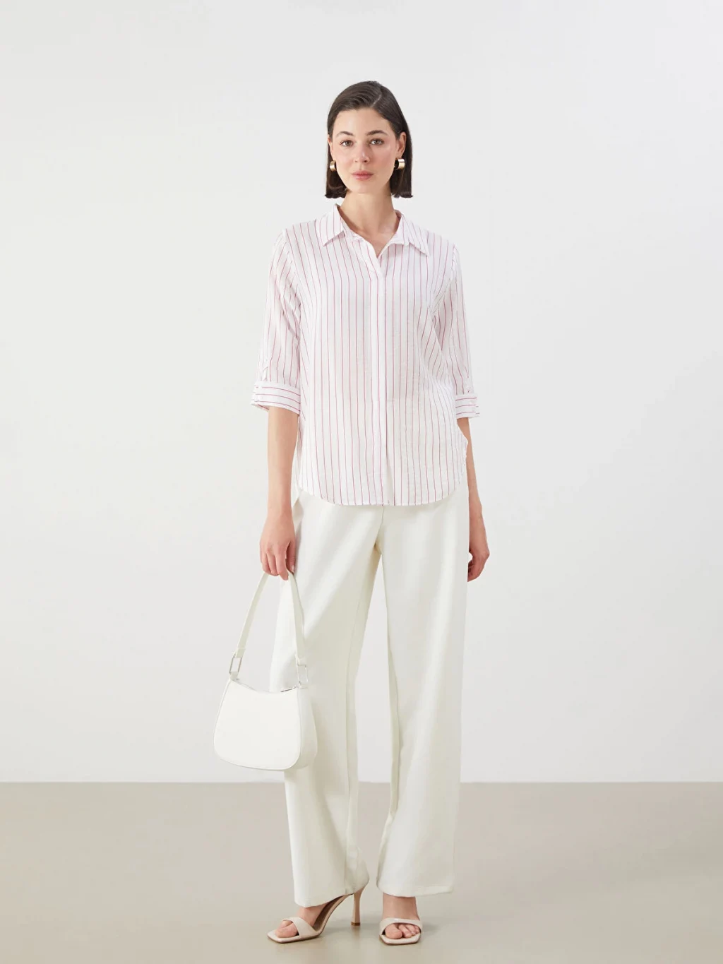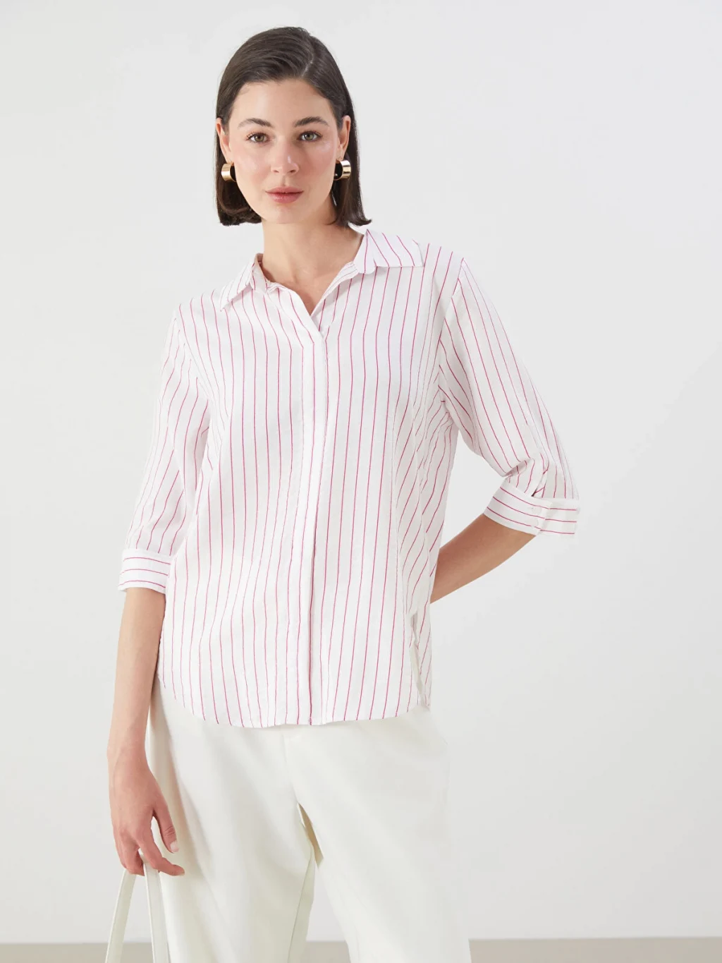 Çizgili kadın gömlek, viskoz karışımlı kumaştan üretilmiştir. Oval kesimdir. Gizli düğme kapamalı tasarıma sahiptir.
