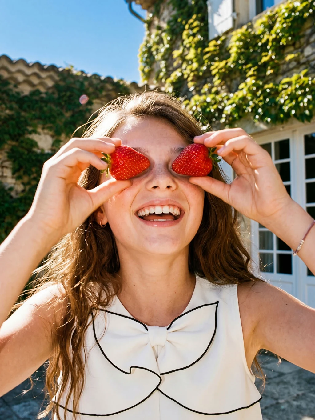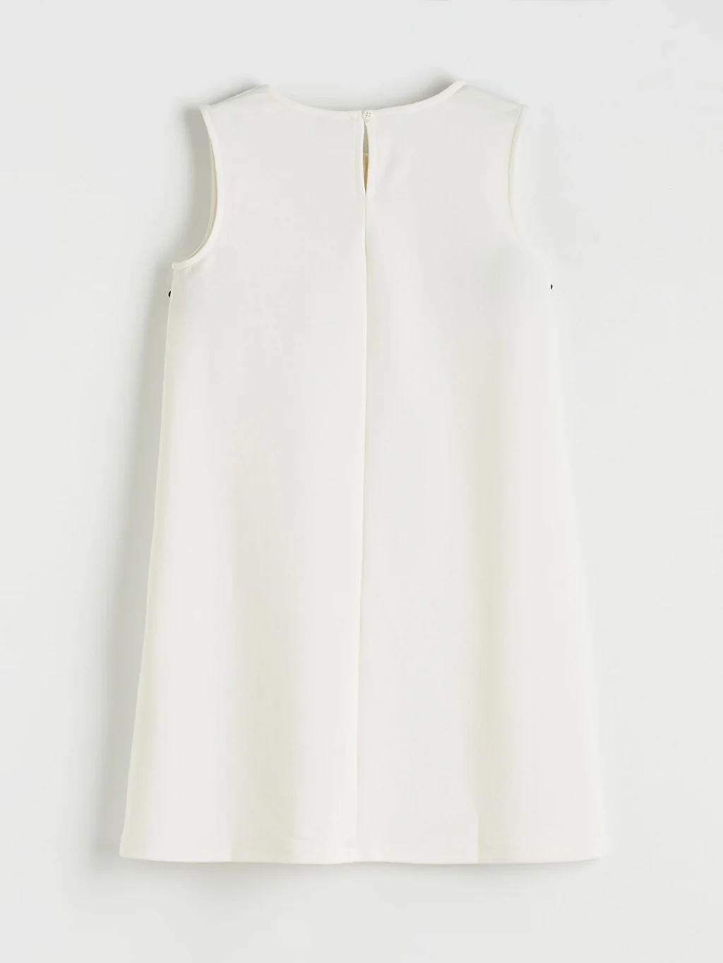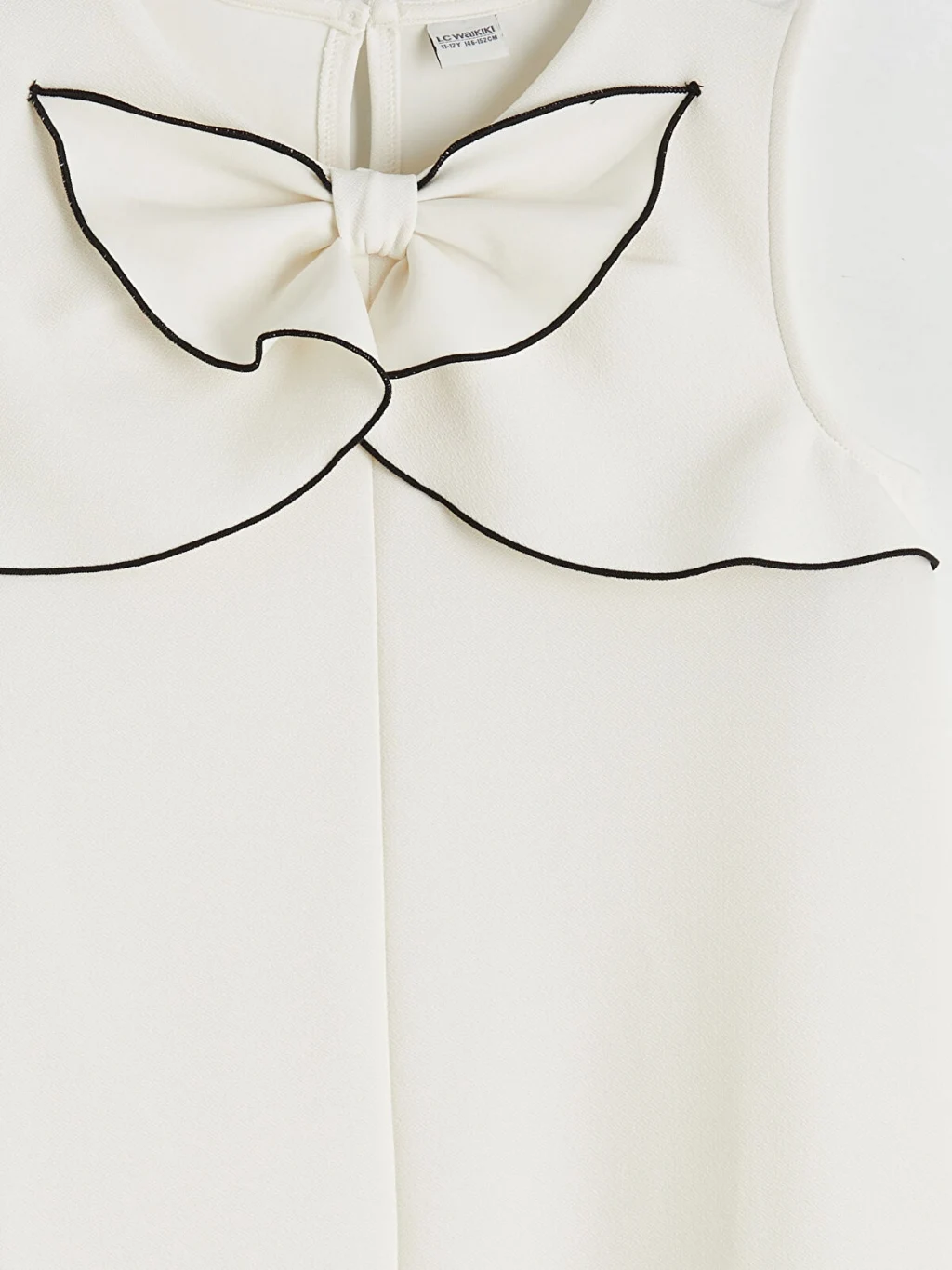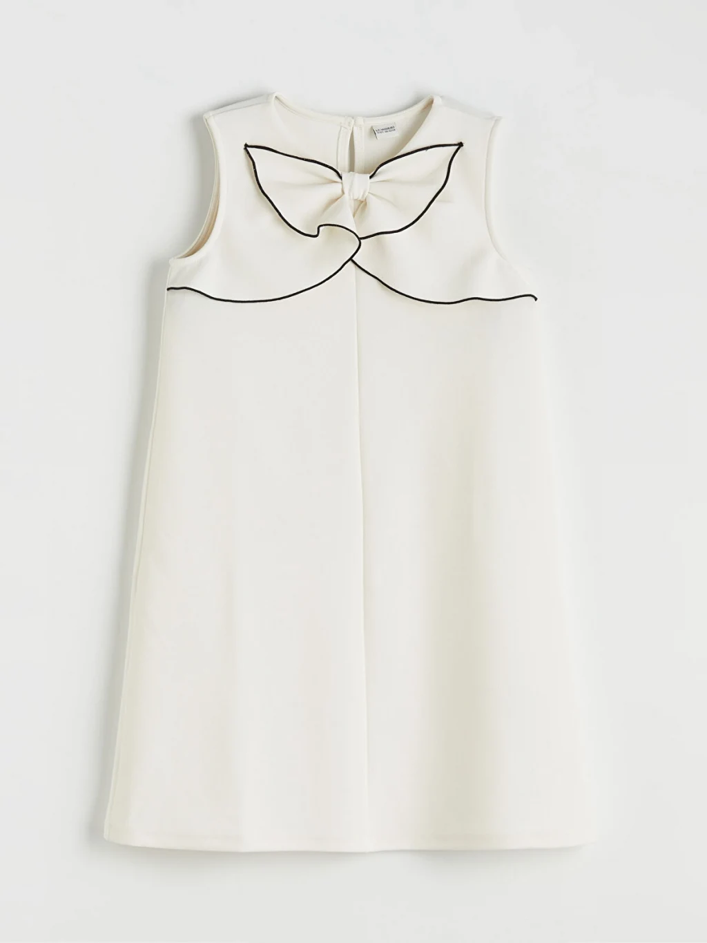 Bisiklet yaka ve kolsuz kız çocuk elbise, interlok kumaştan üretilmiştir. Göğüs kısmında fiyonk detayı bulunur ve enseden düğme kapamalıdır.