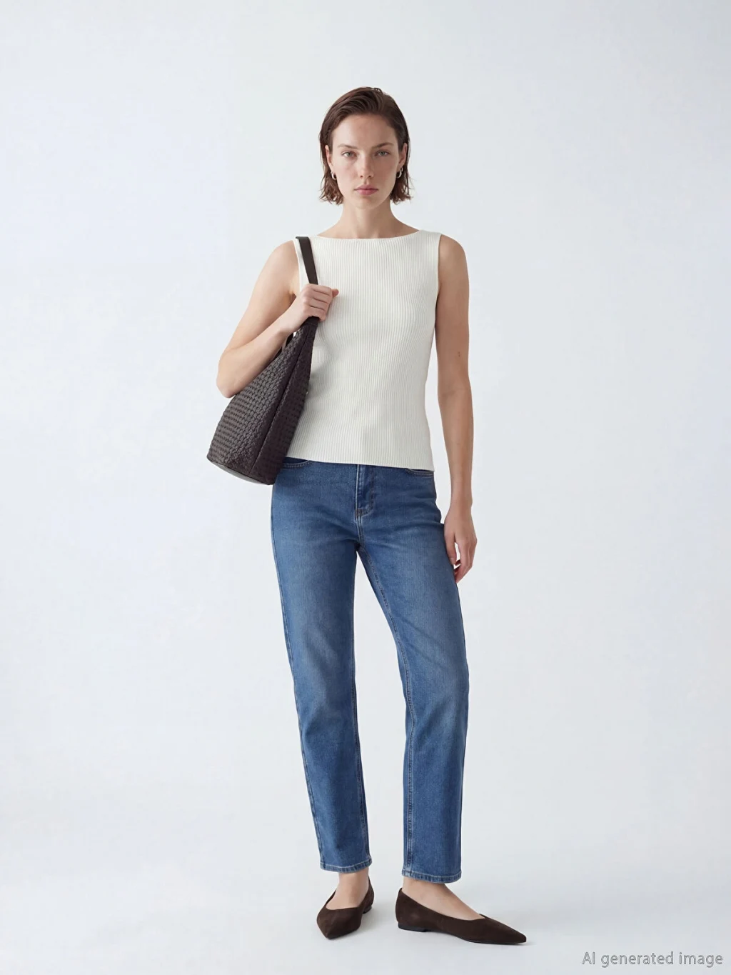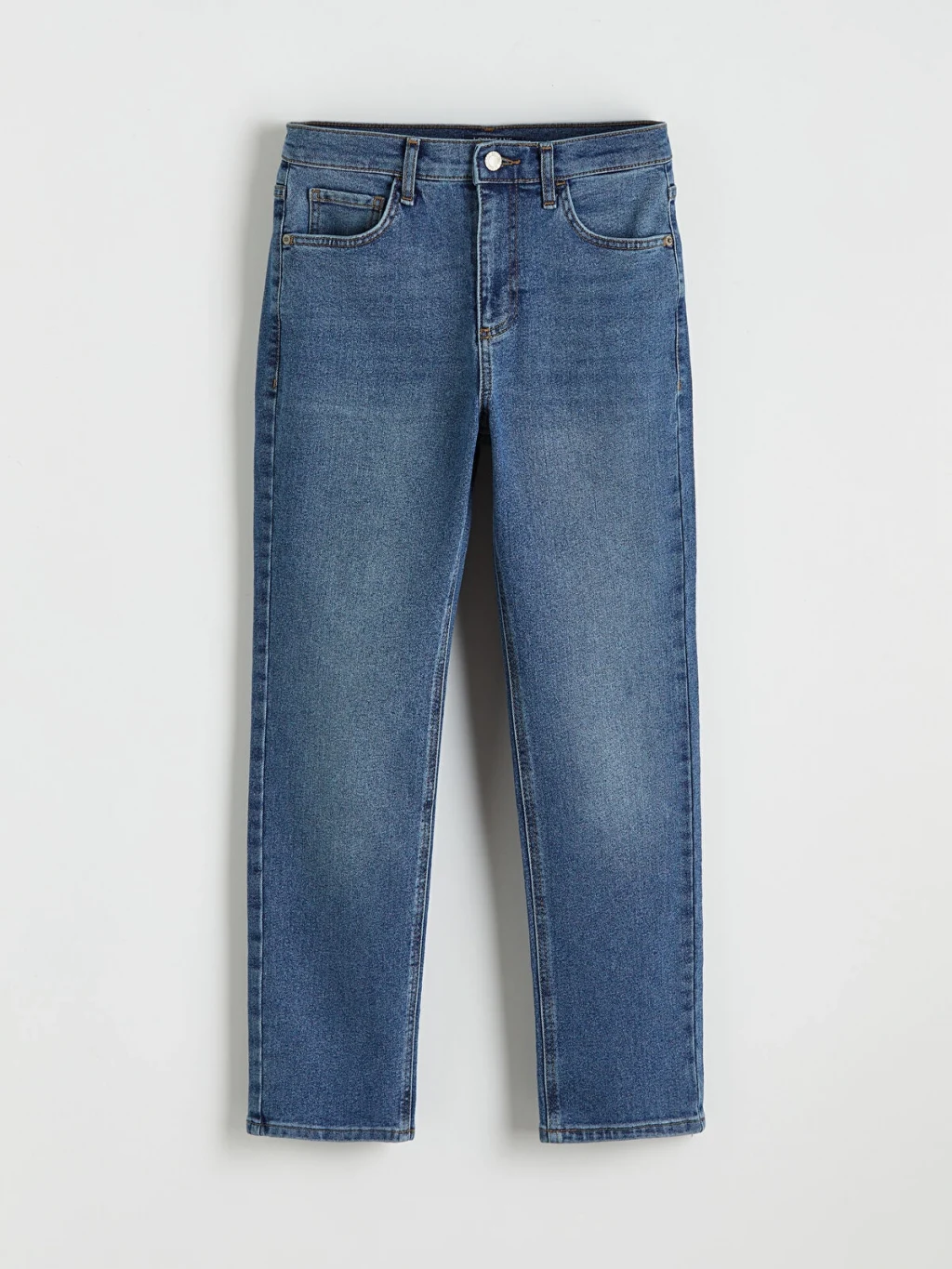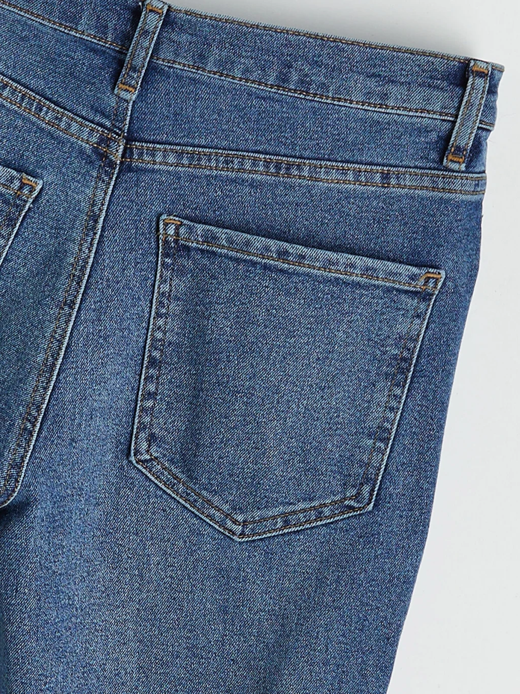 Yüksek bel, slim fit kadın jean pantolon, beş cepli tasarıma sahip olup fermuar ve düğme kapamalıdır.
