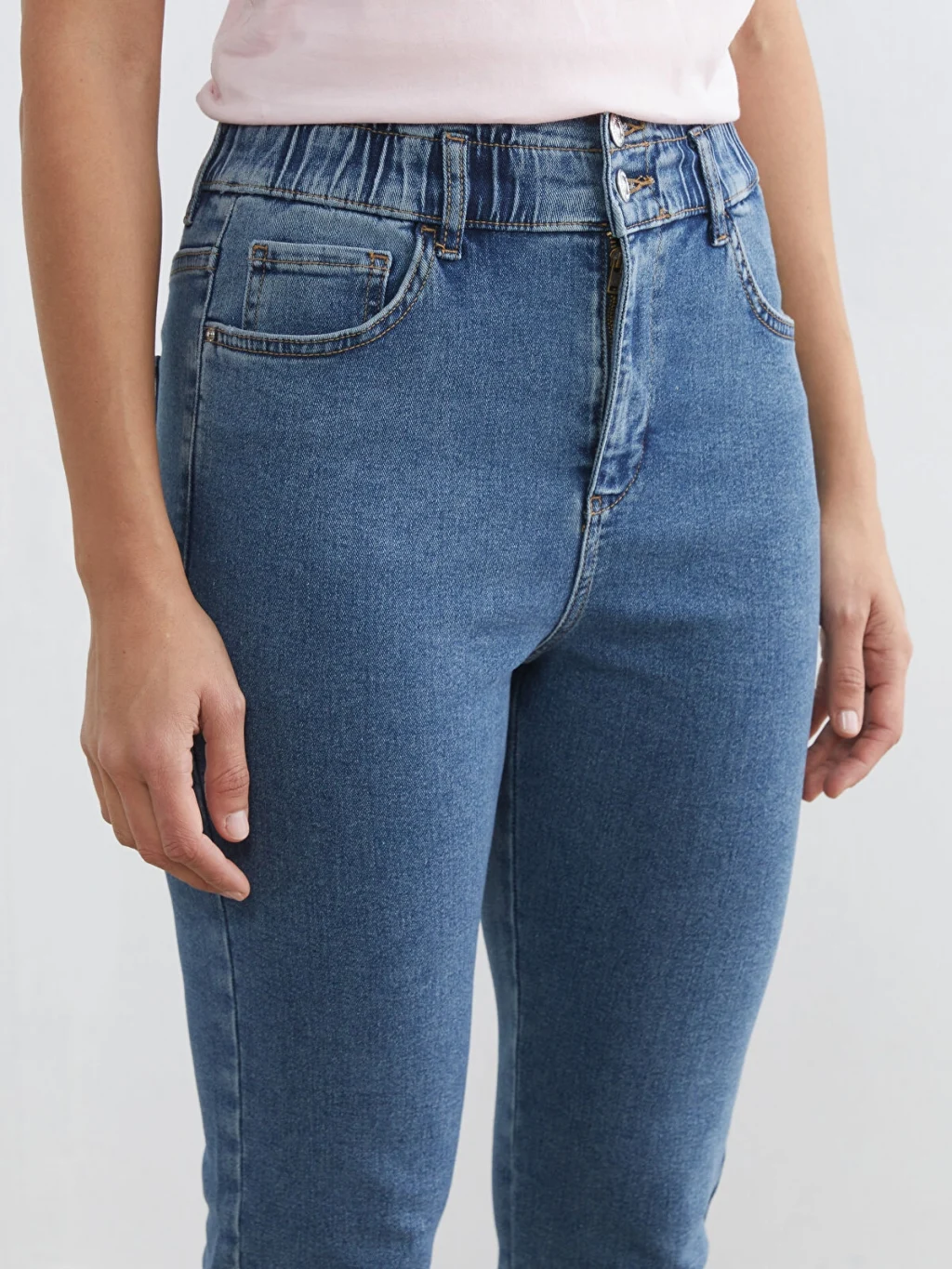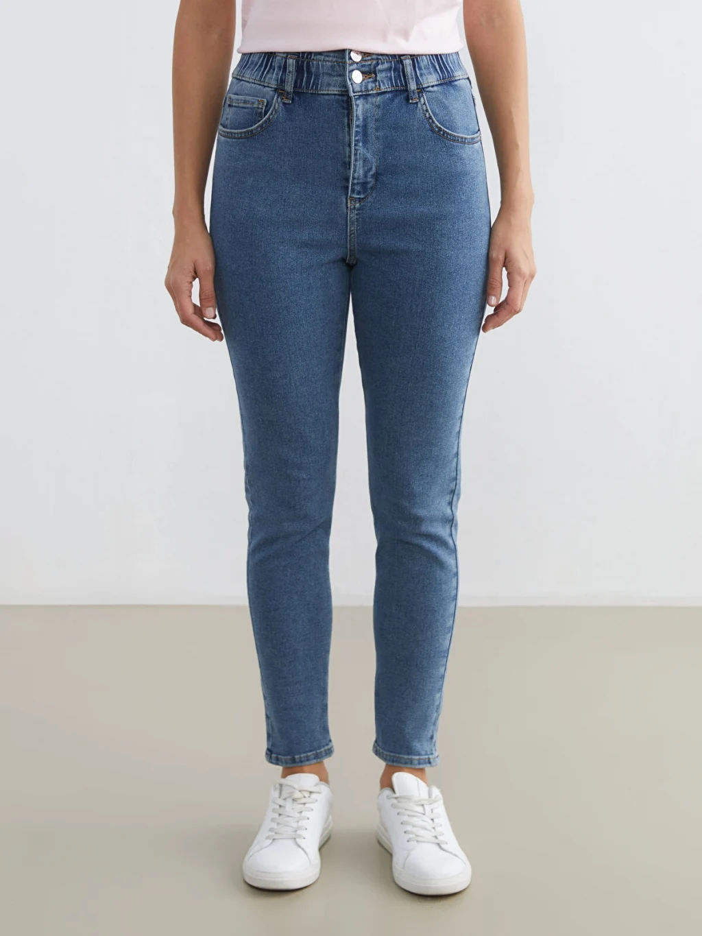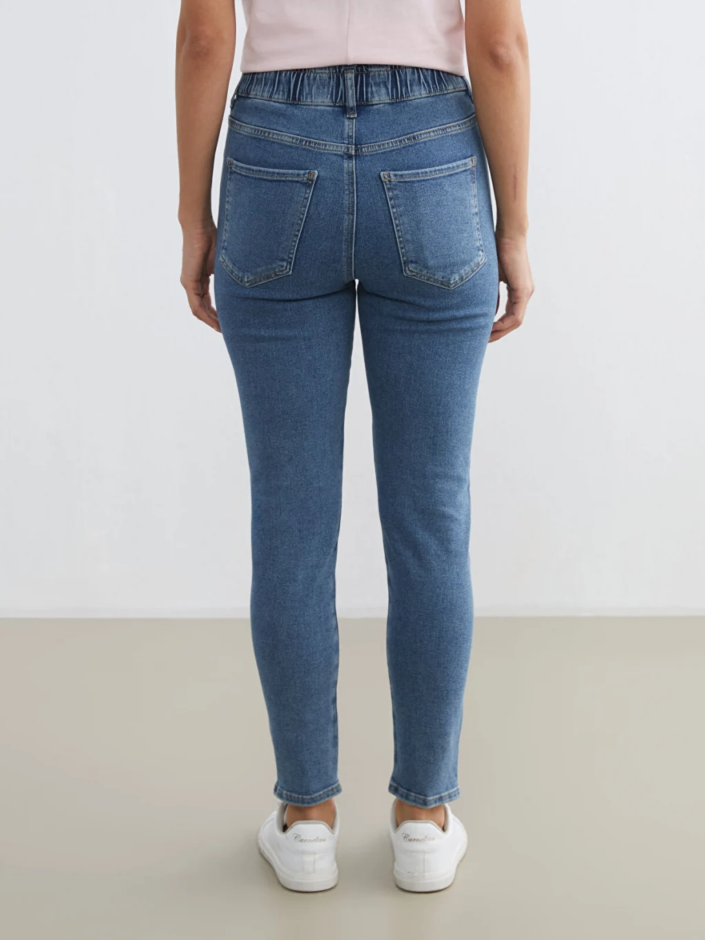 Yüksek pamuk içeren denim kumaştan üretilmiş kadın jean pantolon. Beli lastikli ve büzgülü tasarıma sahiptir, beş ceplidir ve fermuar ve düğme kapamalıdır.