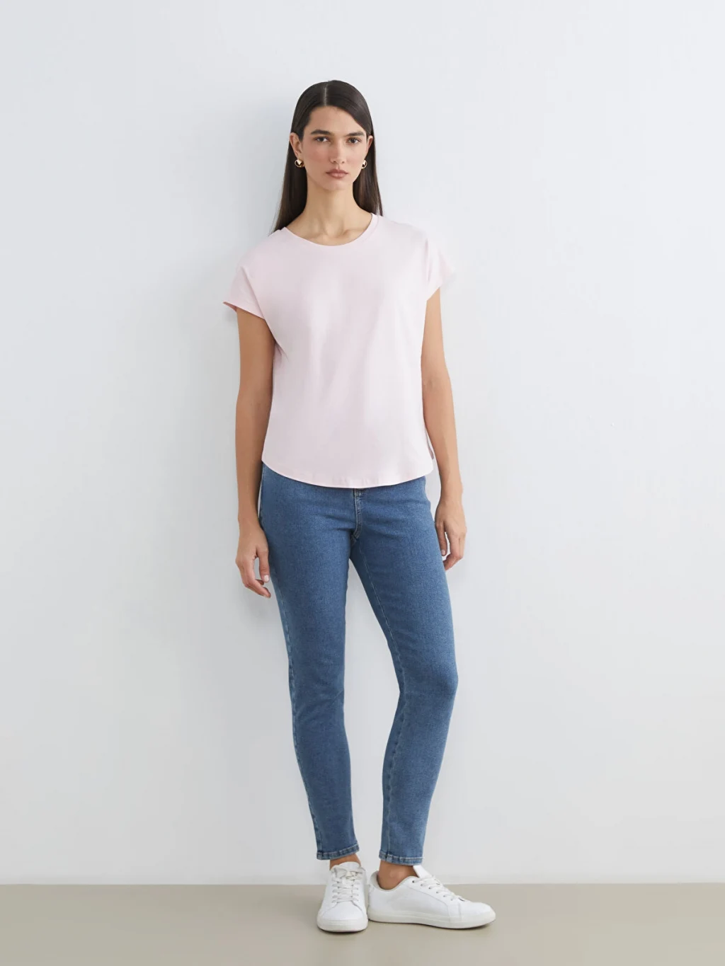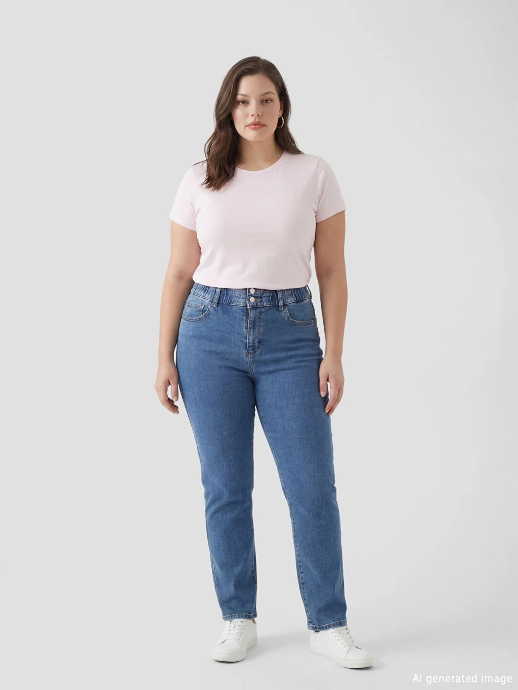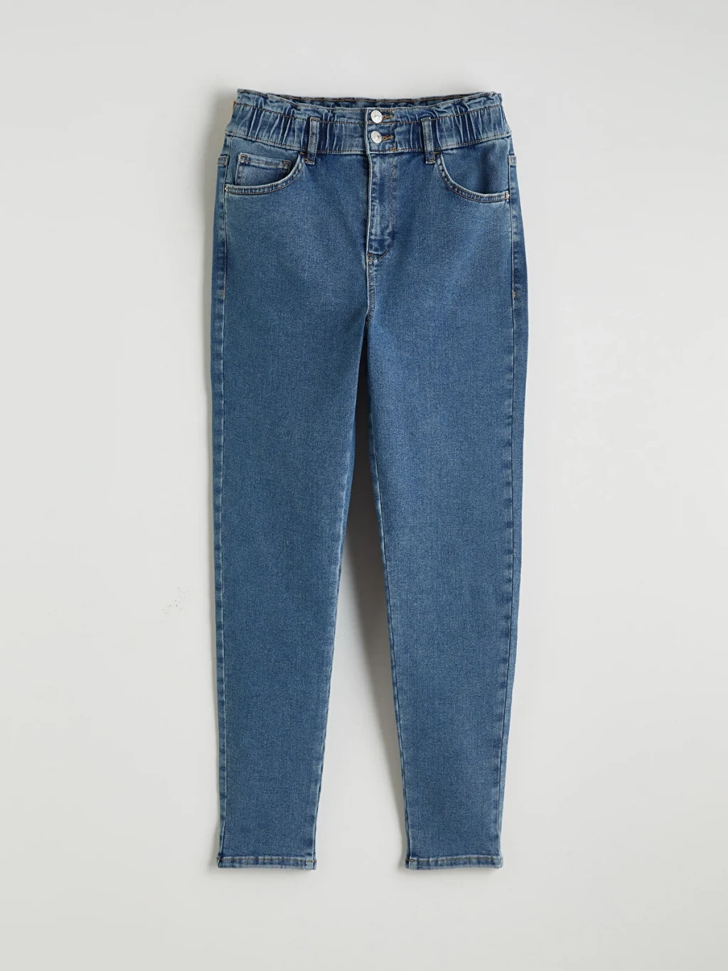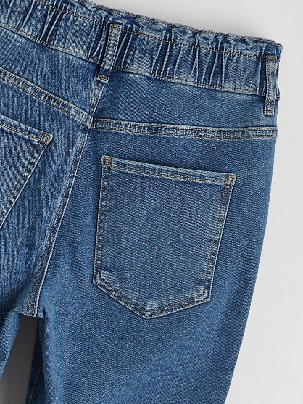 Yüksek pamuk içeren denim kumaştan üretilmiş kadın jean pantolon. Beli lastikli ve büzgülü tasarıma sahiptir, beş ceplidir ve fermuar ve düğme kapamalıdır.