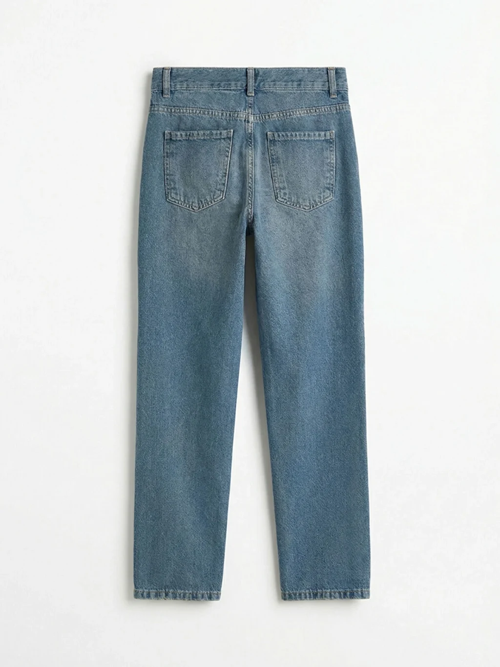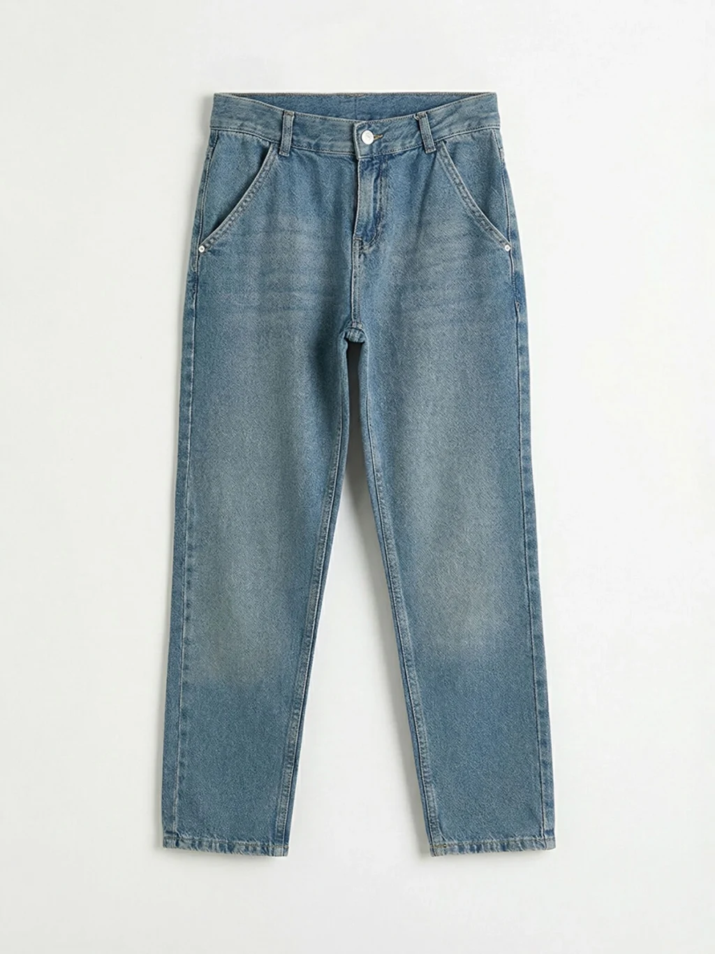 Standart kalıp erkek çocuk jean pantolon, pamuklu denim kumaştan üretilmiştir. Beş cepli tasarıma sahiptir ve fermuar ile düğme kapamalıdır.
