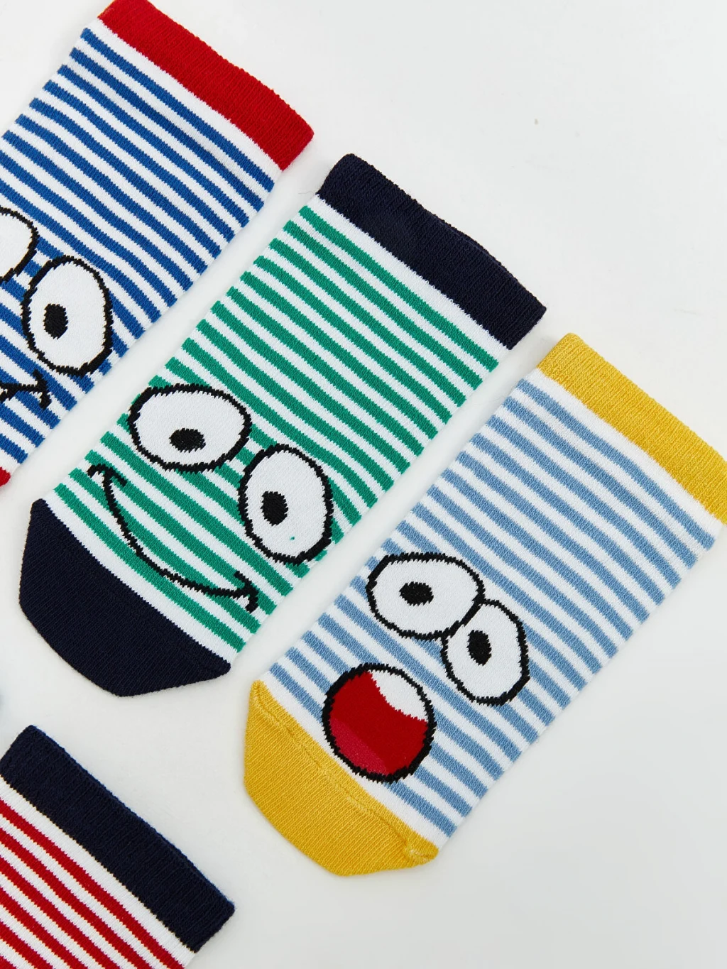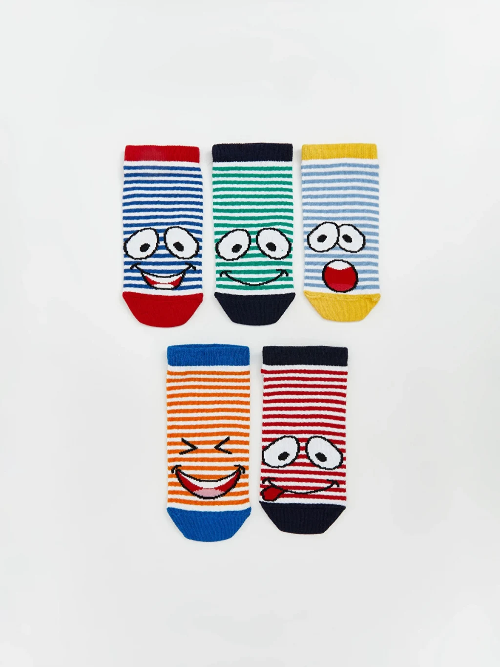 Erkek çocuk için beşli set halinde sunulan patik çoraplar, çizgili desene ve surat figürlerine sahiptir.
