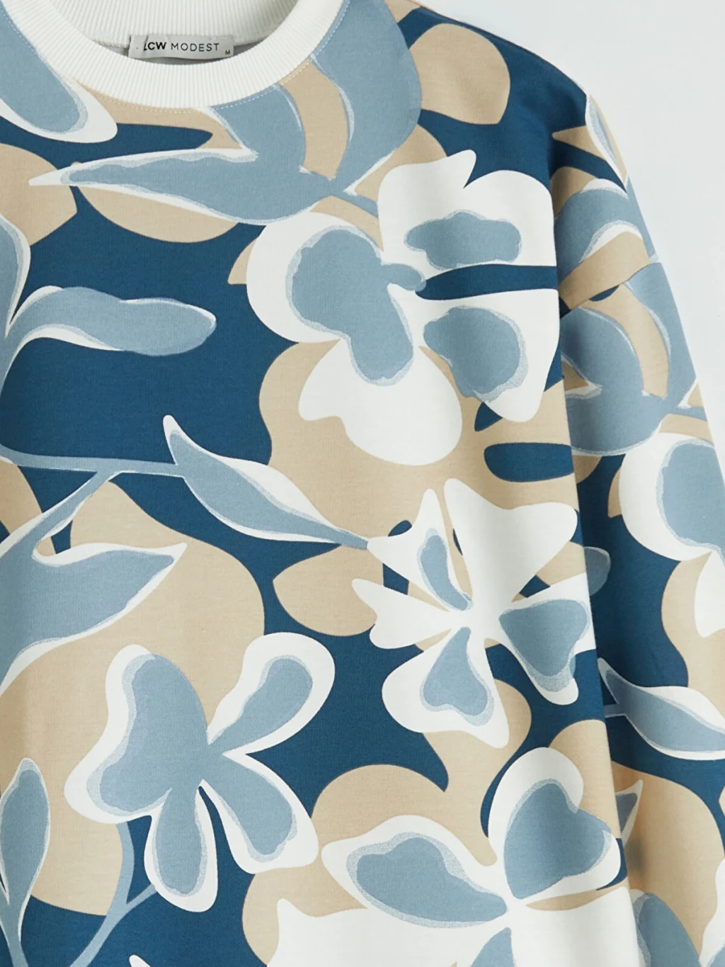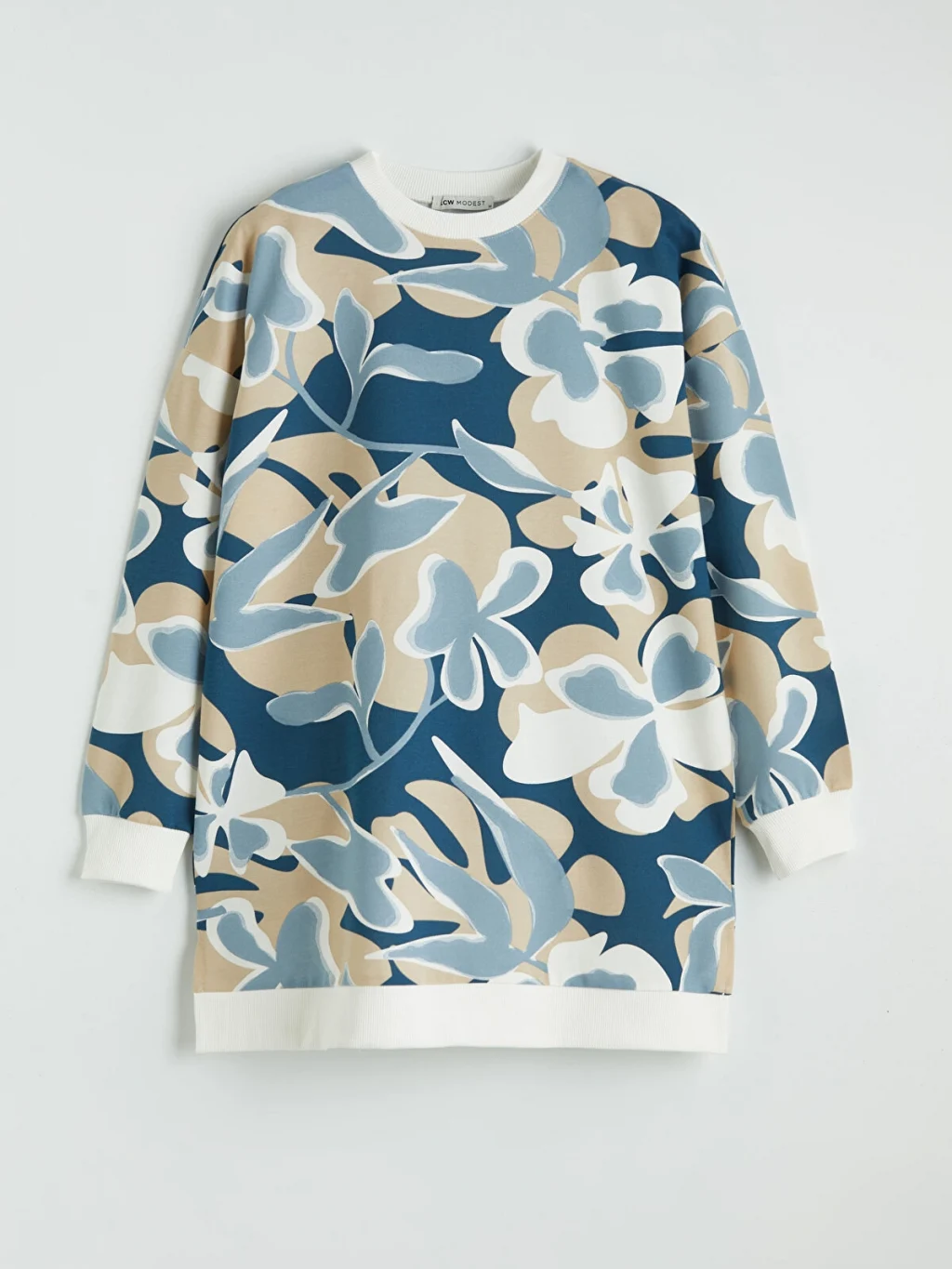 Bisiklet yaka ve uzun kollu kadın sweatshirt tunik, desenli 2 iplik kumaştan üretilmiştir. Kol uçları ve etek ucu ribanalıdır.