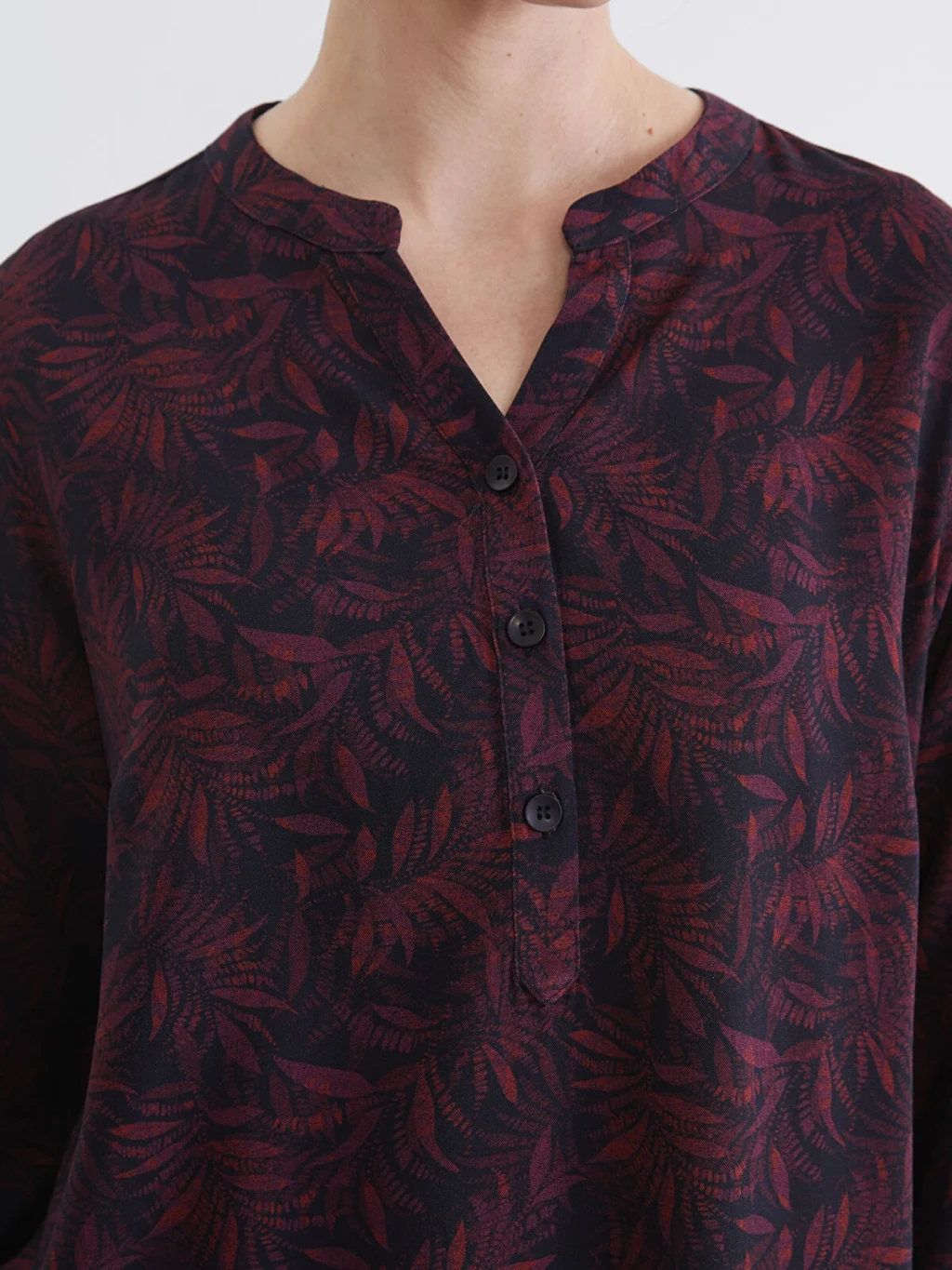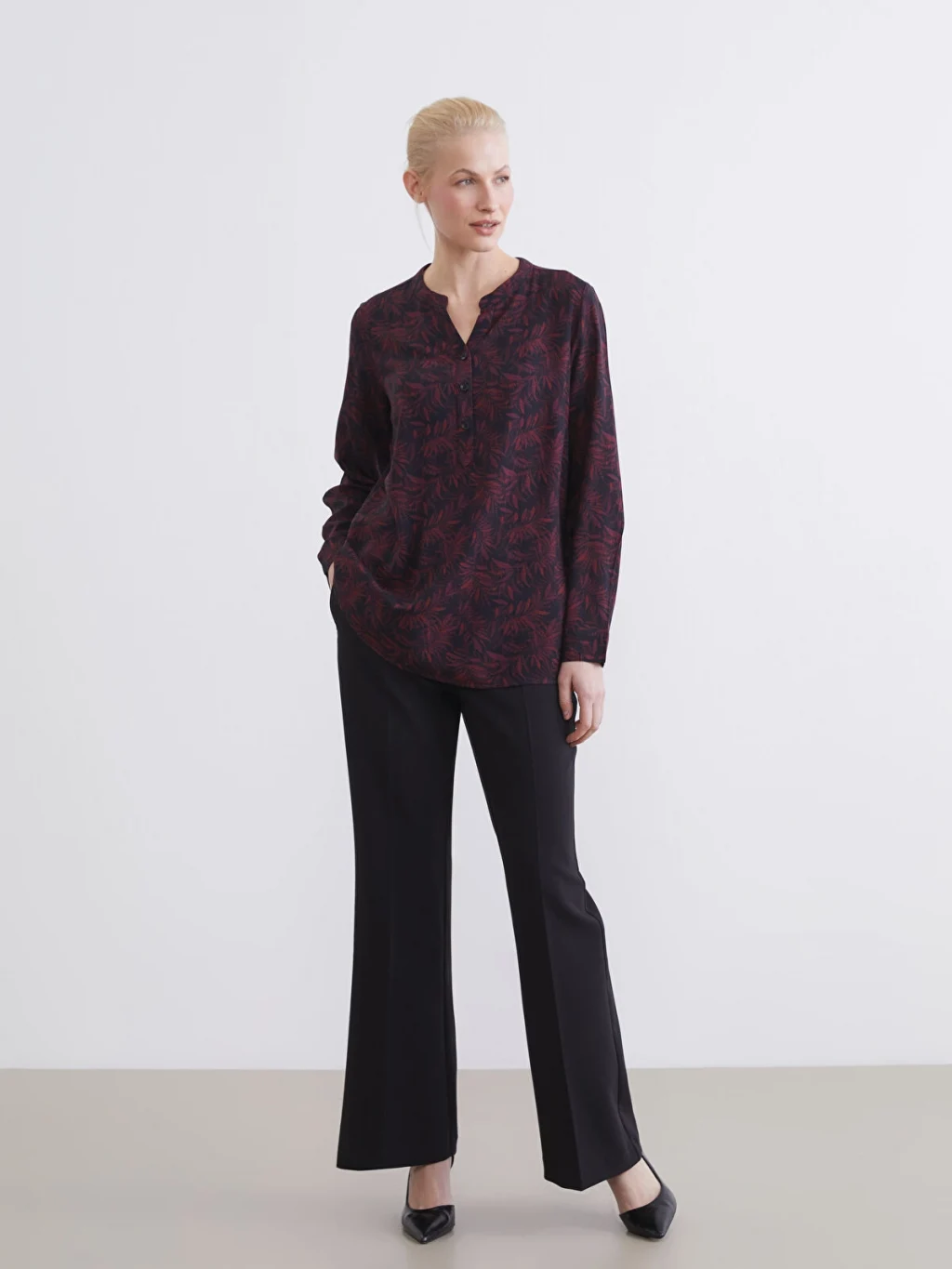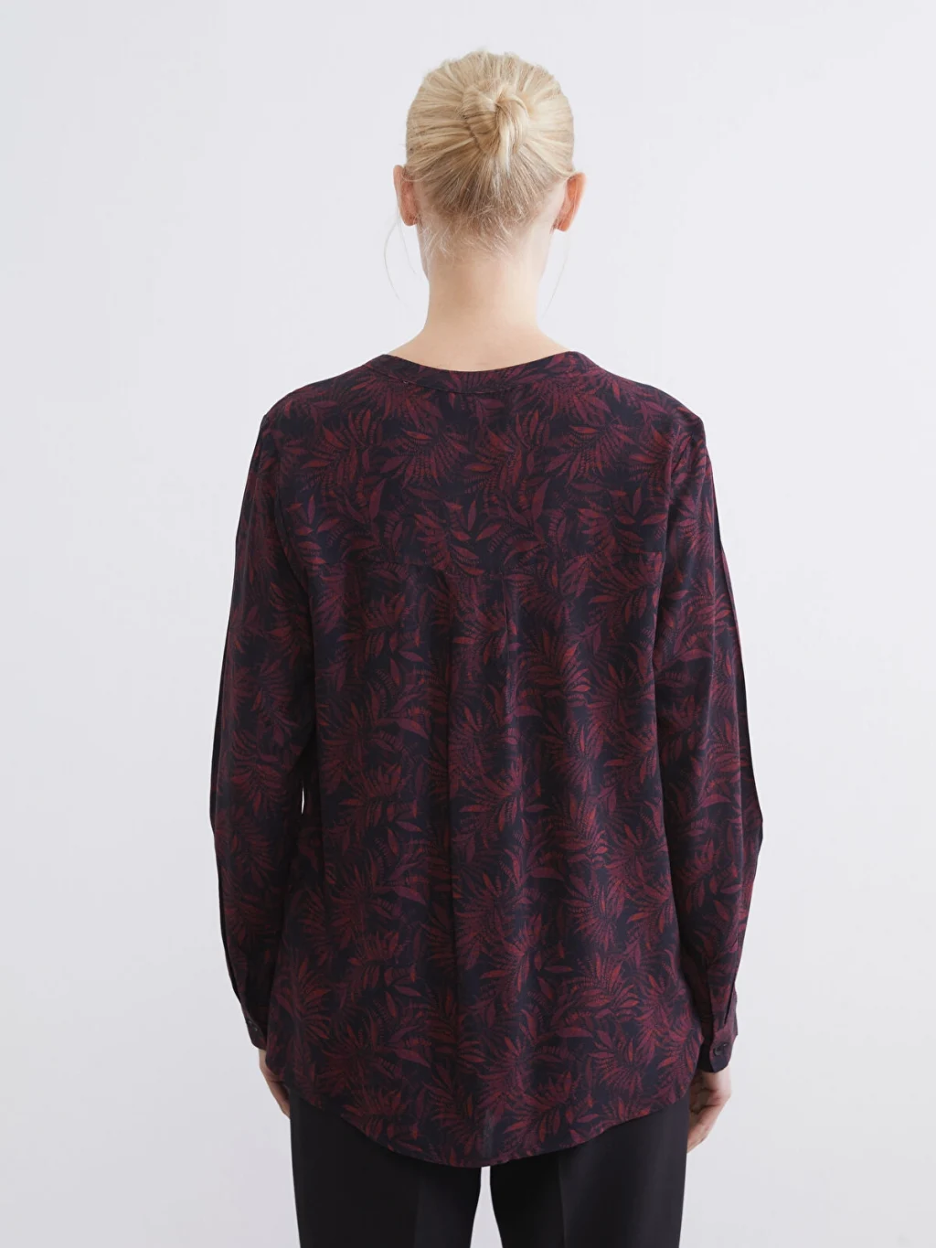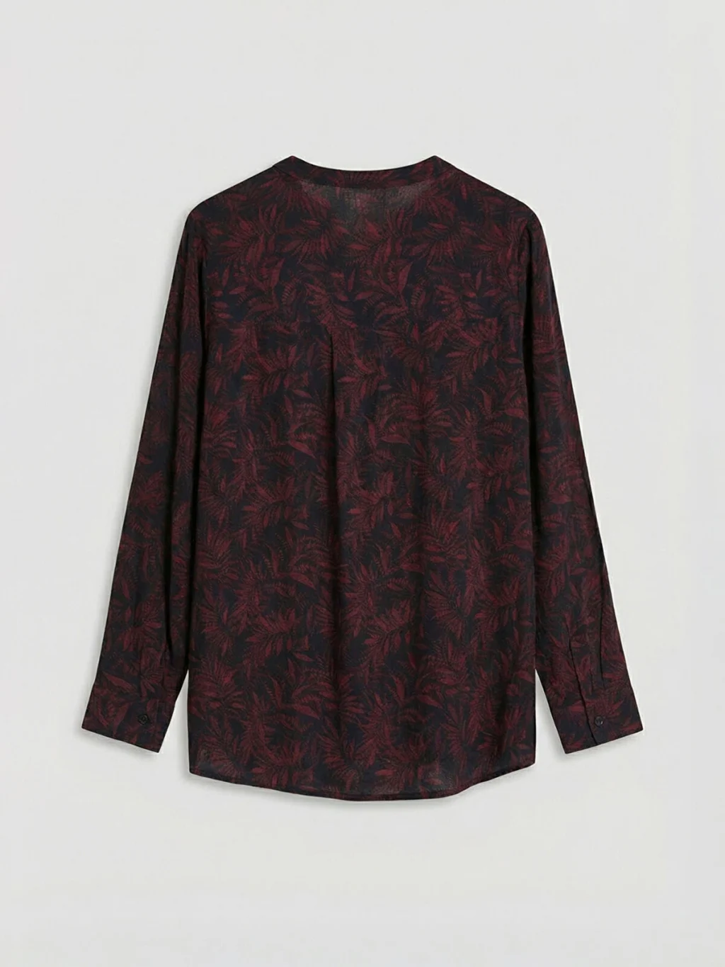 Kaçık yakalı ve uzun kollu kadın bluz, desenli kumaştan üretilmiştir ve önü yarım patlı düğme kapamalıdır.