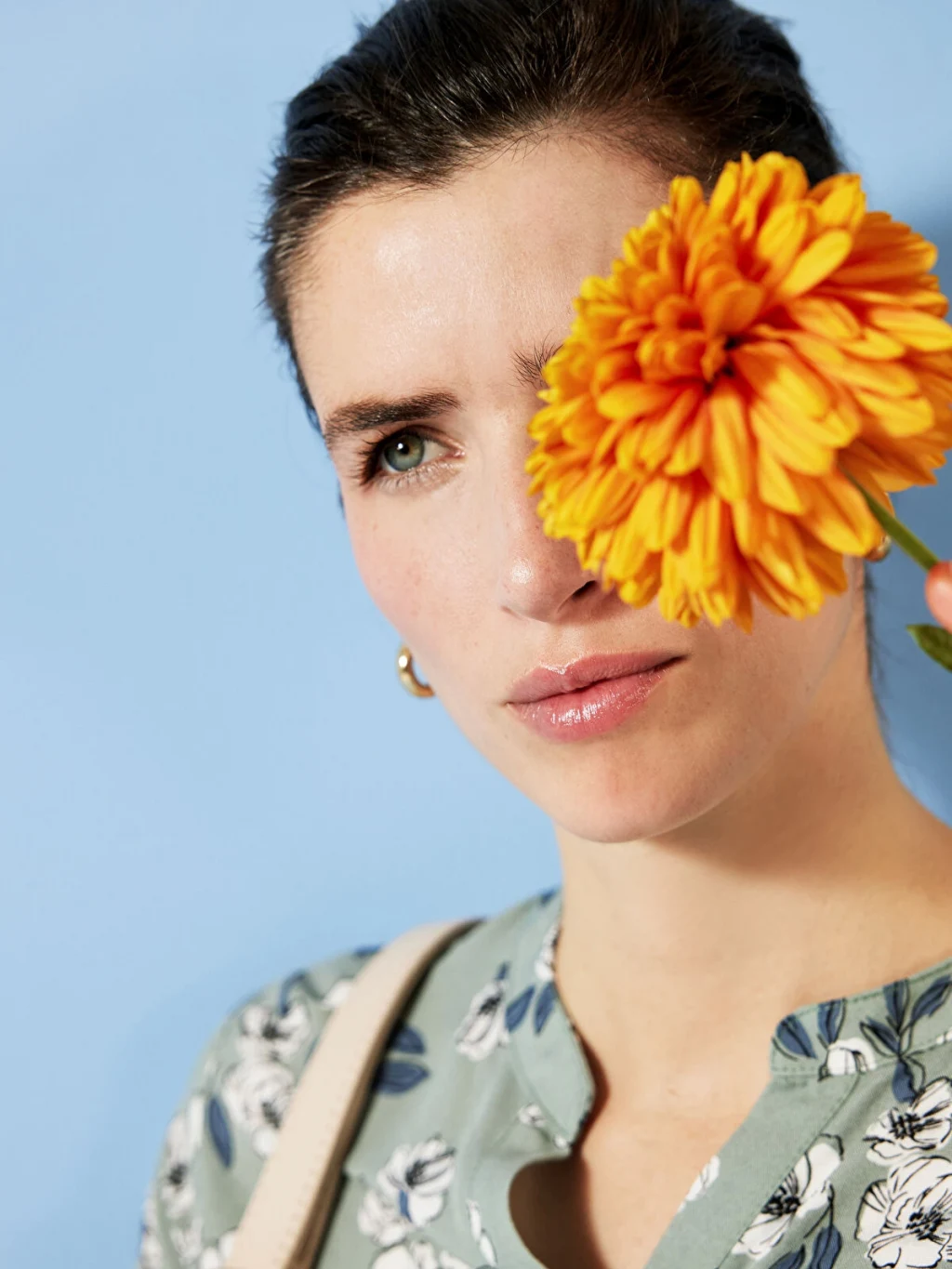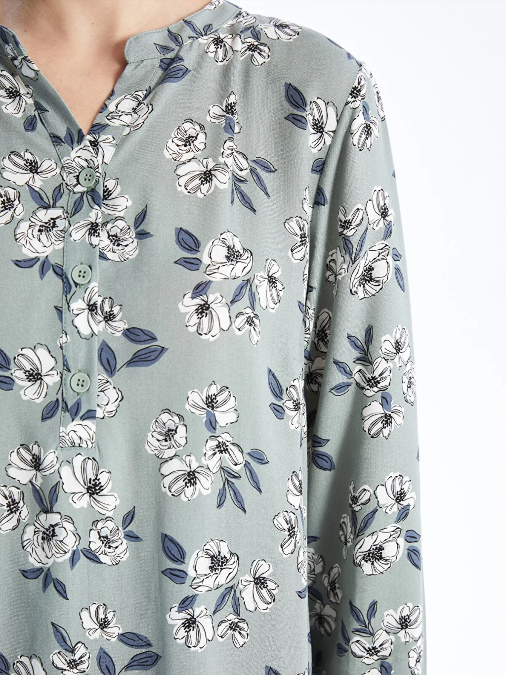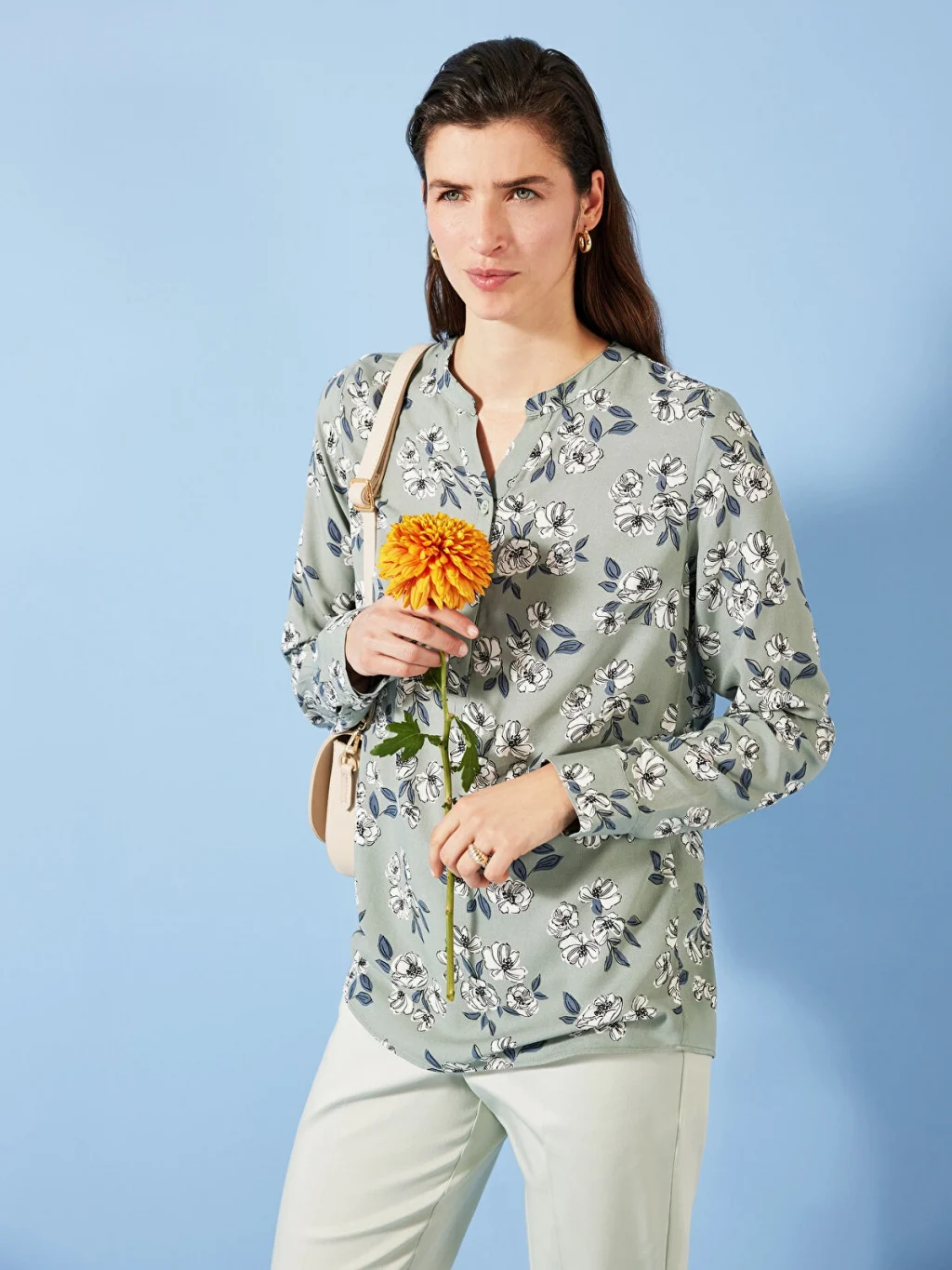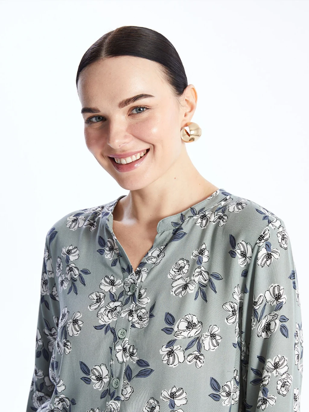 Desenli kadın bluz, yumuşak ve hafif viskon kumaşıyla günlük giyim için ideal bir seçenek sunar. Önden düğme kapamalı tasarımı, şıklık ve konforu birleştirerek stilinizi kusursuz bir biçimde tamamlar.