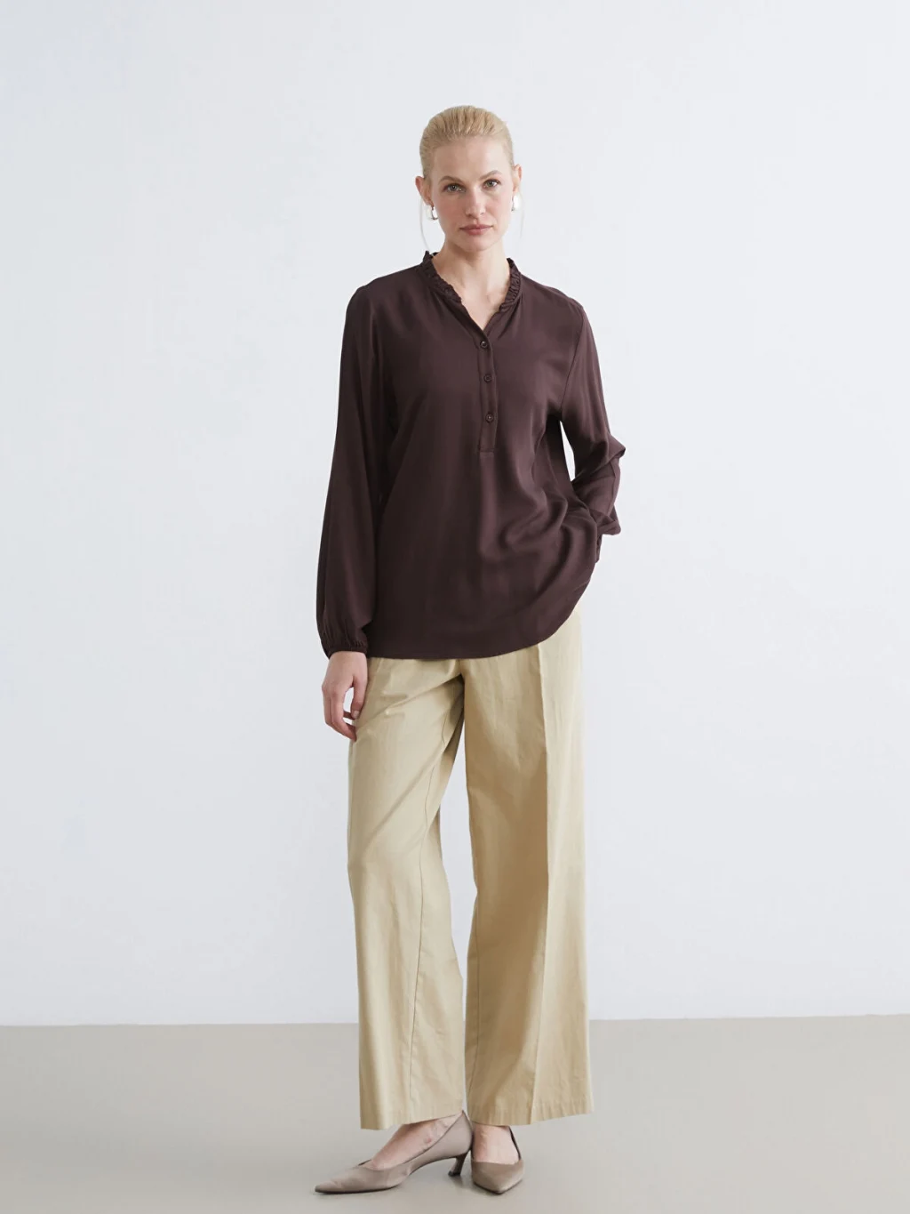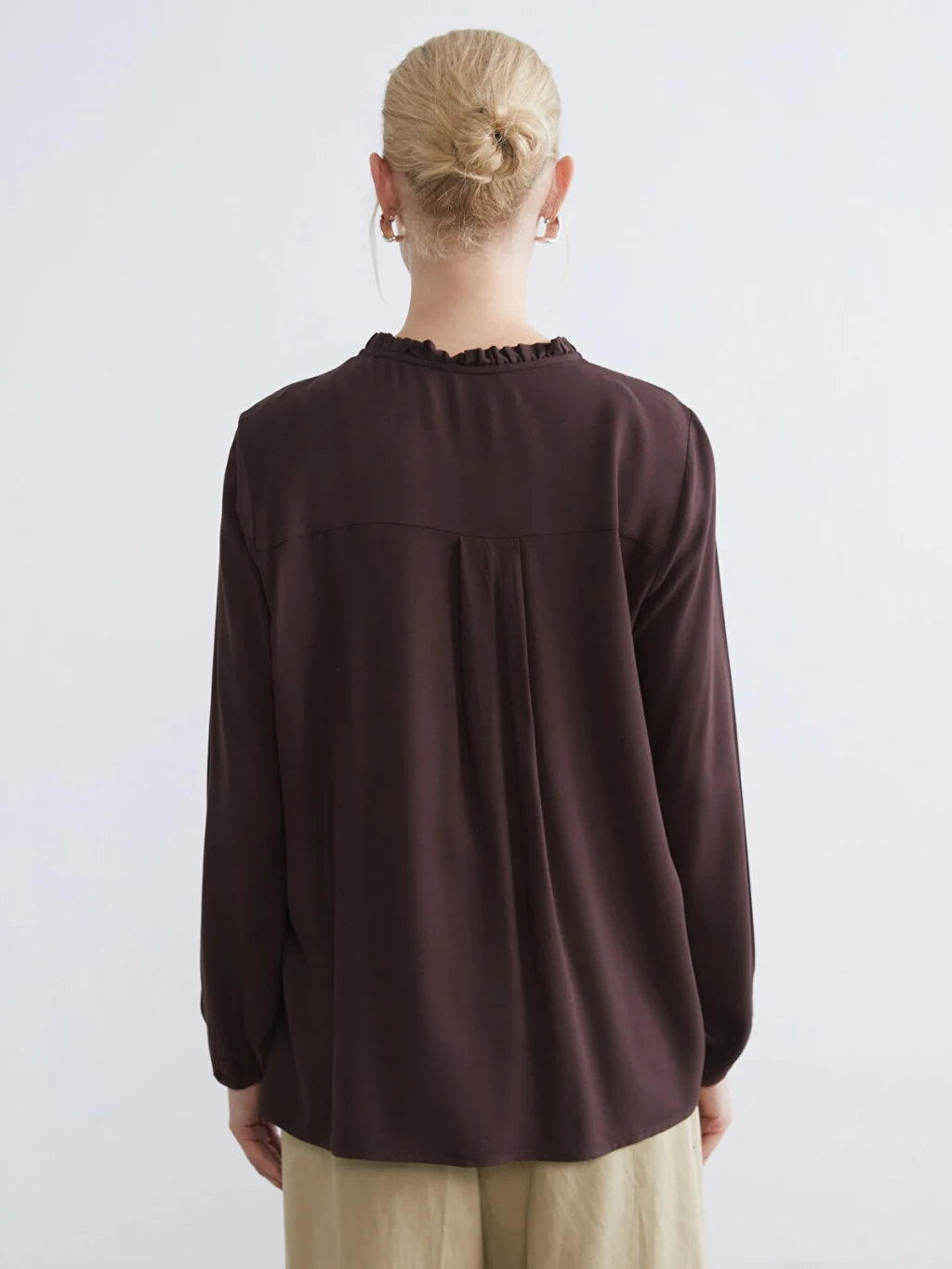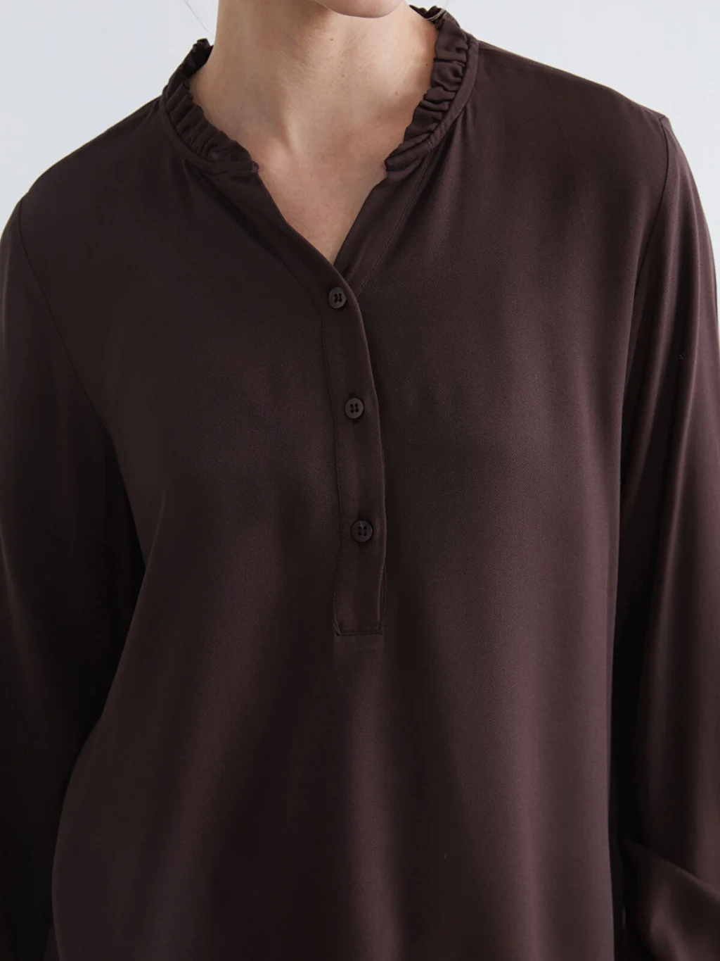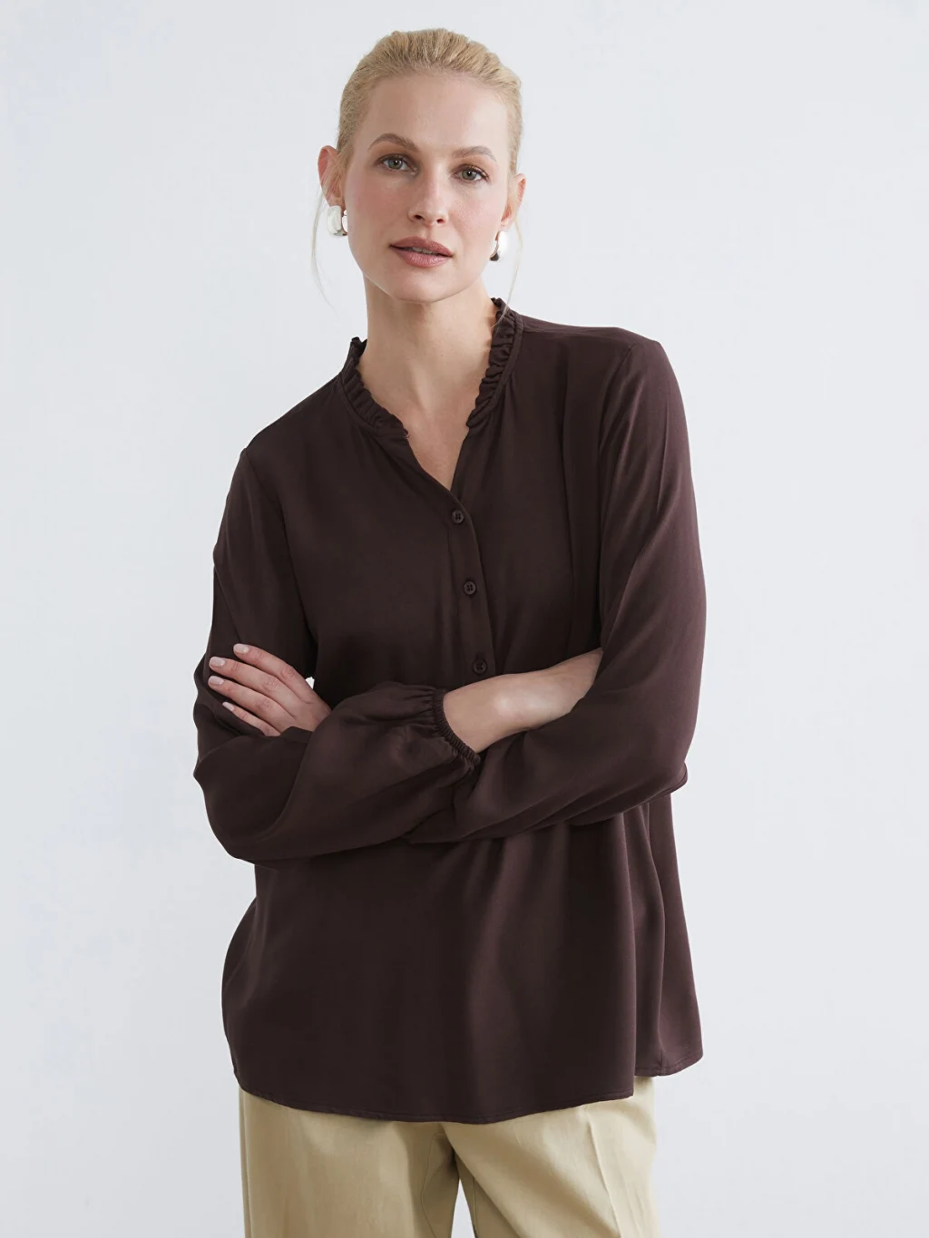 Yakası fırfır detaylı, uzun kollu ve manşetleri büzgülü kadın bluz, önden düğme kapamalıdır.