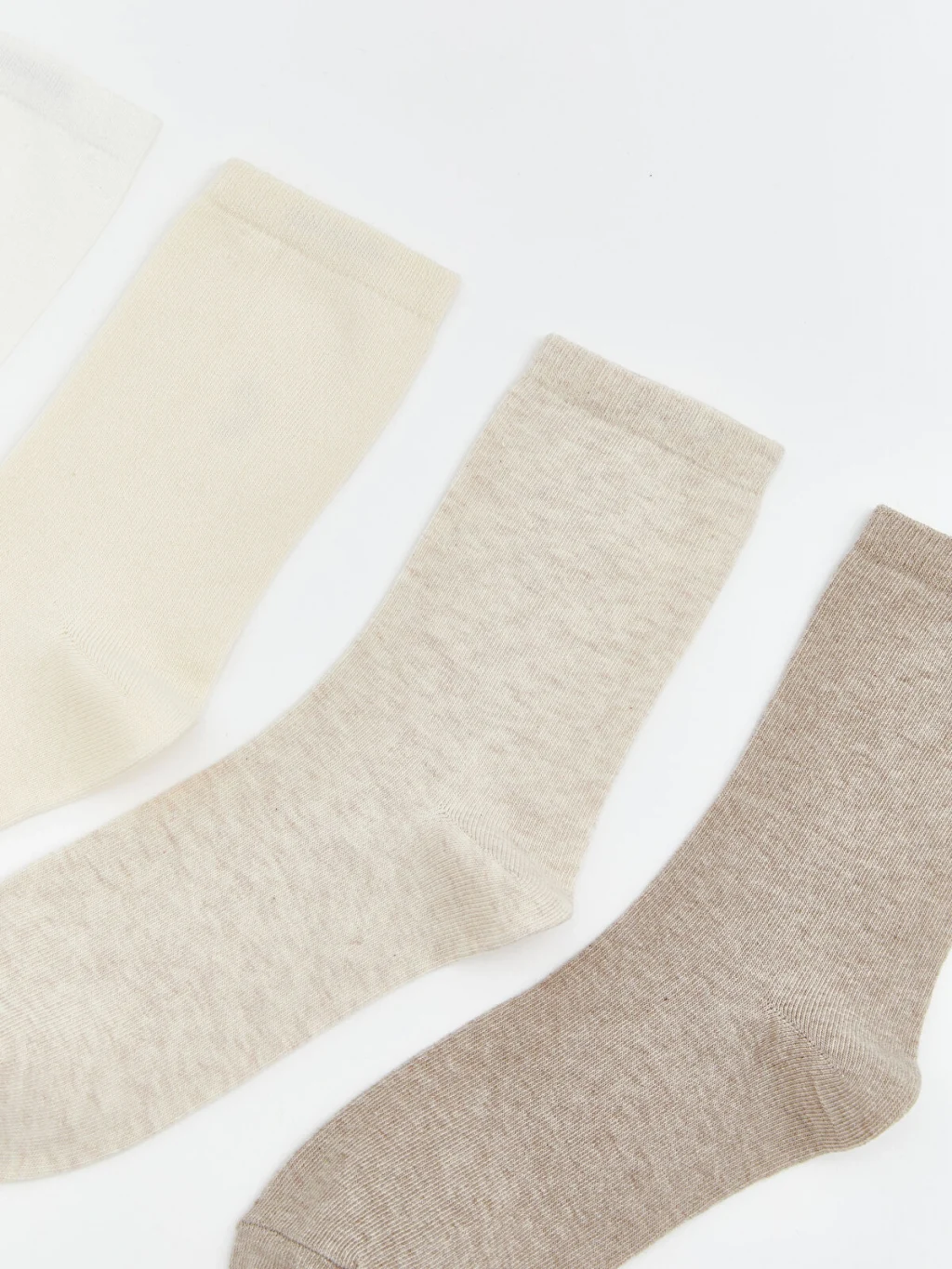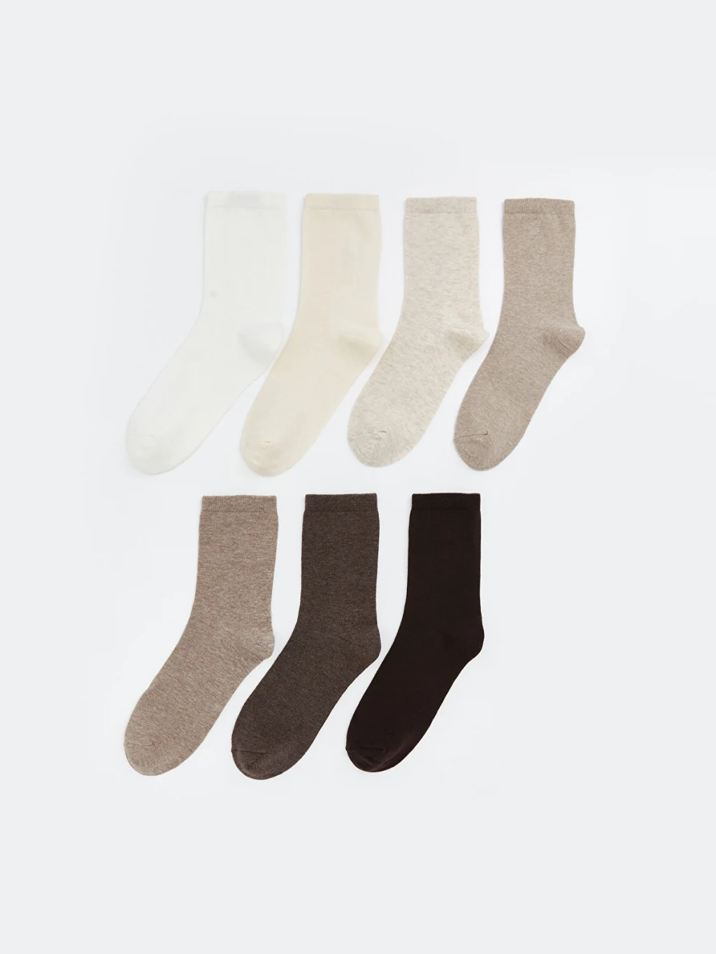 7'li paket halinde sunulan kadın soket çorap, düz ve desensiz kumaşa sahiptir ve bilek kısmı ribana detaylıdır.