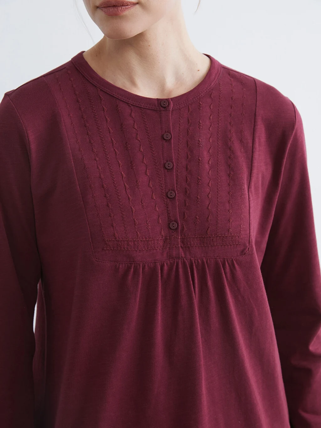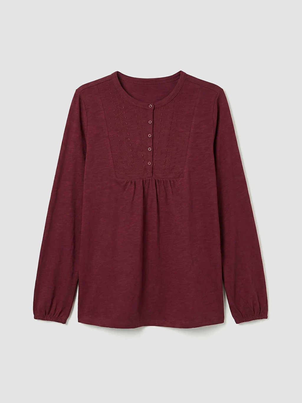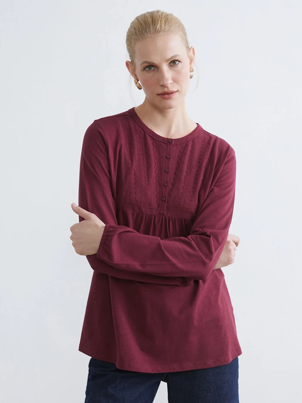 Bisiklet yakalı, uzun kollu kadın bluz, yarım pat düğme kapamalıdır. Göğüs altından büzgülü olup, kol uçları lastiklidir.