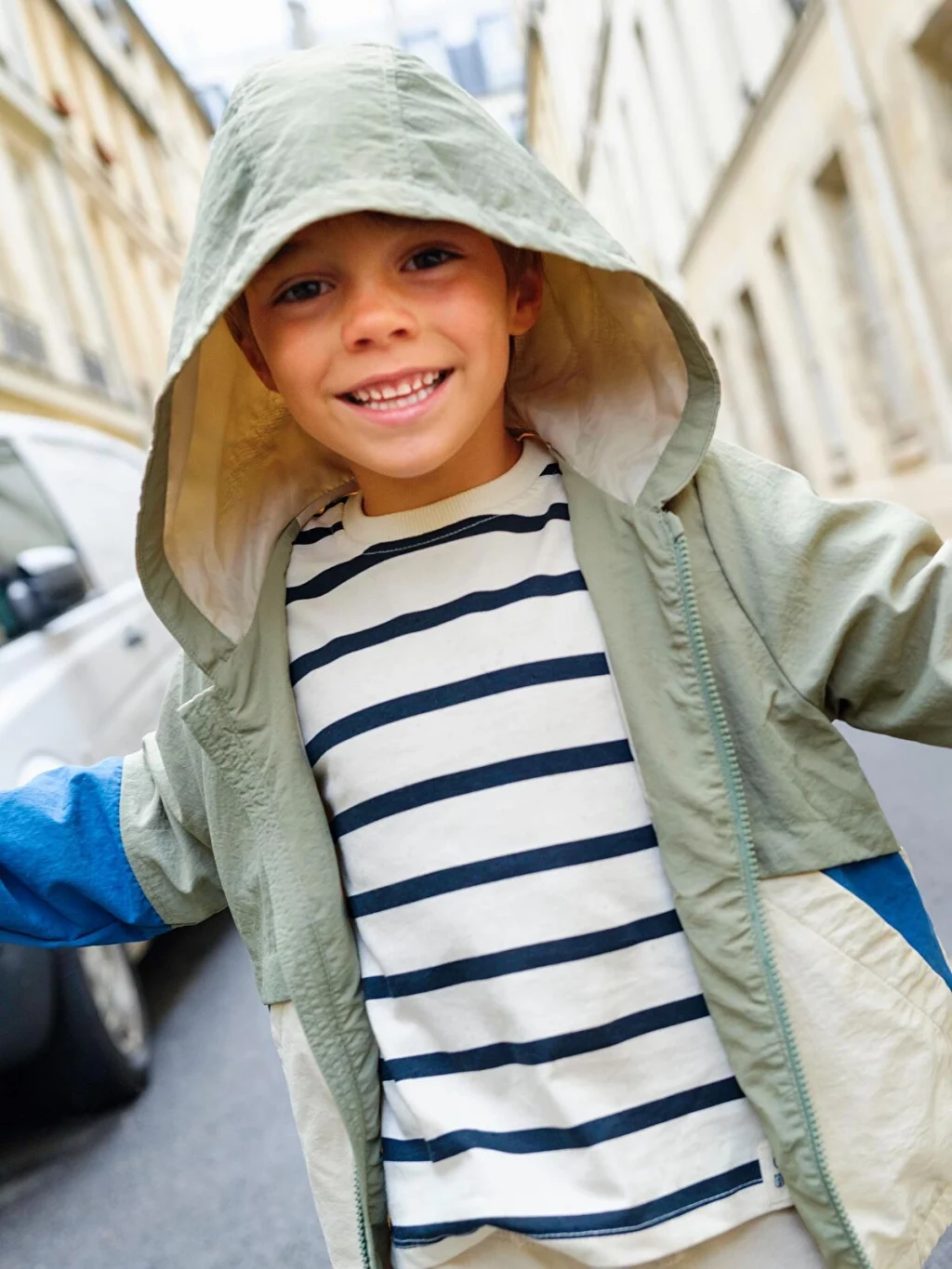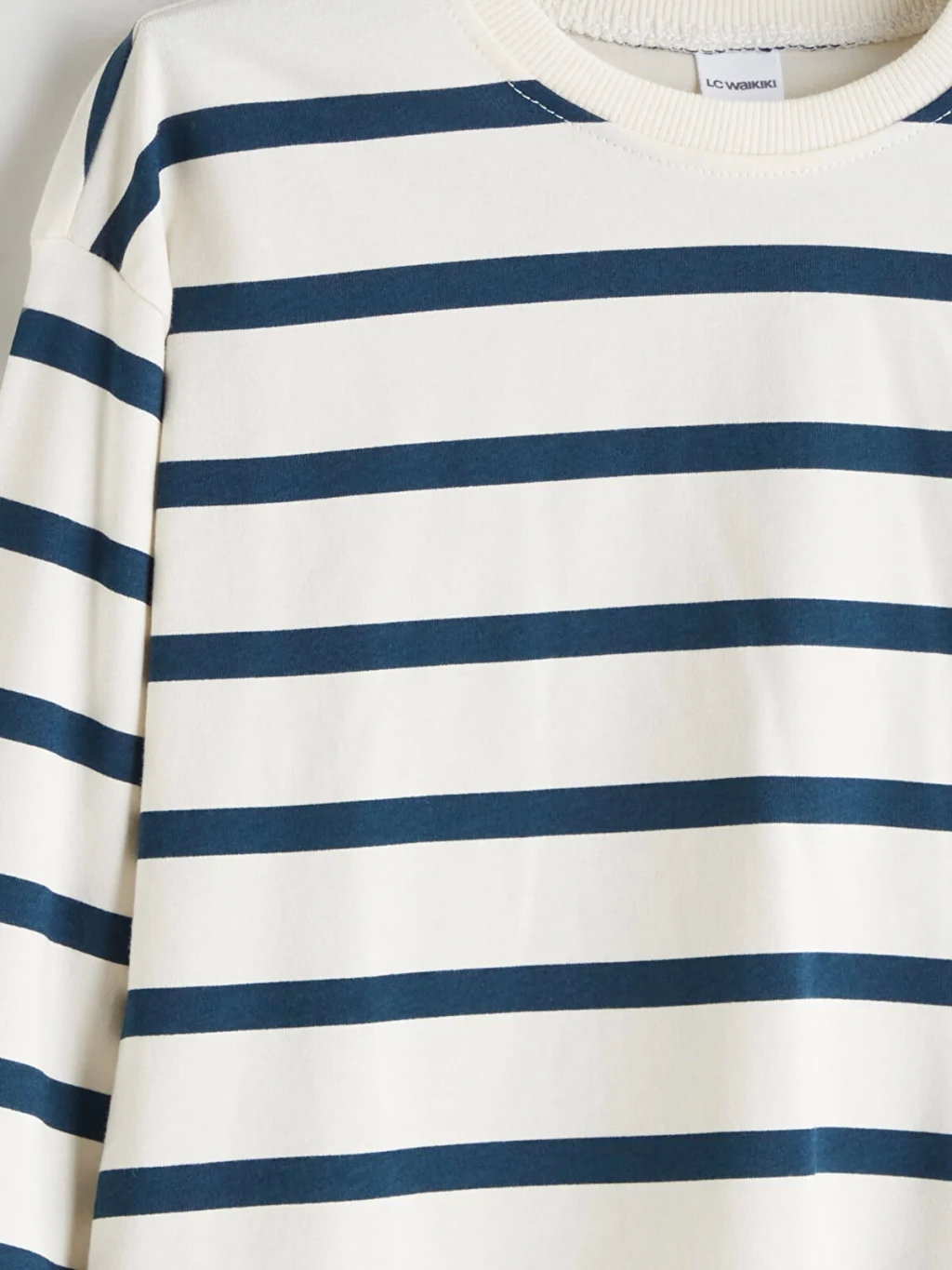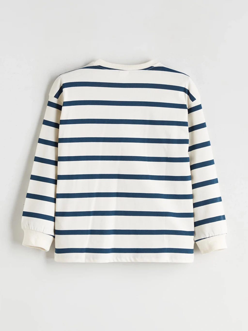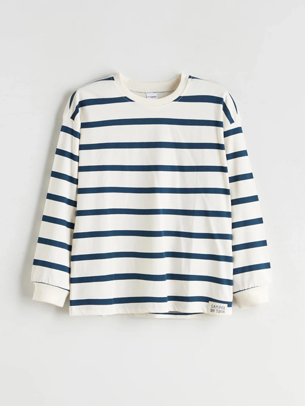 Bol kalıplı erkek çocuk tişört, penye kumaştan üretilmiştir. Bisiklet yaka ve uzun kollu olan ürün, çizgili desene sahiptir ve kol uçları ribanalıdır.