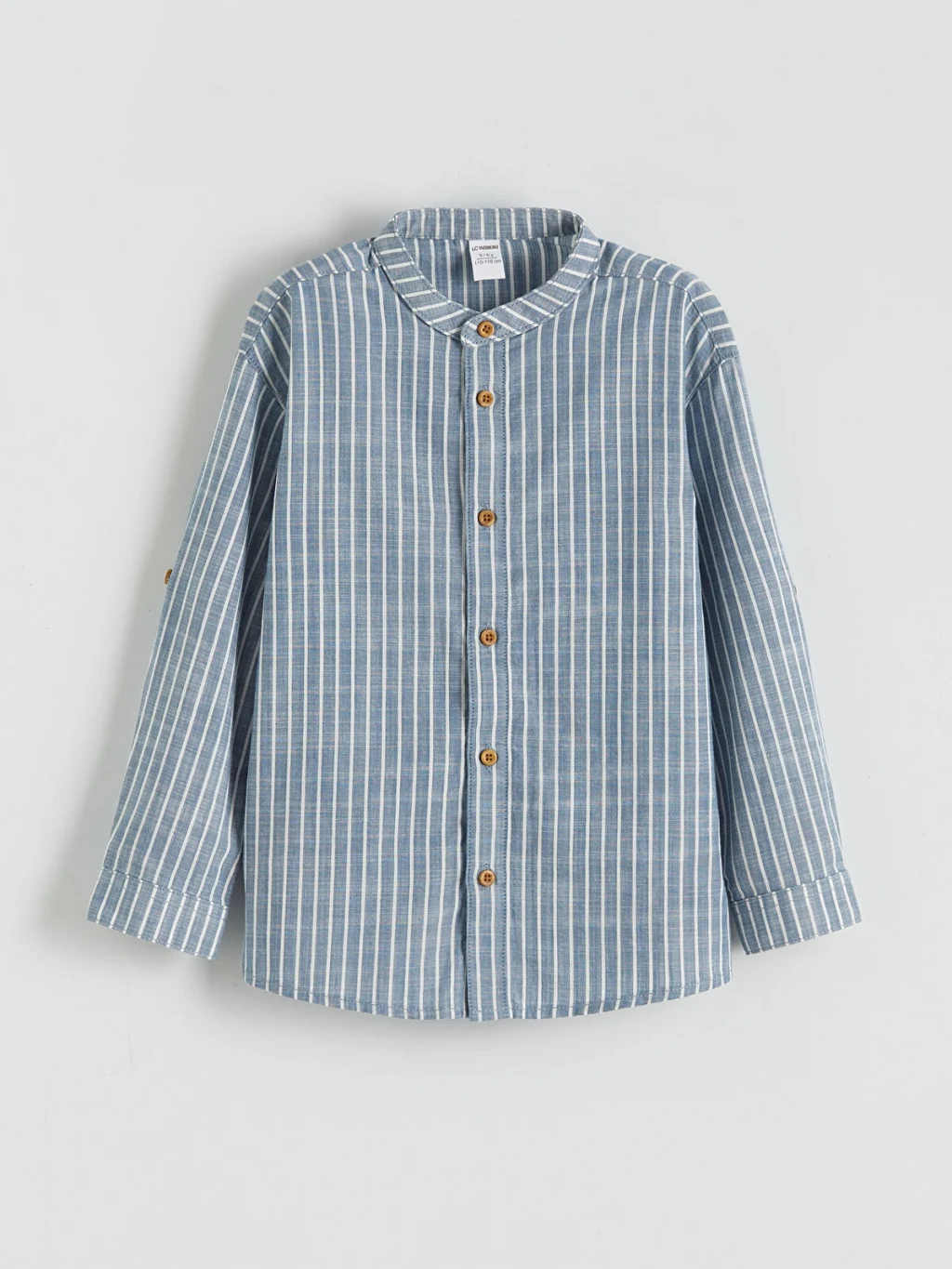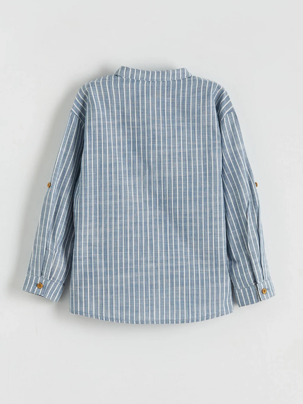 Erkek çocuk set; hakim yaka, uzun kollu, çizgili gömlek ve pantolondan oluşur. Gömlek önden düğme kapamalıdır ve kolları katlanabilir.
