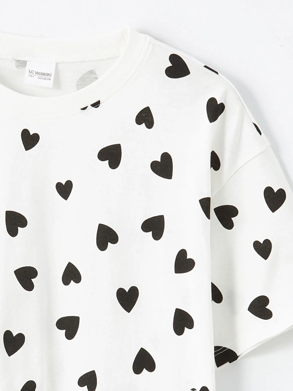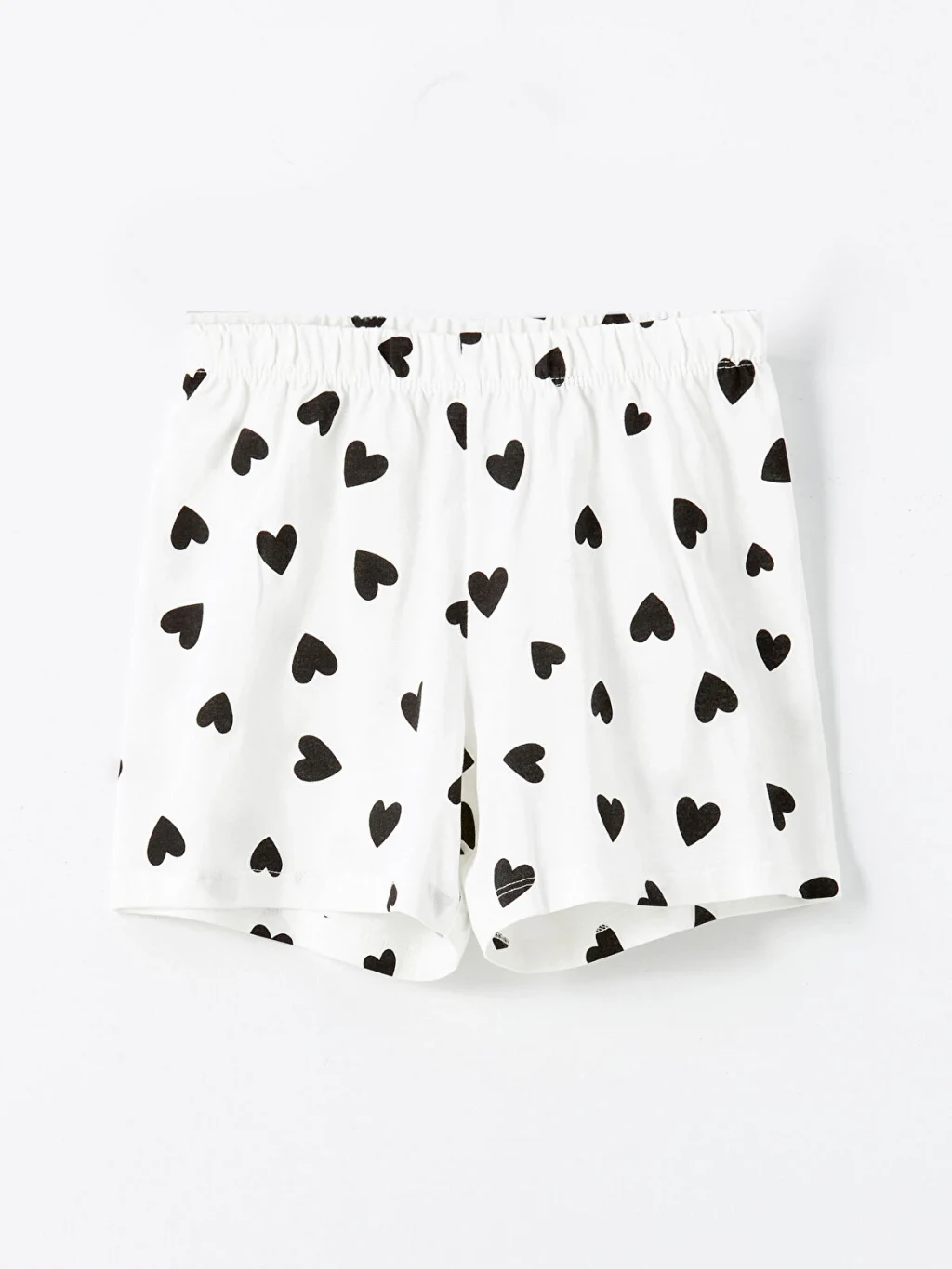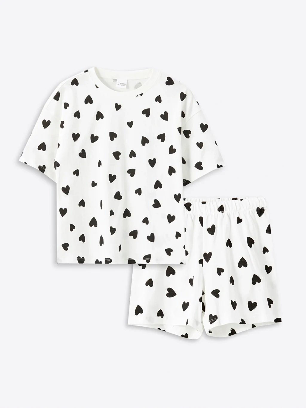 Kalp desenli kız çocuk pijama takımı, bisiklet yaka ve kısa kollu tişört ile beli lastikli şorttan oluşmaktadır.