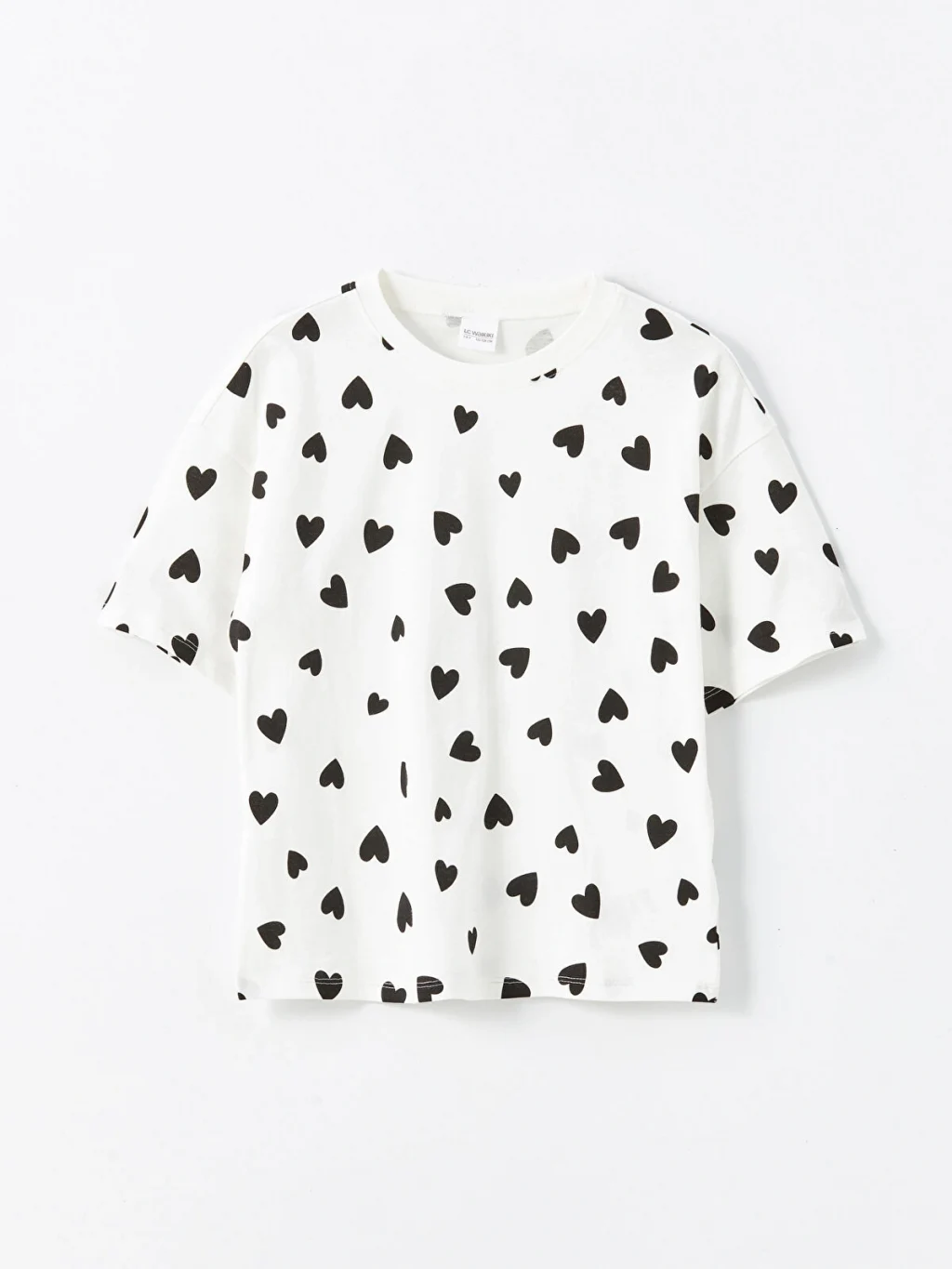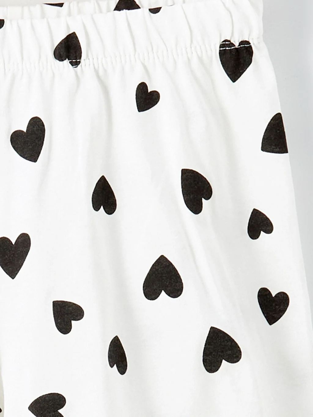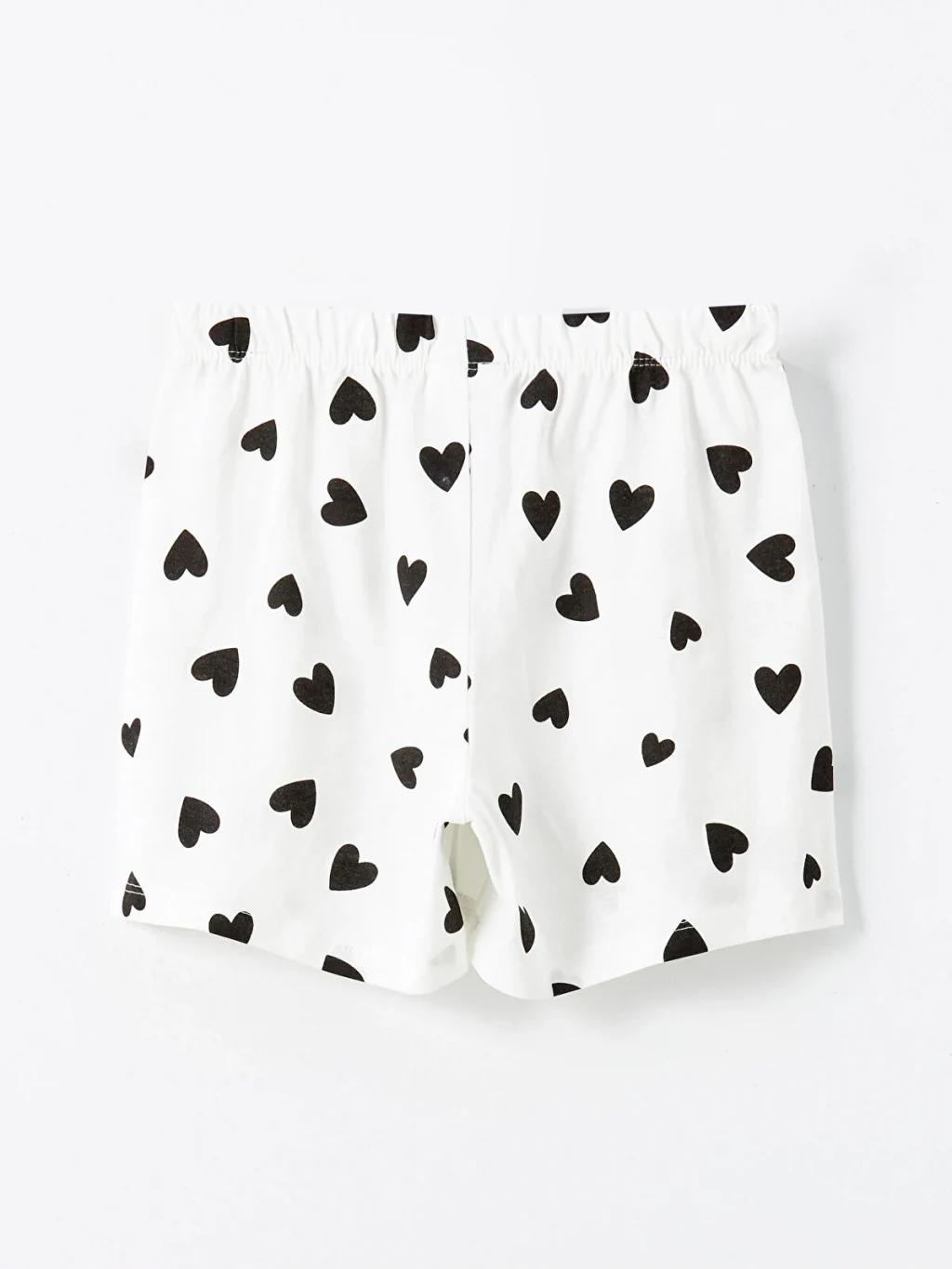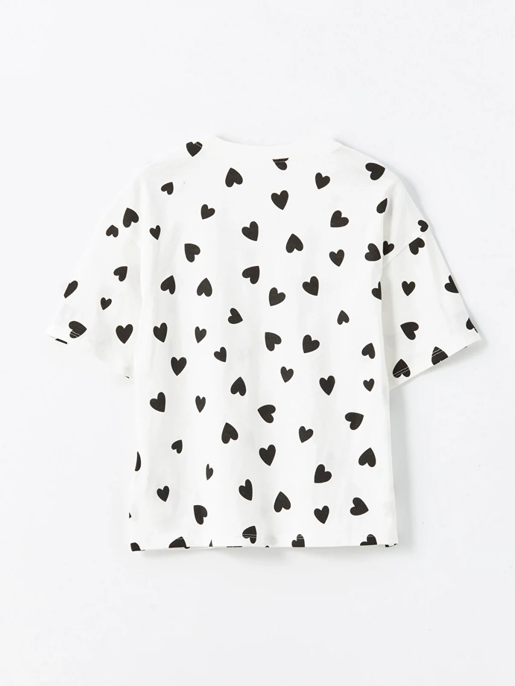Kalp desenli kız çocuk pijama takımı, bisiklet yaka ve kısa kollu tişört ile beli lastikli şorttan oluşmaktadır.