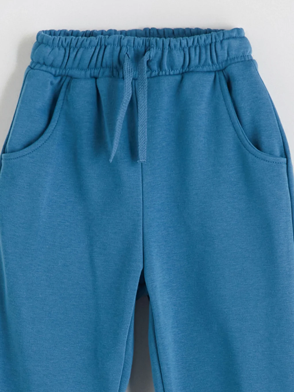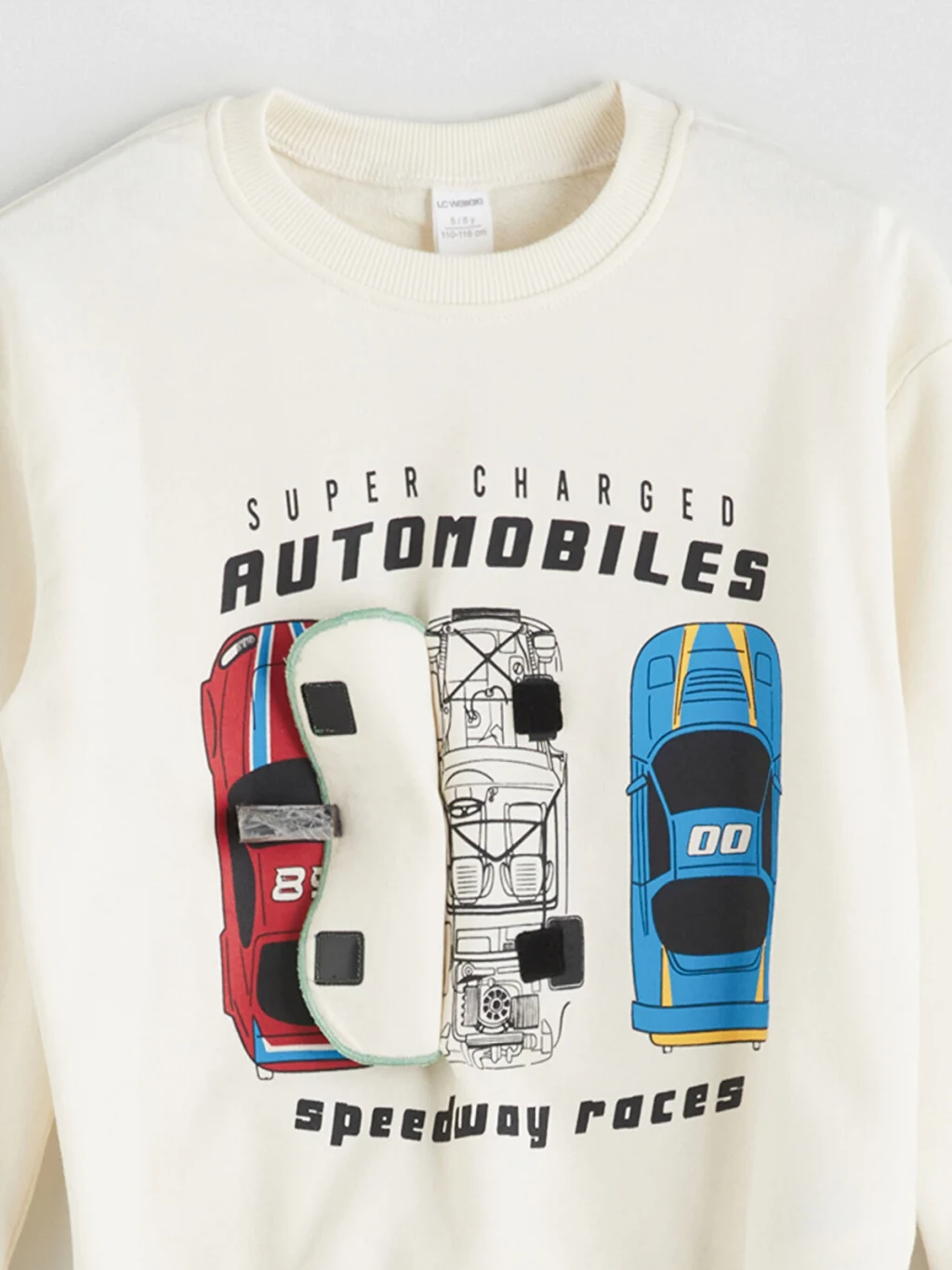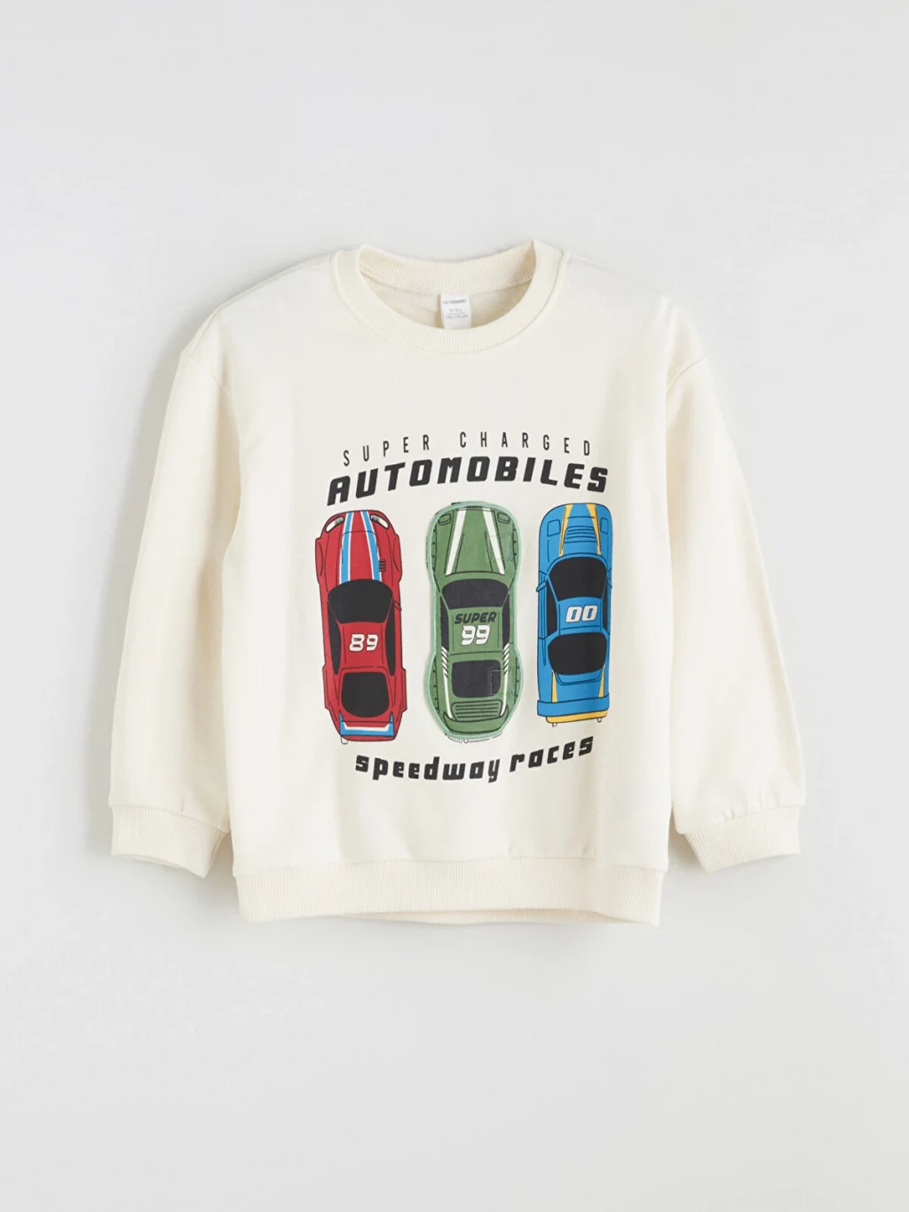 3 iplik kumaştan üretilen erkek çocuk takım, bisiklet yaka ve uzun kollu baskılı sweatshirt ile paçası ribanalı eşofman altından oluşur.