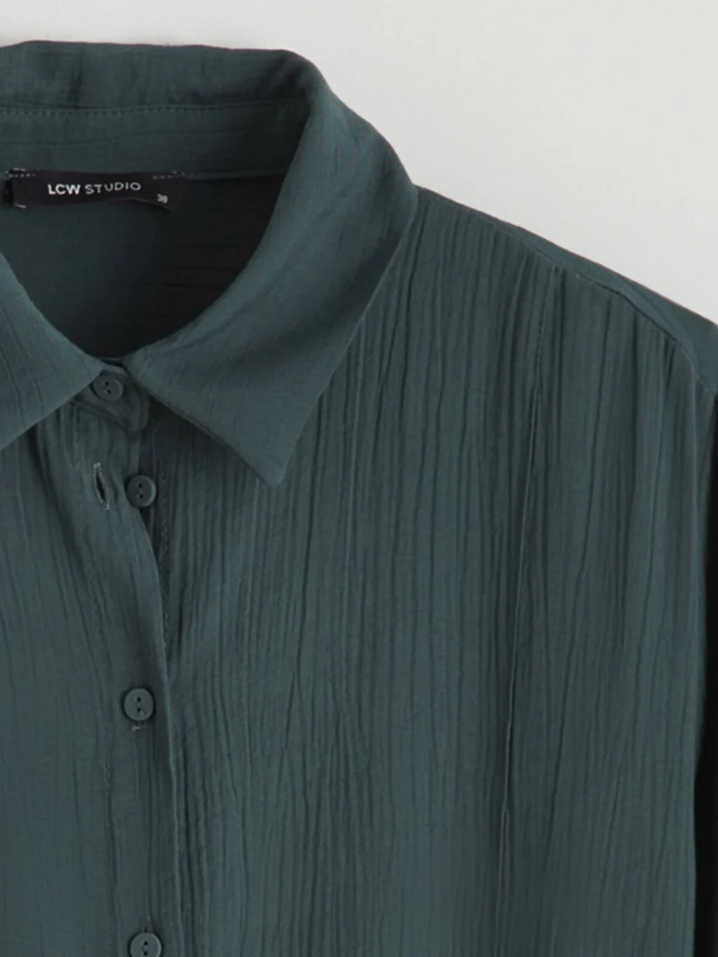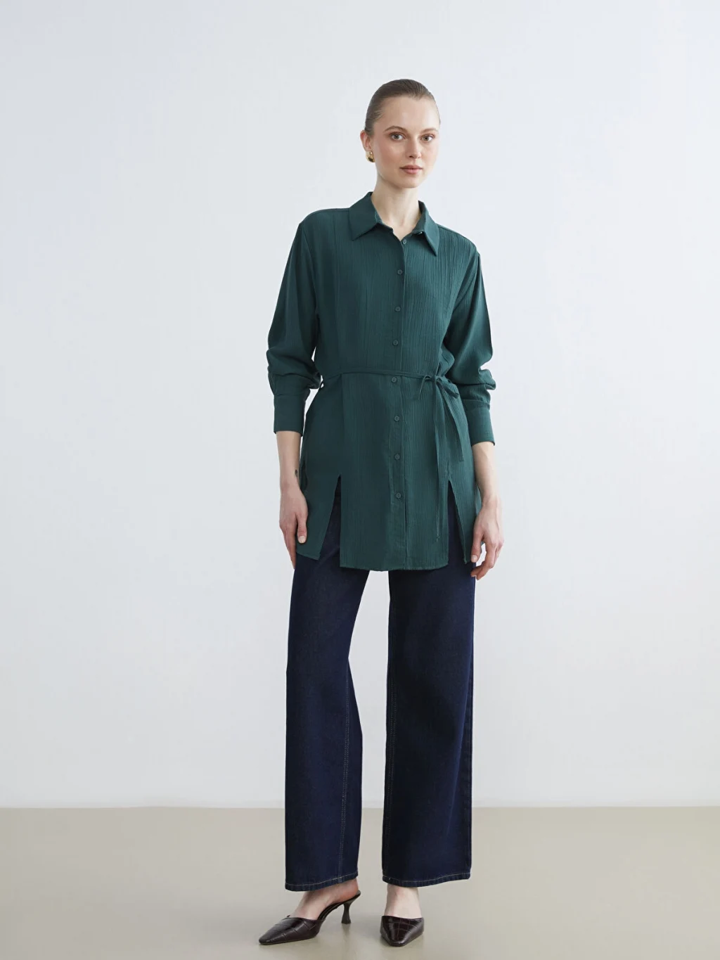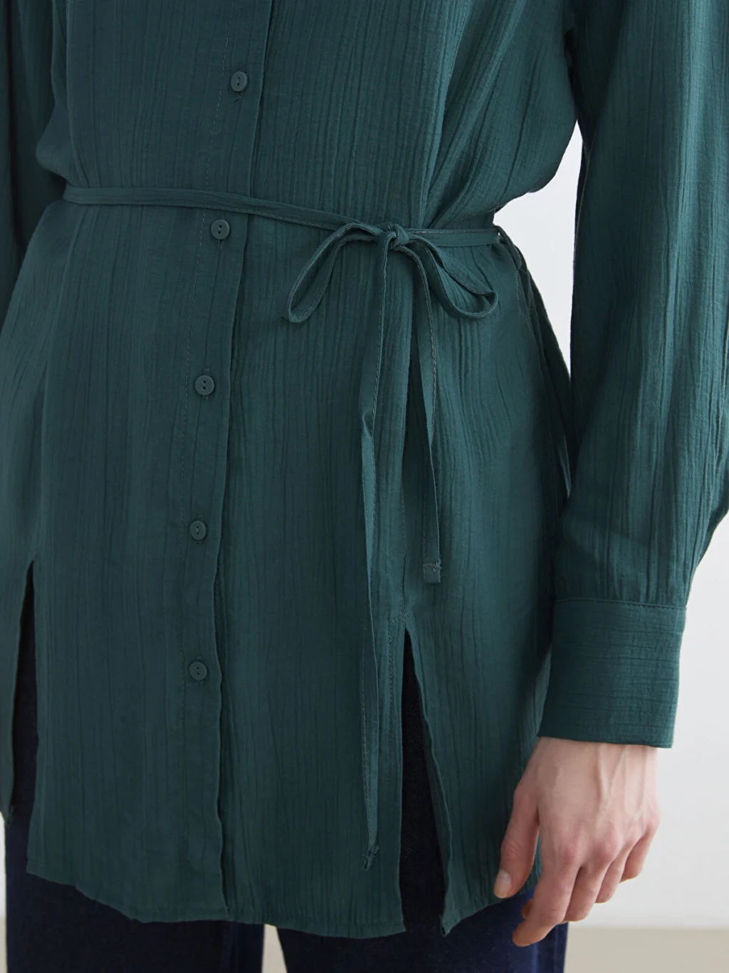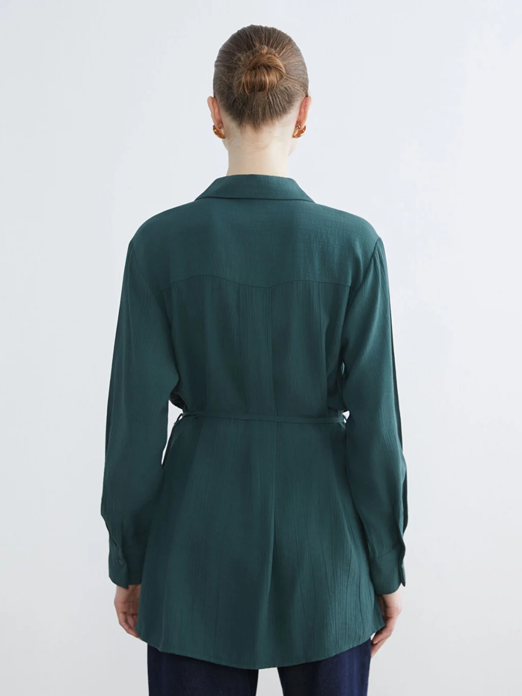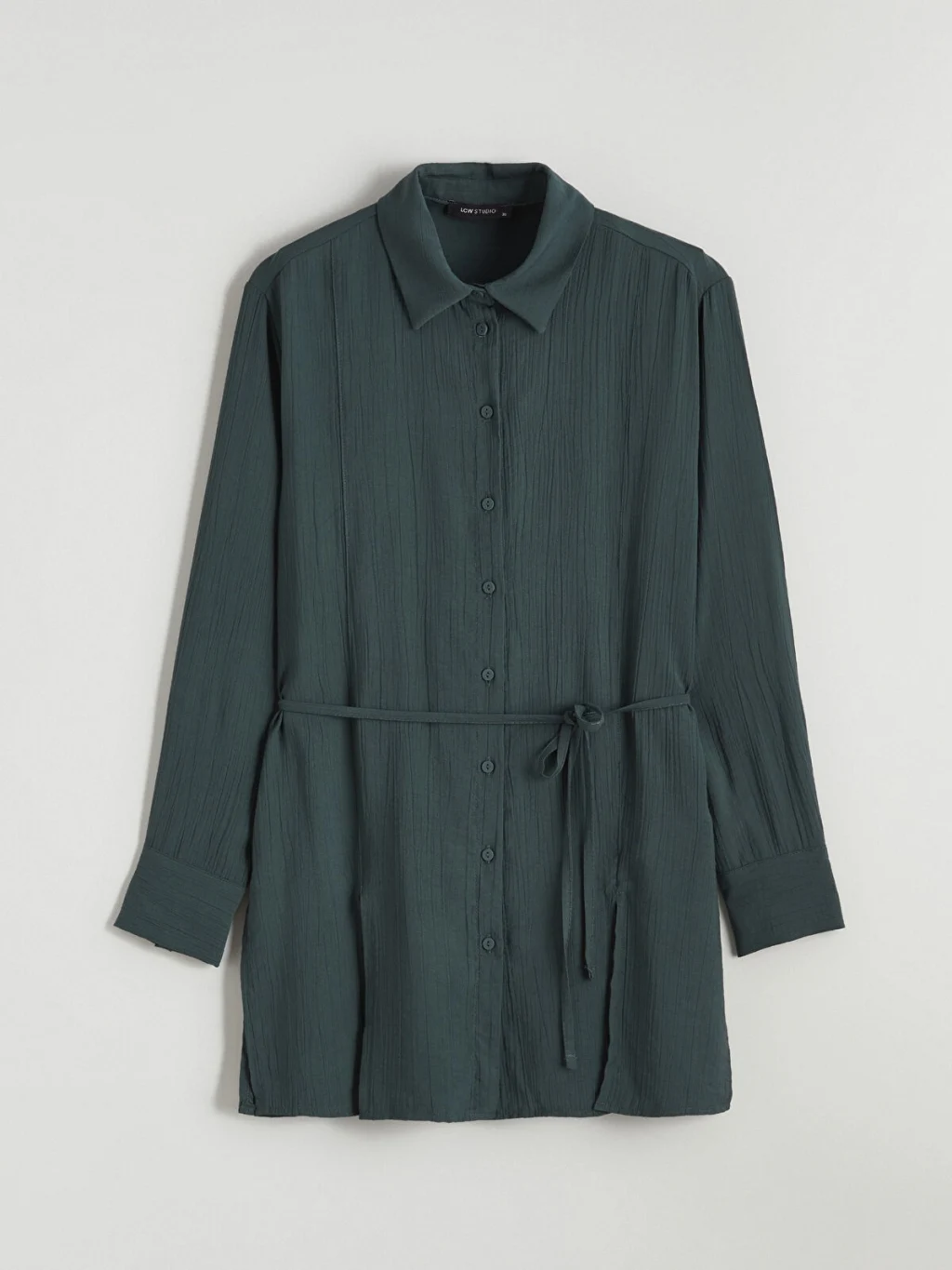 Krinkle kumaştan üretilmiş kadın gömlek tunik, uzun kollu ve düğme kapamalıdır. Belinde kendi kumaşından bağlama detayı bulunur.