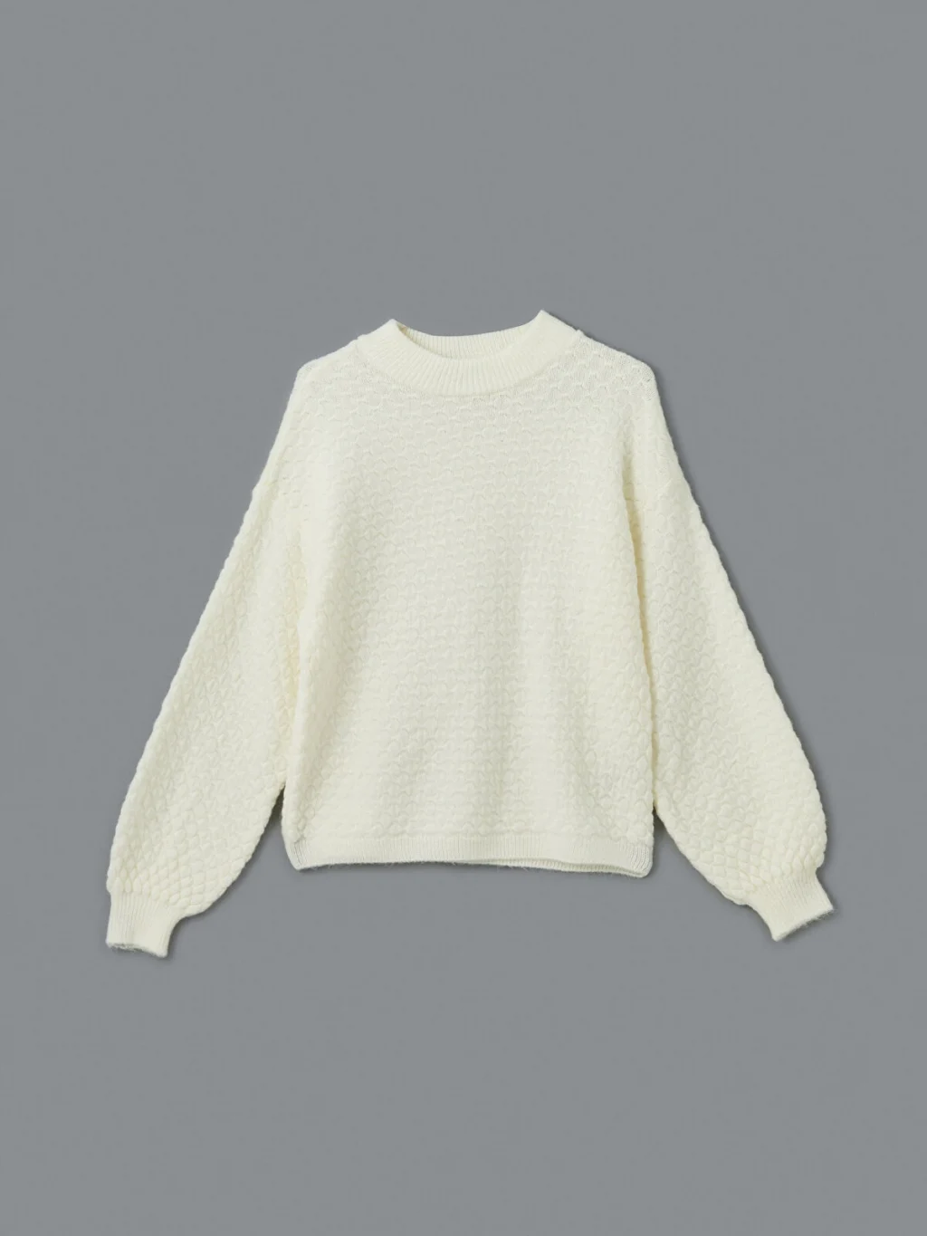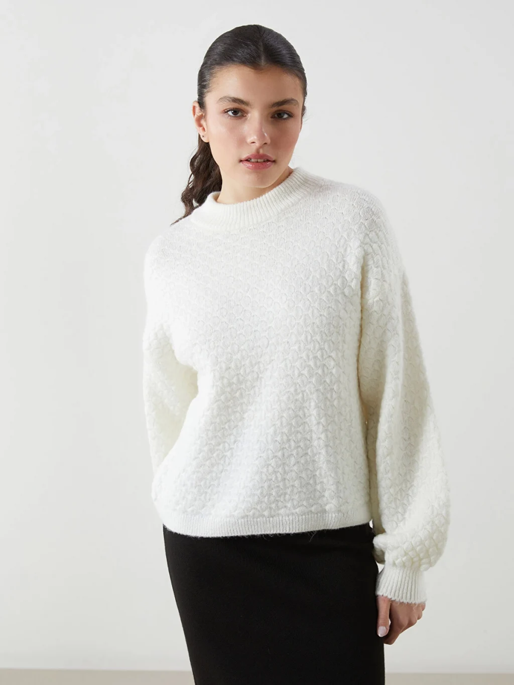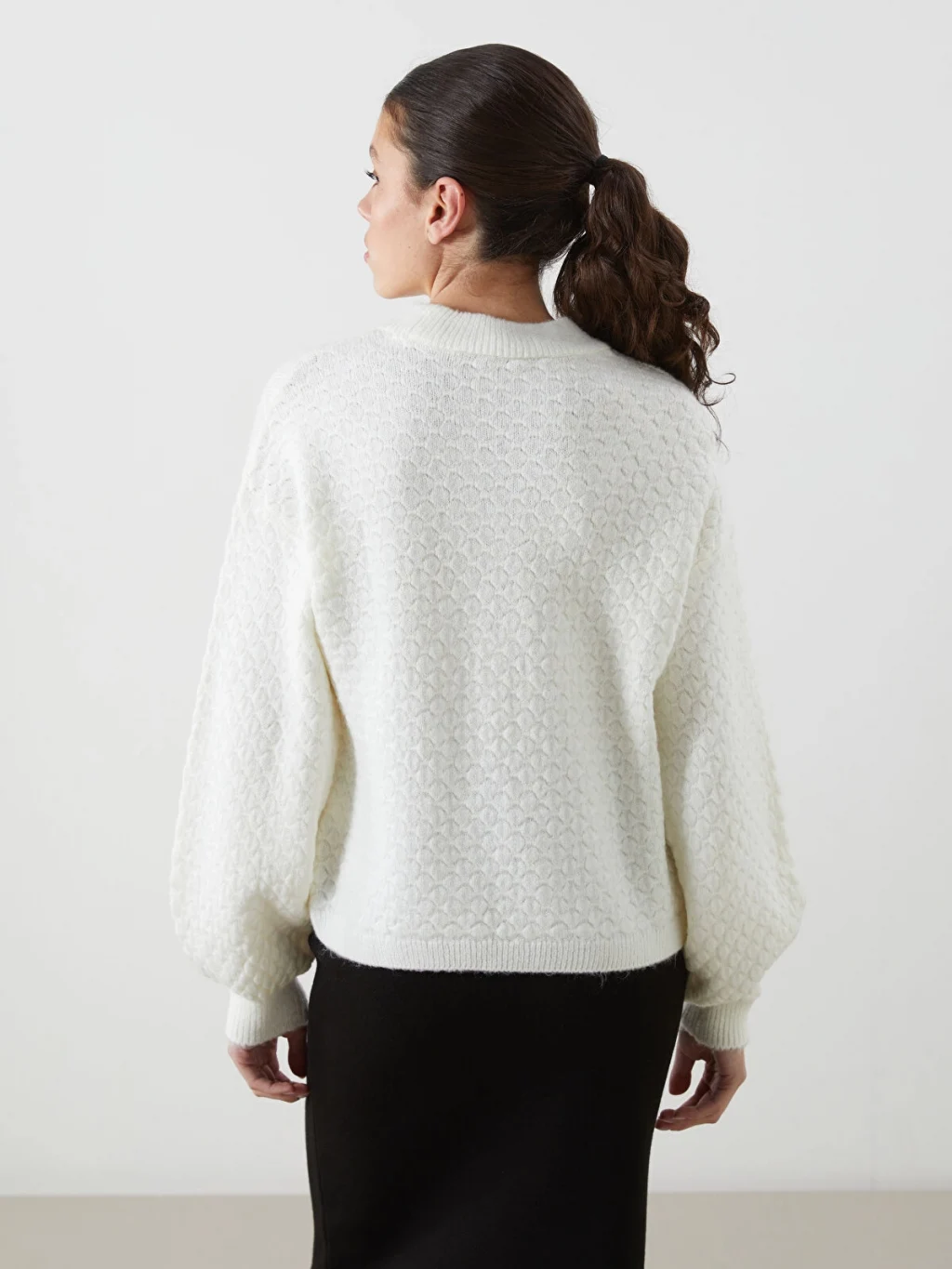 Yarım balıkçı yakalı kadın triko kazak, kendinden dokulu kumaştan üretilmiştir. Uzun balon kollu olup, kol ve etek ucu ribanalıdır.
