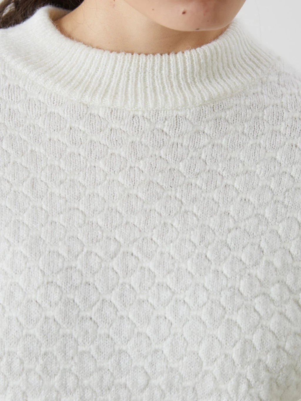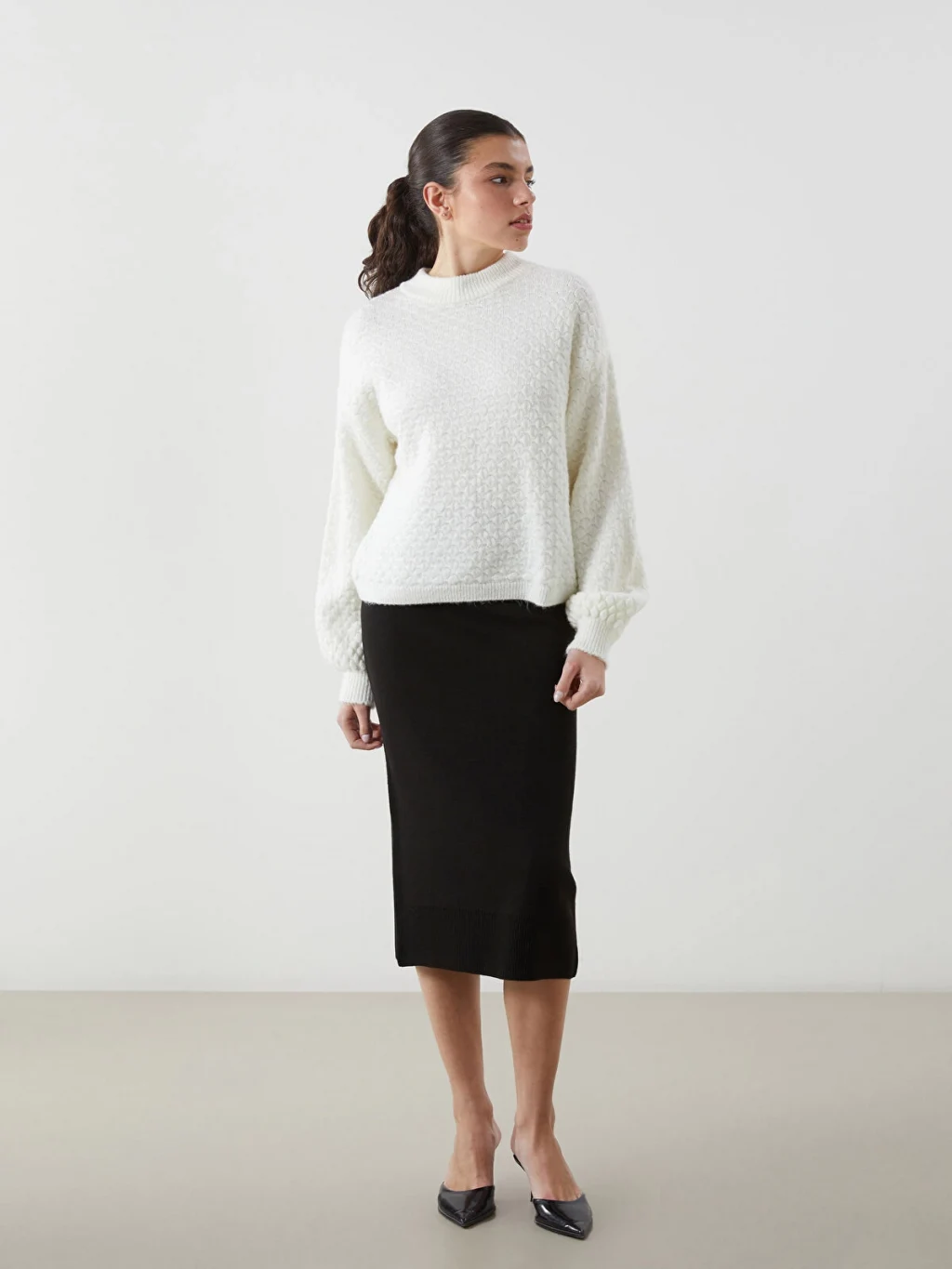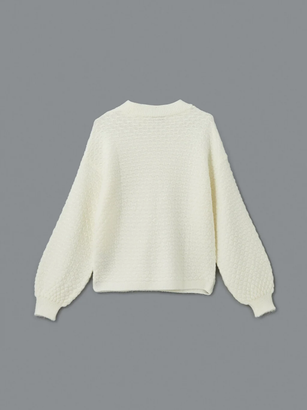 Yarım balıkçı yakalı kadın triko kazak, kendinden dokulu kumaştan üretilmiştir. Uzun balon kollu olup, kol ve etek ucu ribanalıdır.