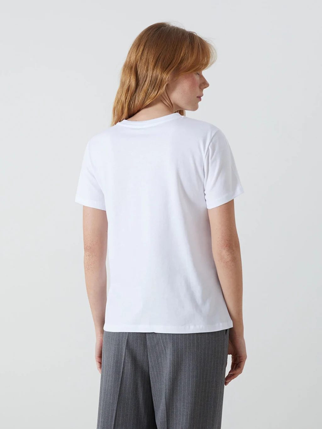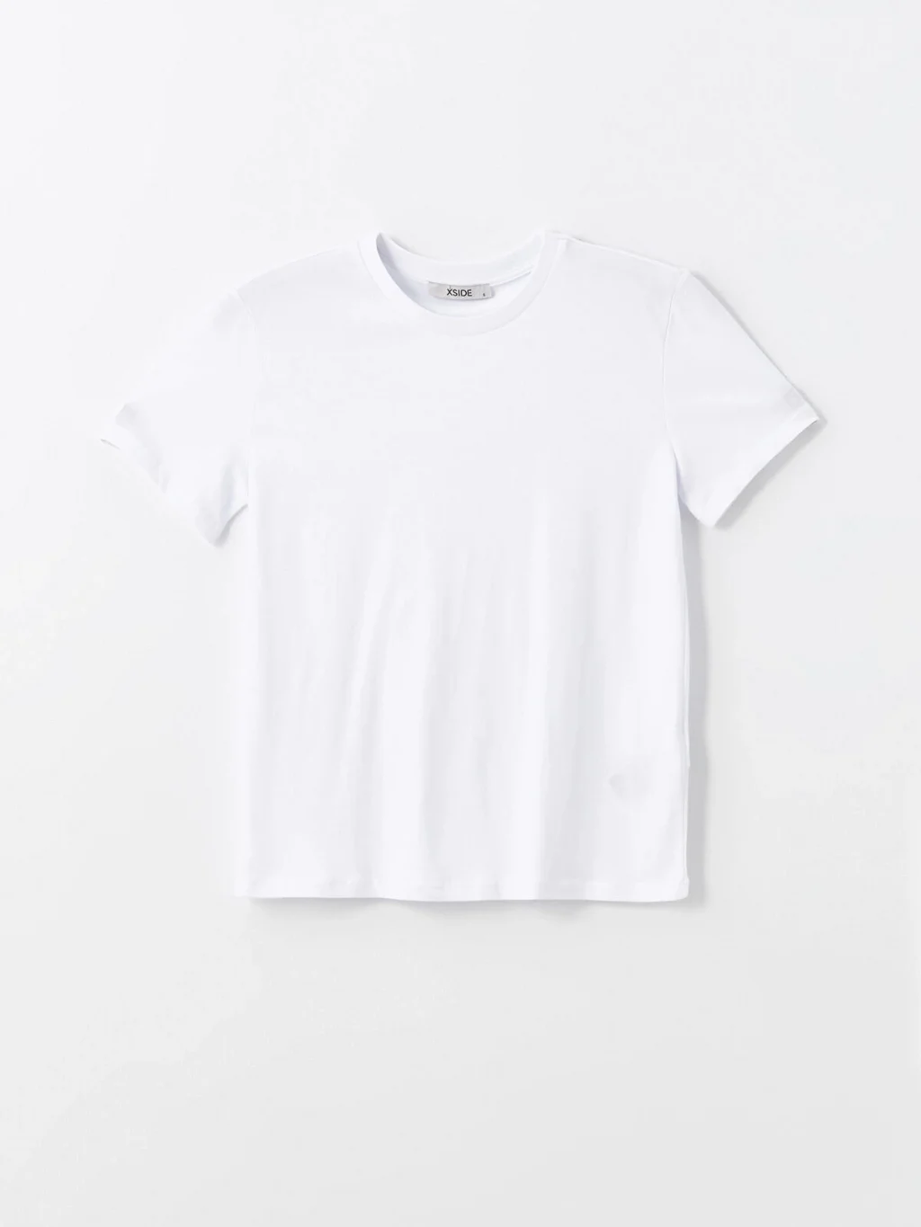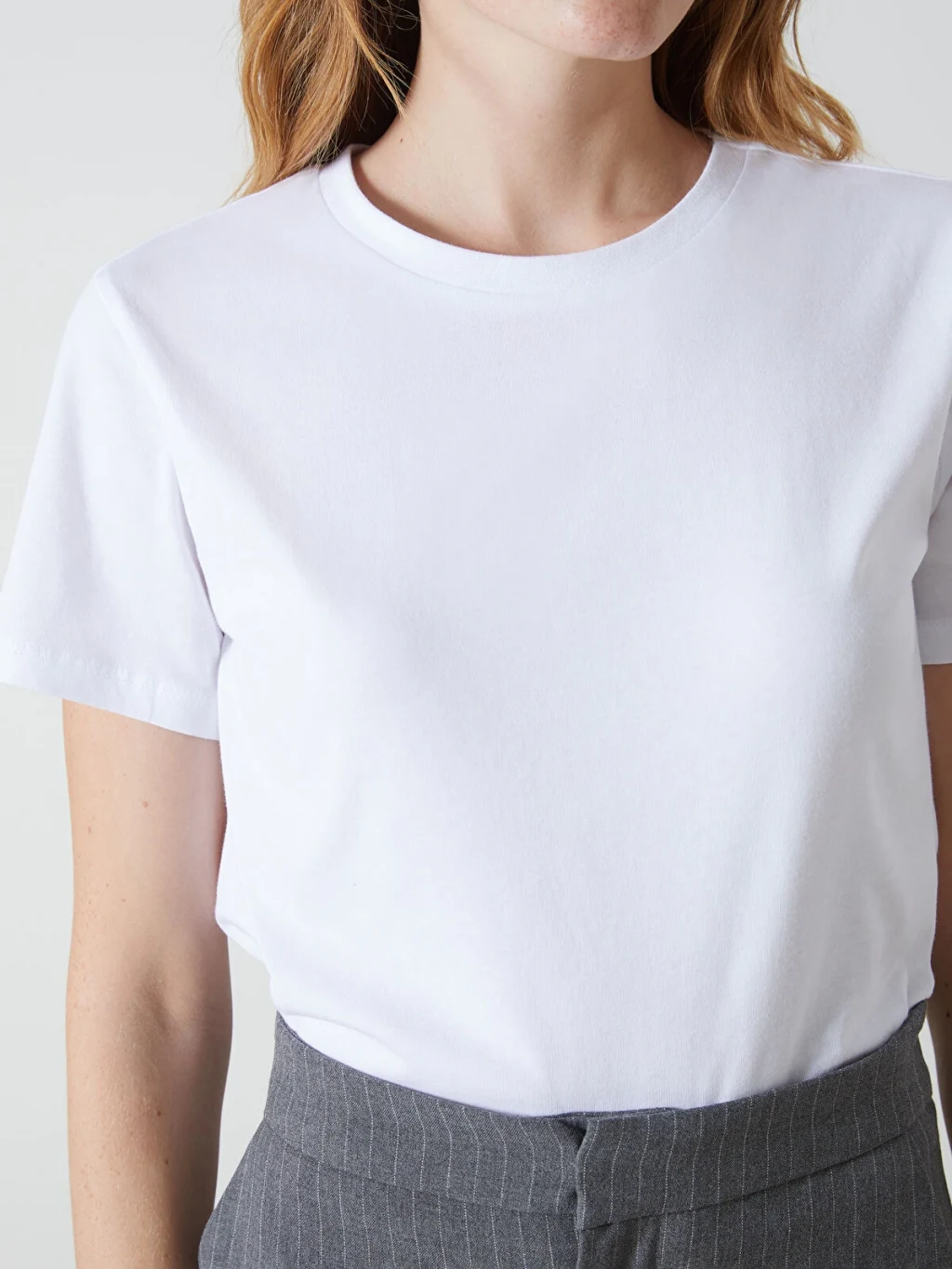 Kısa kollu kadın tişört, bisiklet yaka tasarımına sahip olup penye kumaştan üretilmiştir. Yaz aylarında serinlik ve rahatlık sağlayan bu tişört, günlük kullanım için ideal bir seçenektir.