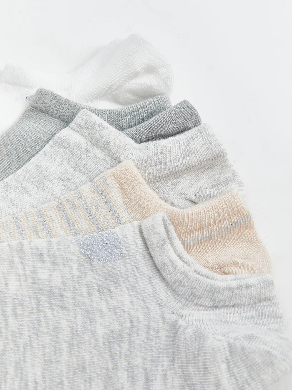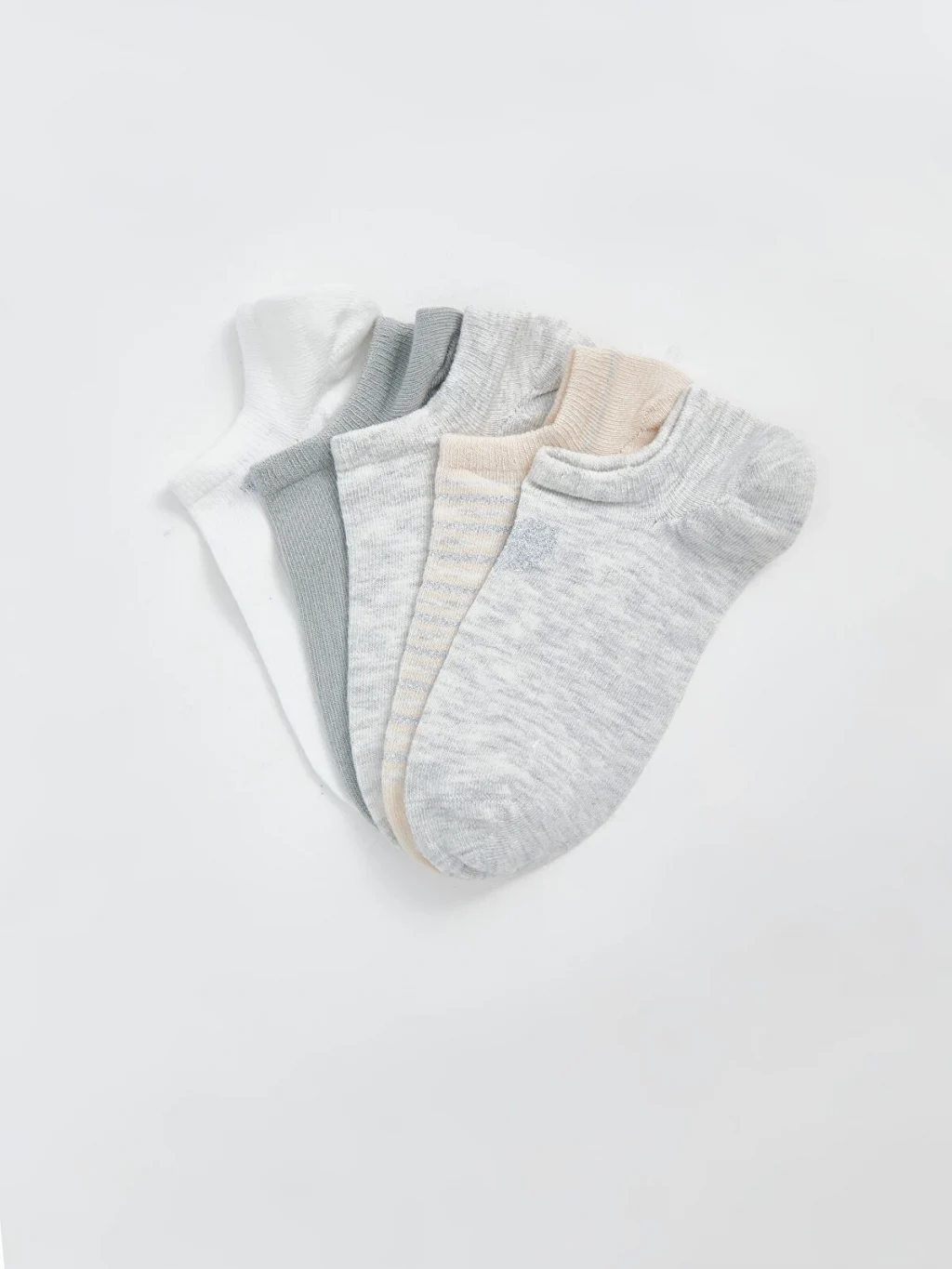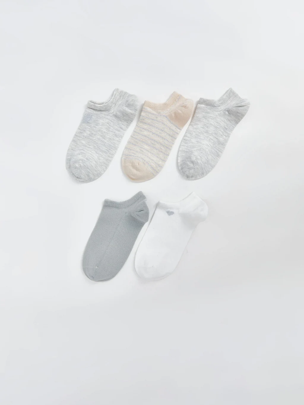 Beş çiftten oluşan kadın patik çorap seti, düz, melanj ve çizgili gibi farklı desenlere sahip modellerden oluşmaktadır.