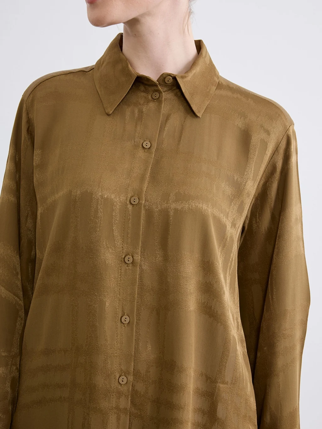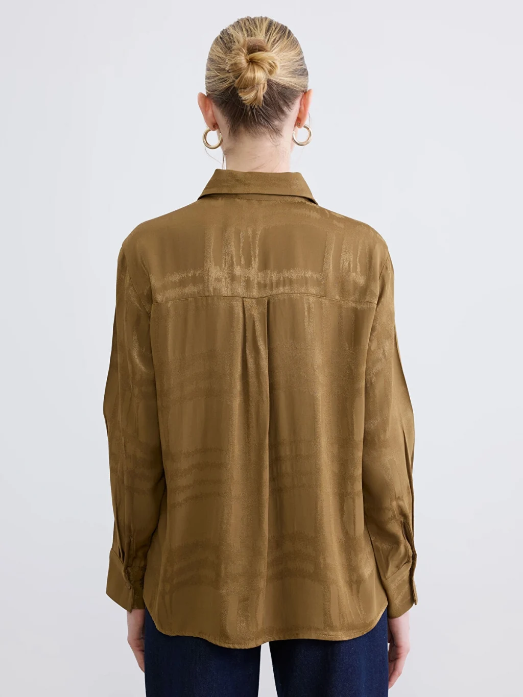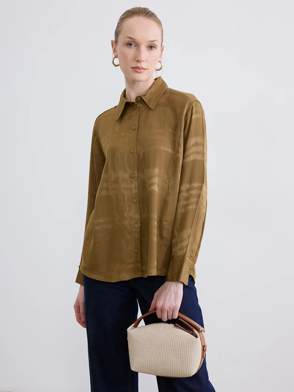 Desenli kumaştan üretilmiş, uzun kollu kadın gömlek. Manşetli ve önden düğme kapamalı tasarıma sahiptir.