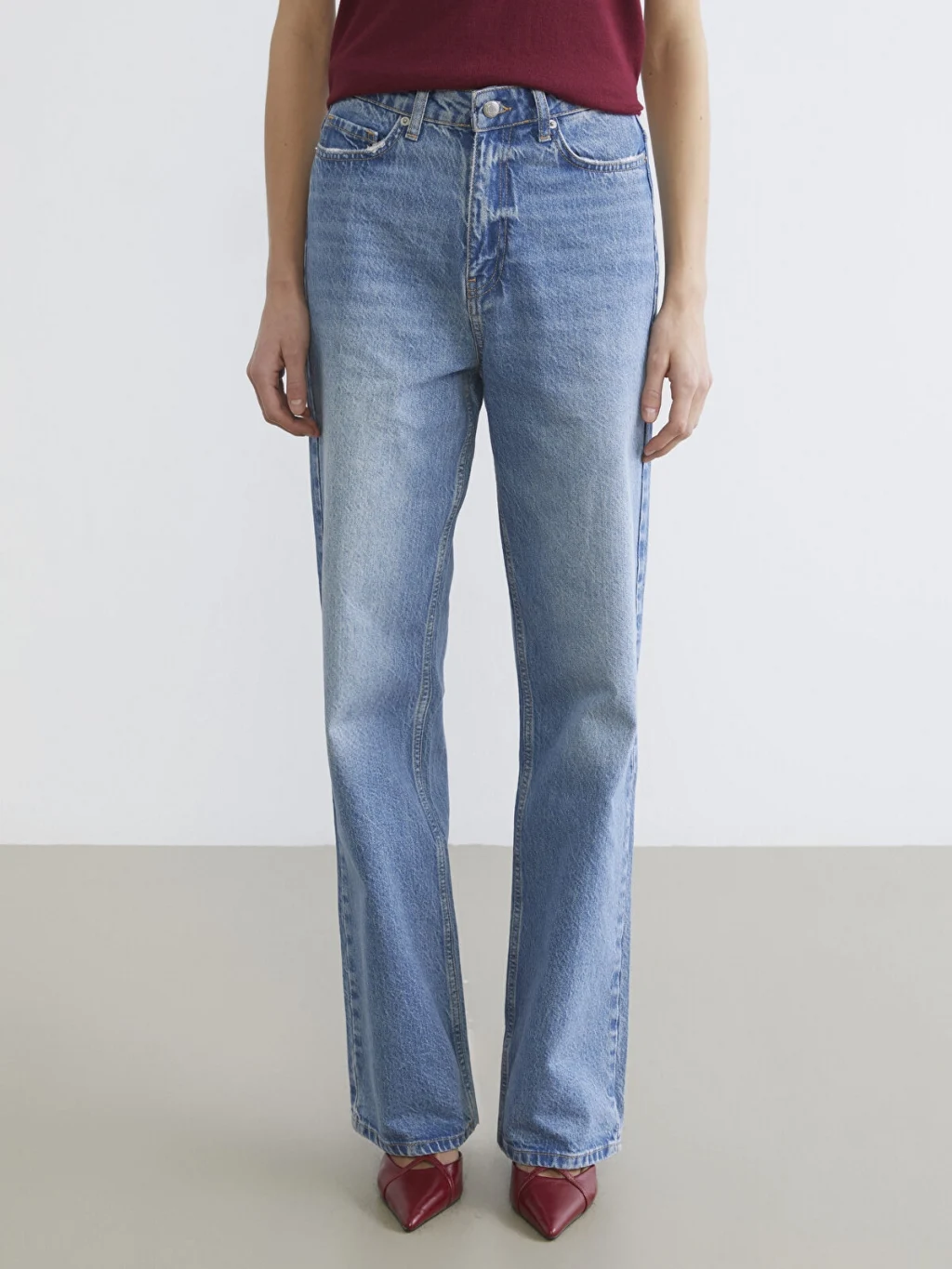 Straight fit; kolay kombinlenebilen zamansız tasarıma sahip model belden paçaya doğru düz inen kesime sahiptir. Gün boyu rahatlık ve hareket özlüğü için esnek yapılı kumaştan üretilmiştir.
