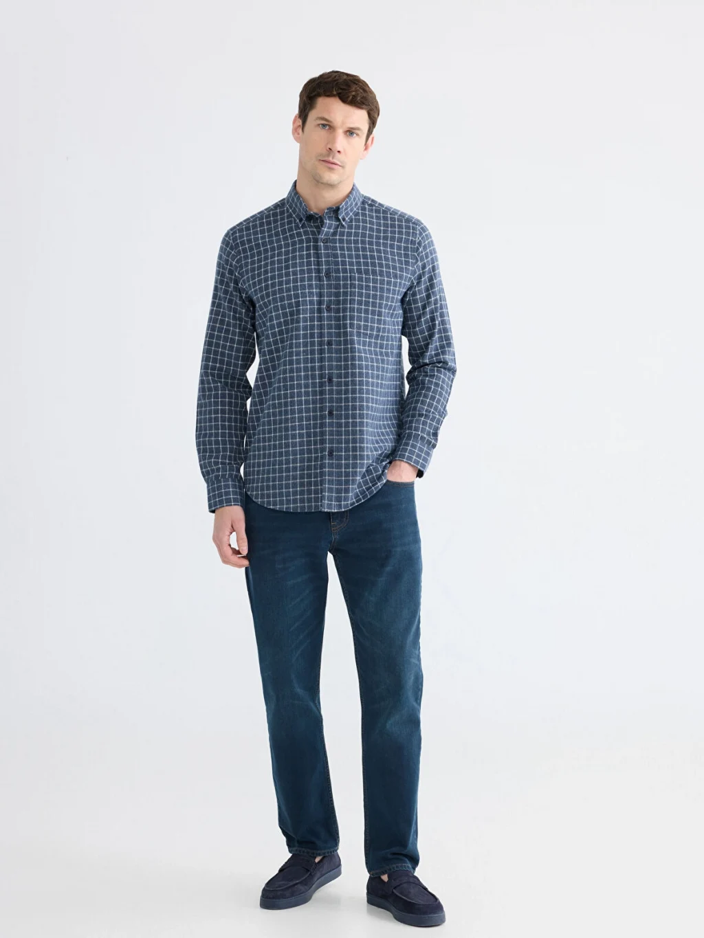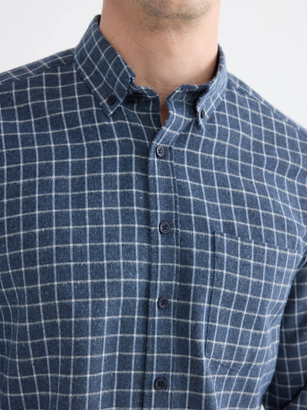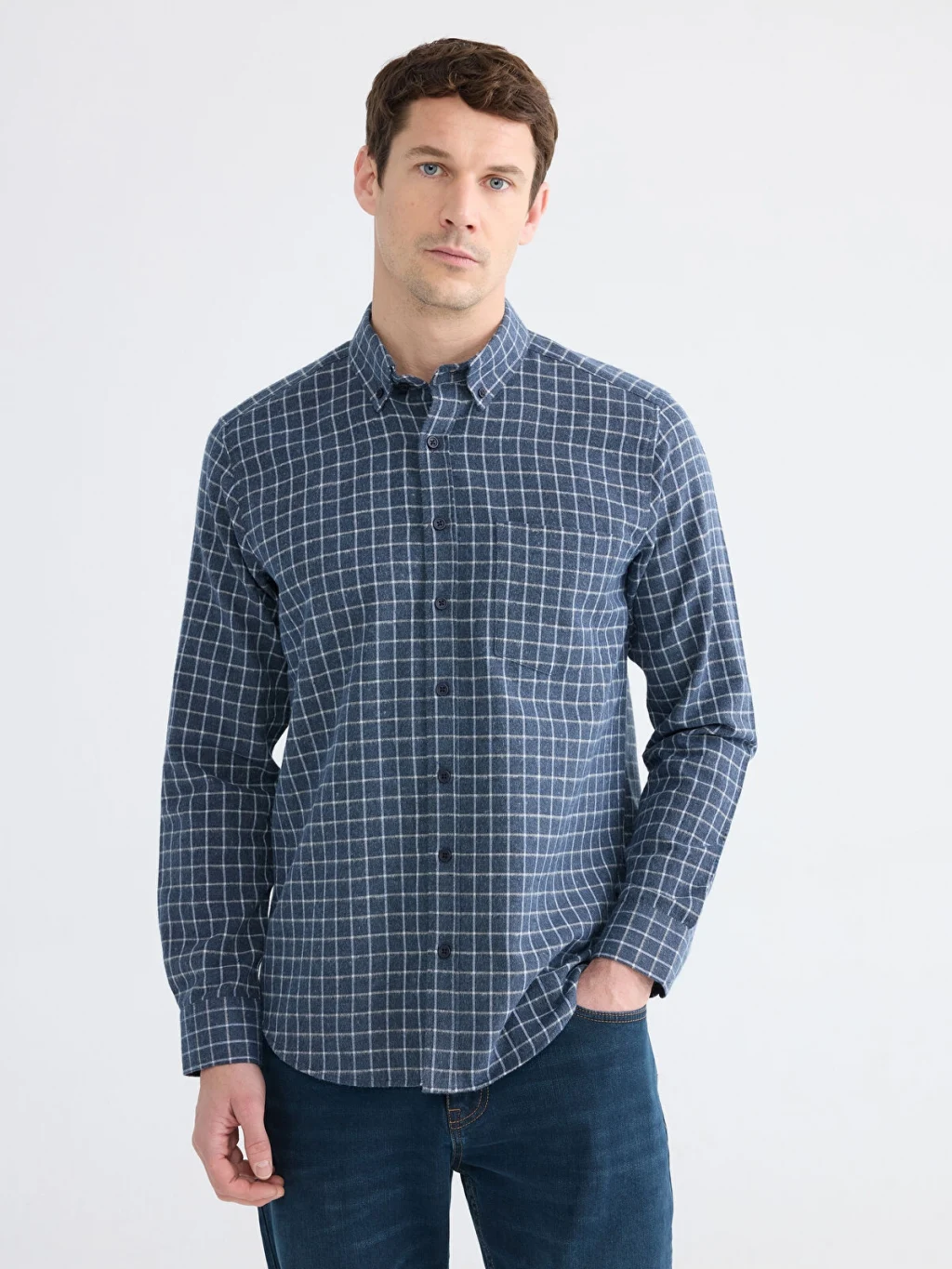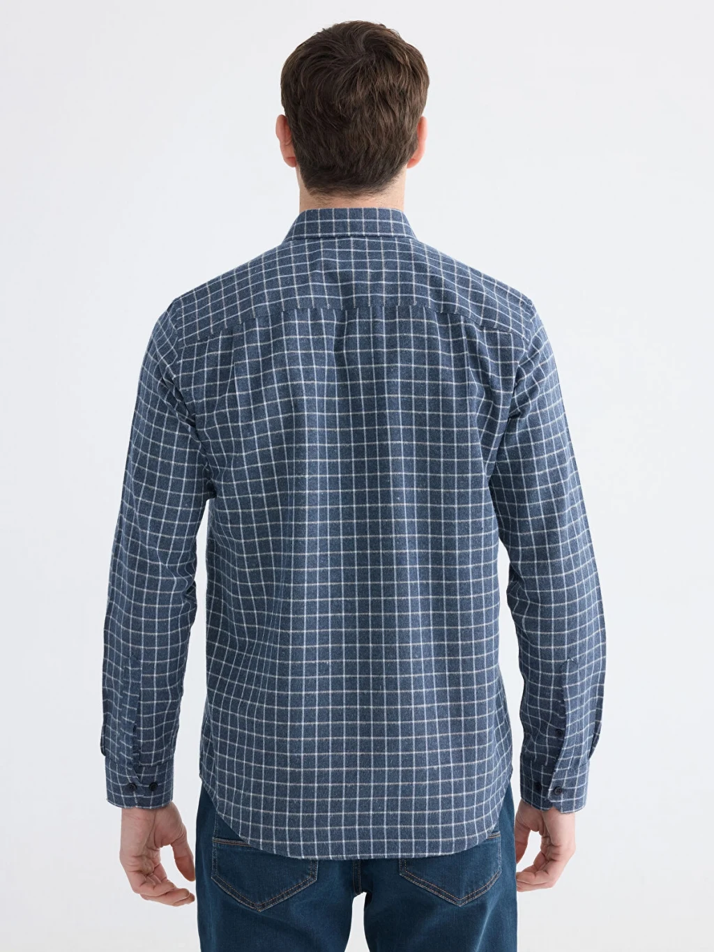 Ekose desene sahip erkek gömlek, uzun kollu ve yakalı bir tasarıma sahiptir. Önden düğme ile kapanmaktadır.