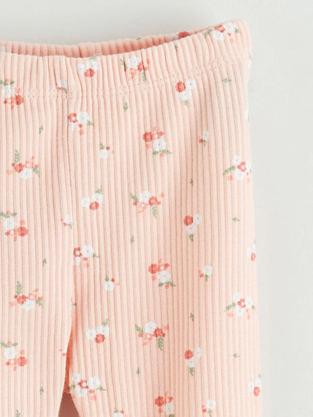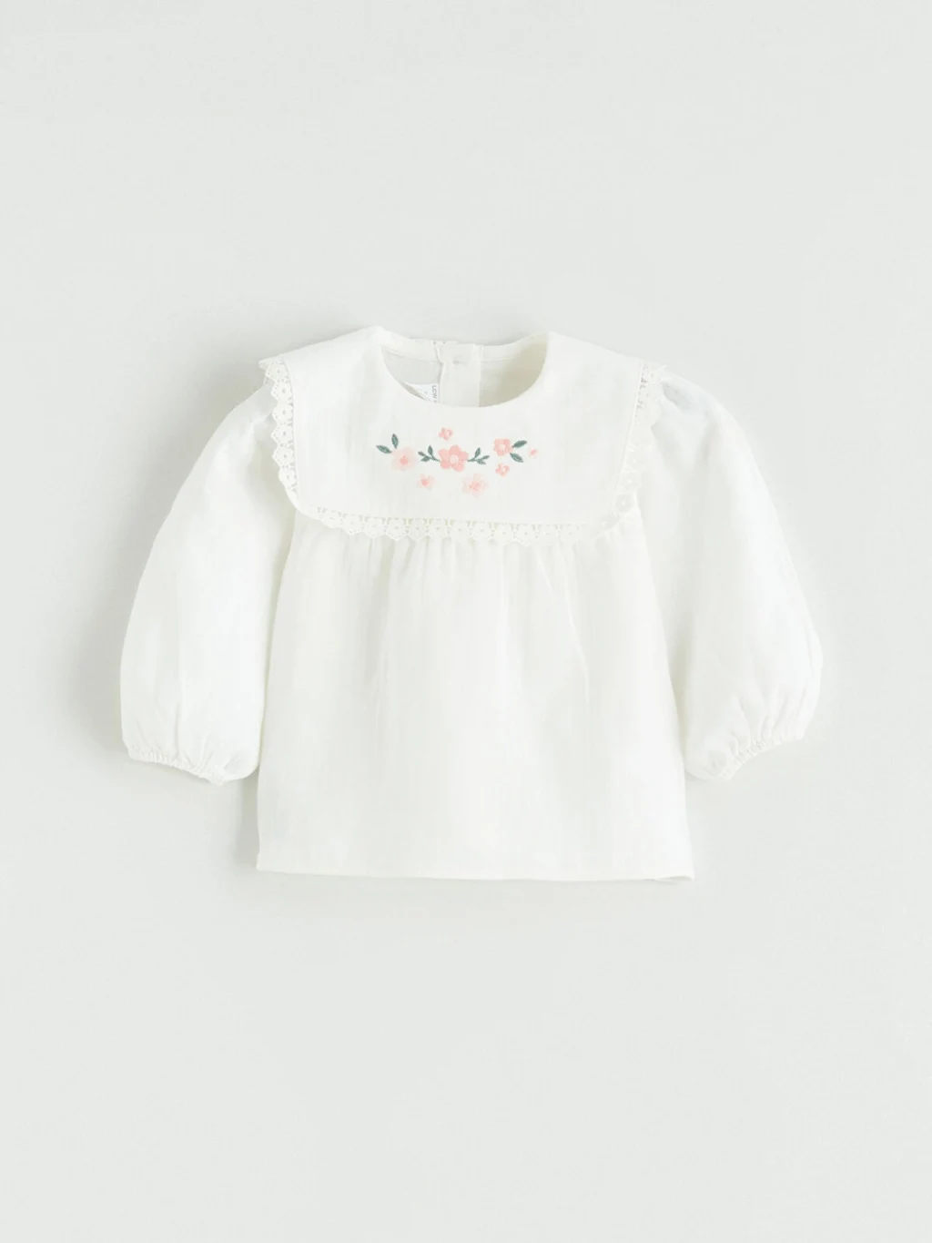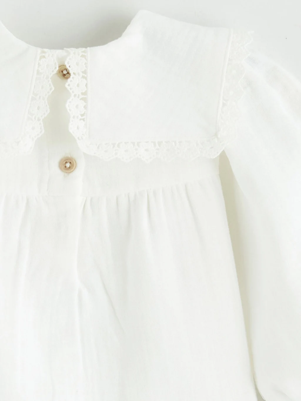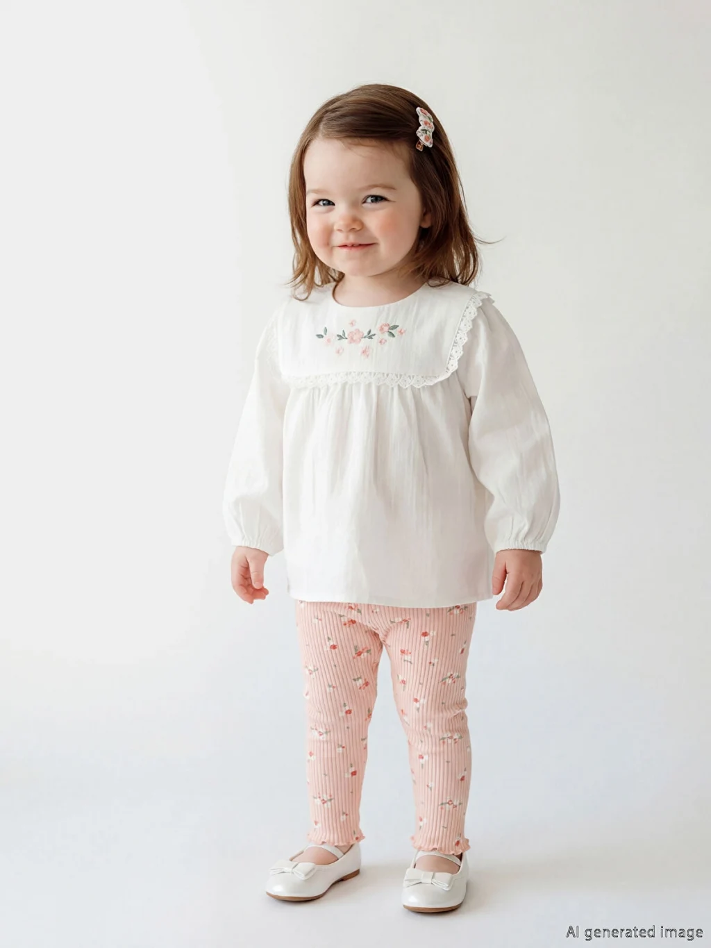 Kız bebek takım, işlemeli bebe yakalı, uzun balon kollu, arkadan düğme kapamalı müslin bluz ve desenli tayttan oluşur. %100 pamuk kumaştan üretilmiştir.