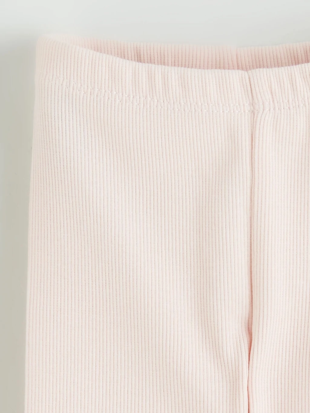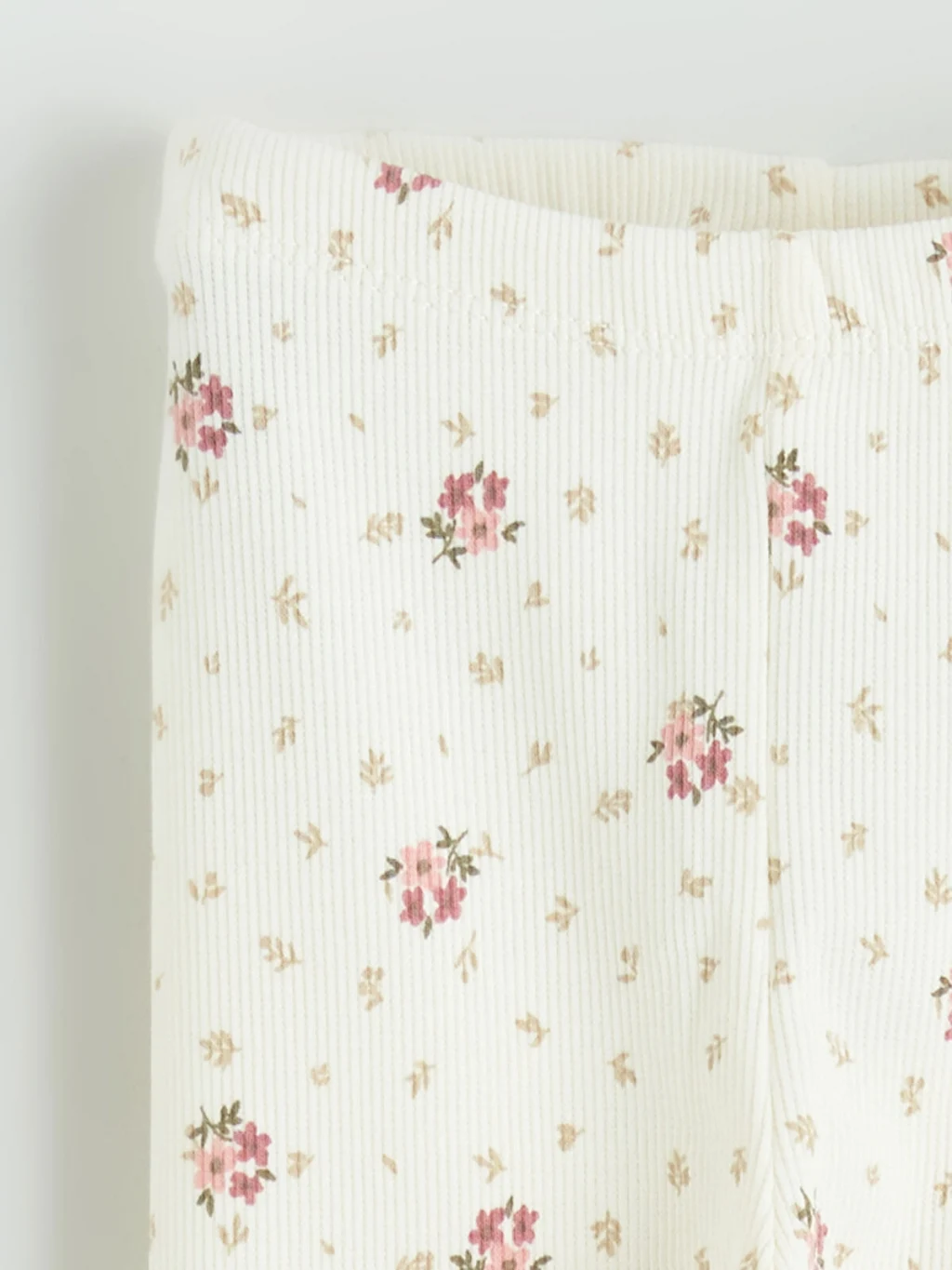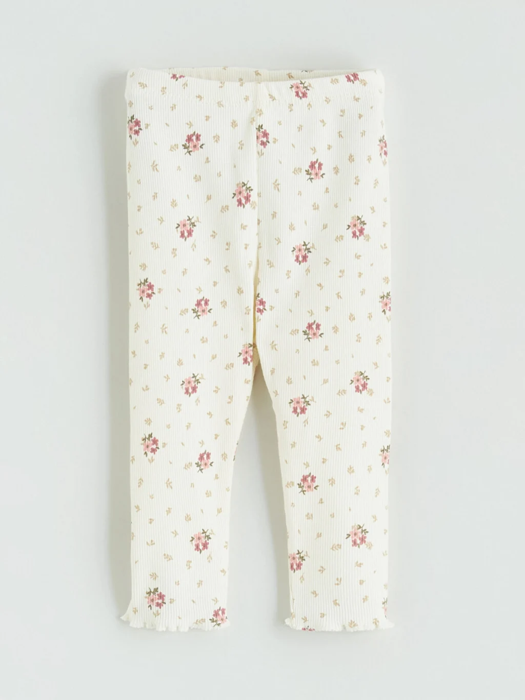 Biri çiçek desenli, ikisi düz olmak üzere üç parçadan oluşan kız bebek tayt seti, beli lastikli ve paçaları fırfır detaylıdır.
