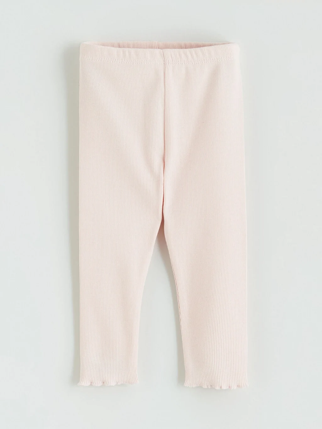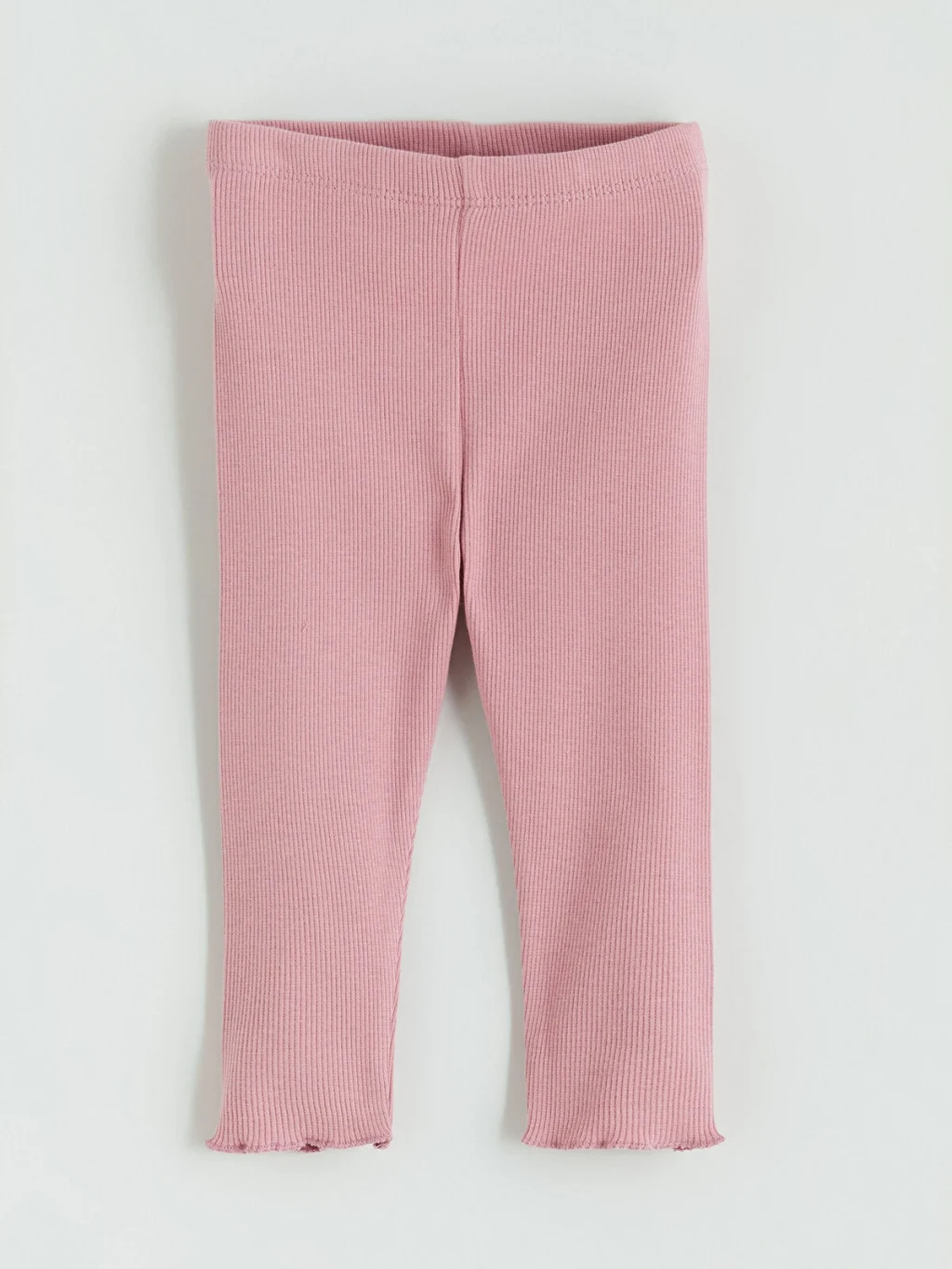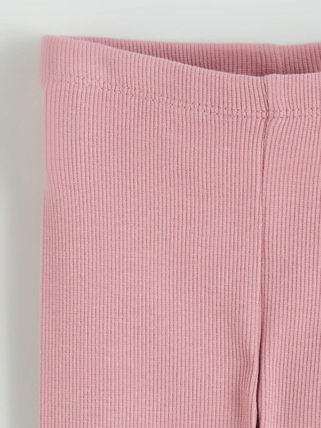 Biri çiçek desenli, ikisi düz olmak üzere üç parçadan oluşan kız bebek tayt seti, beli lastikli ve paçaları fırfır detaylıdır.