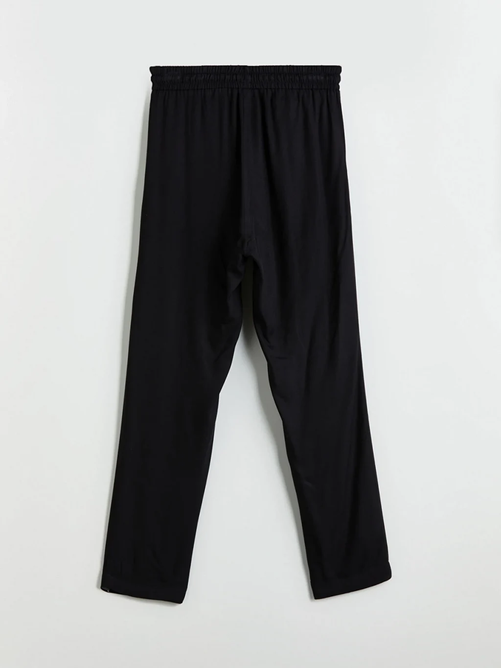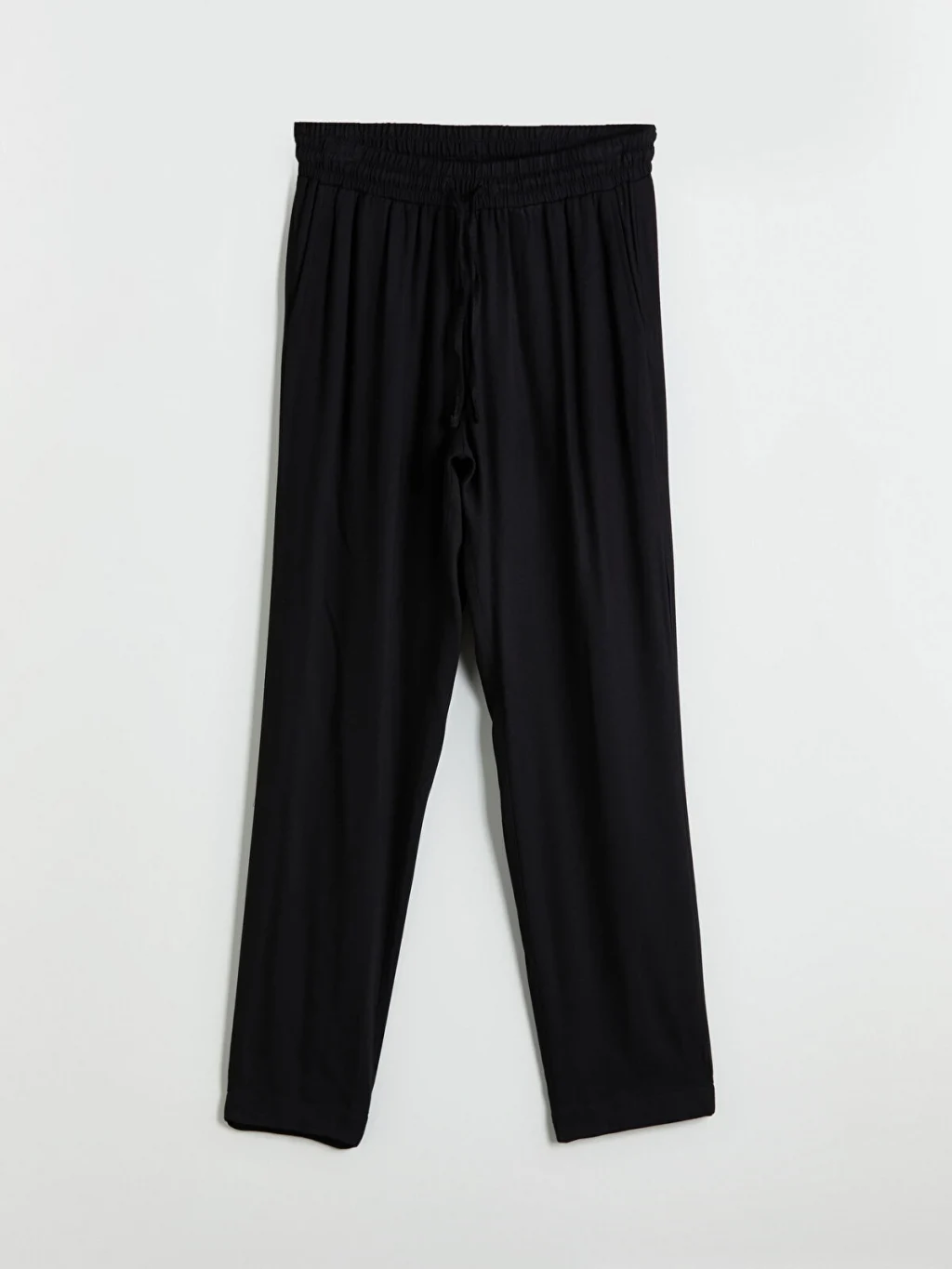 Beli lastikli kadın pantolon, viskoz kumaştan üretilmiştir. İki yandan cepli ve beli bağcıklı tasarıma sahiptir.