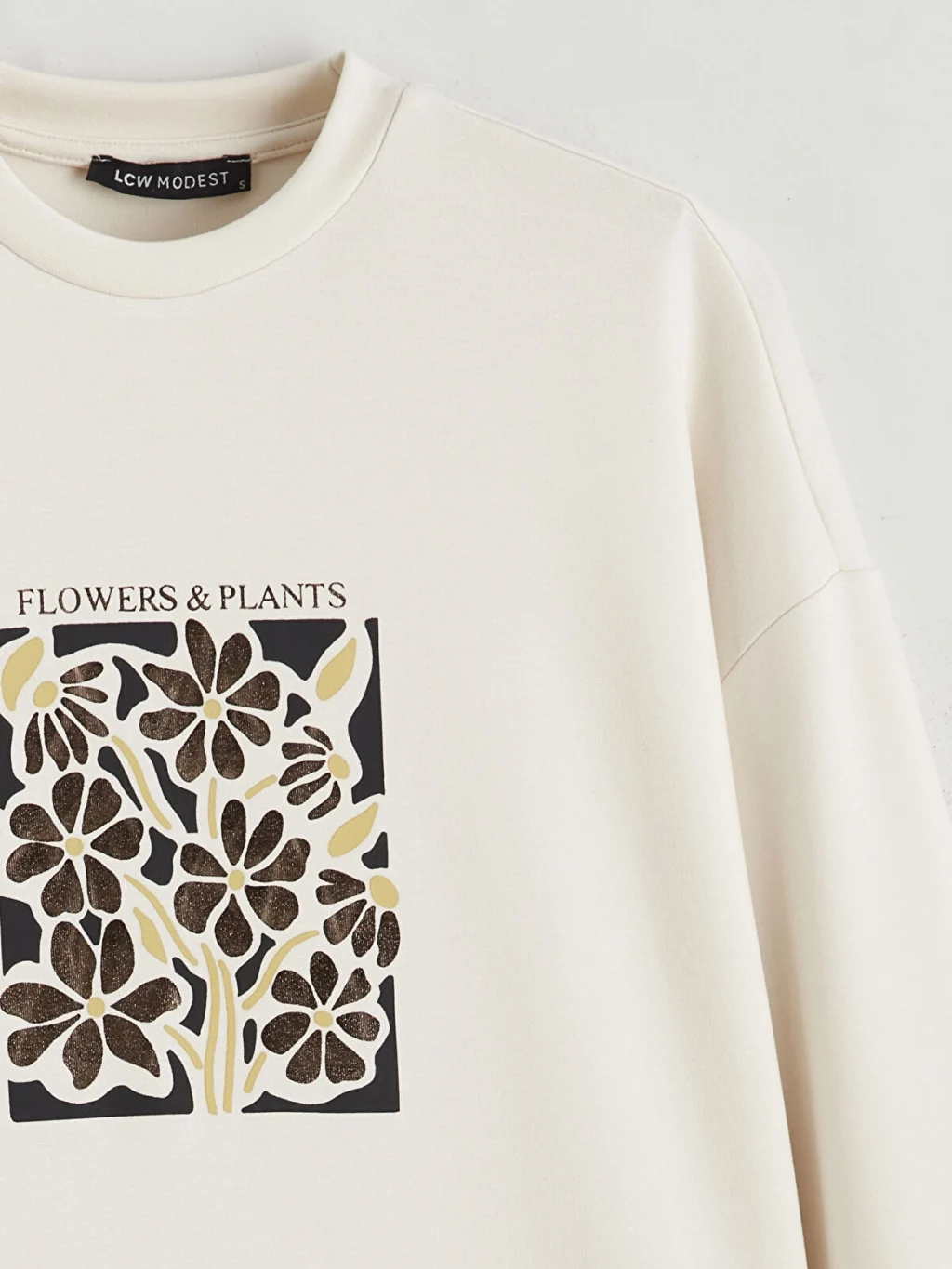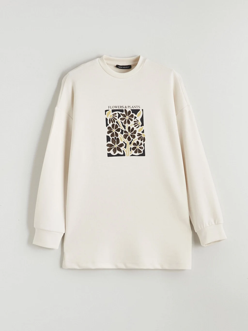 Lighttouch kumaşı hafif dokunuş ve modal hissi sunar. Bisiklet yakalı, önü çiçek ve yazı baskılı kadın sweatshirt tunik, uzun kollu olup kol uçları ribanalıdır.