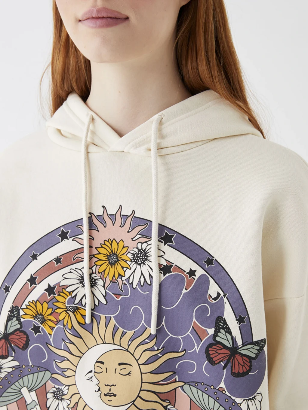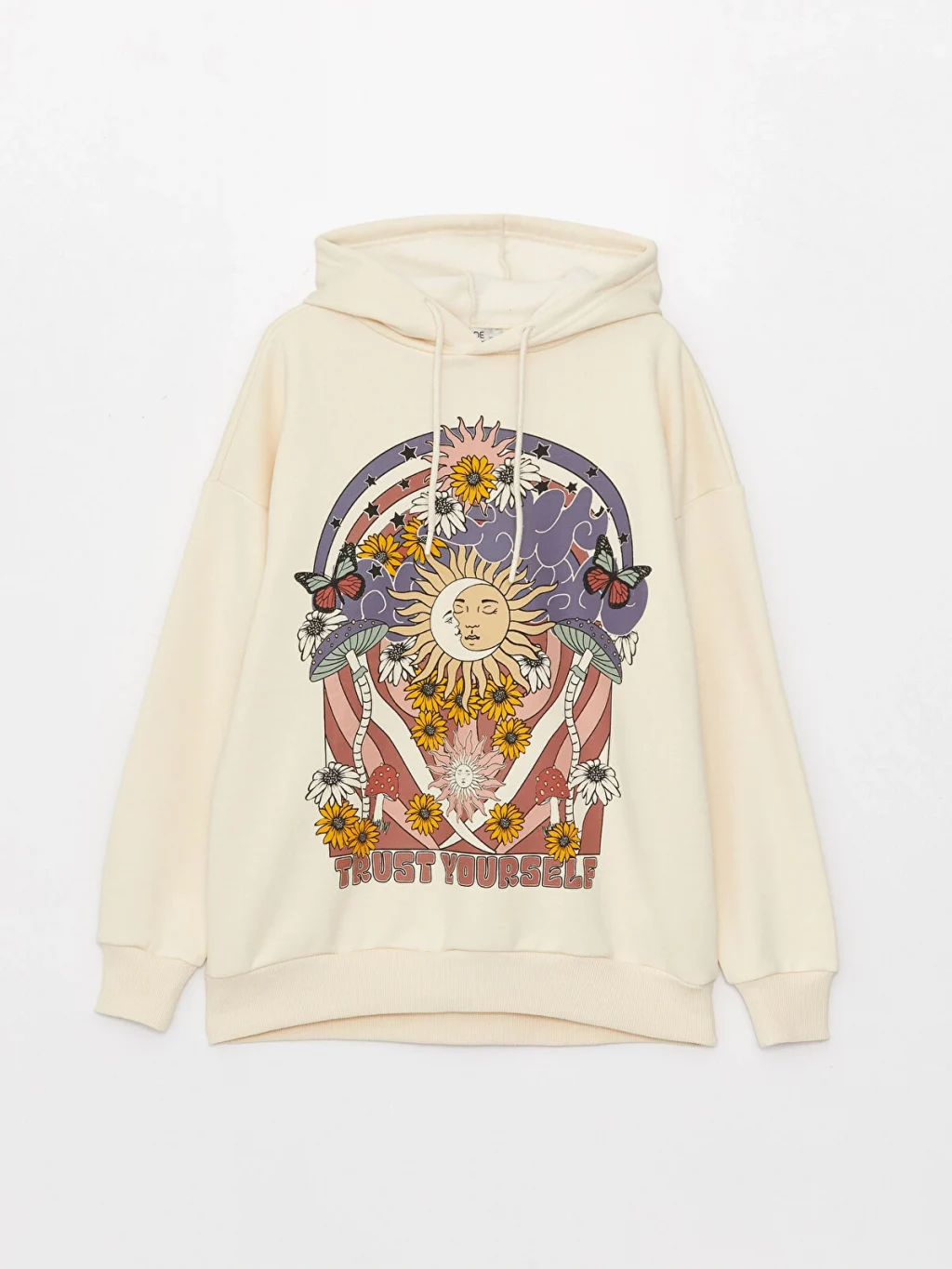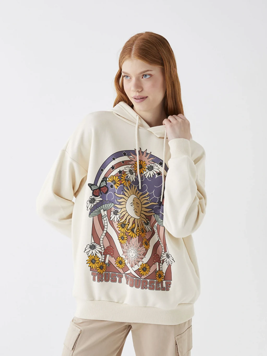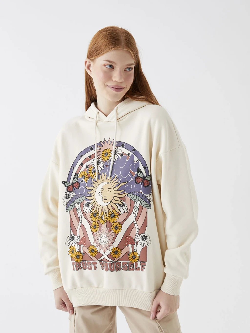 Baskılı oversize kadın hoodie, bağcıklı sabit kapüşon detayı ile dikkat çekiyor. Bu kapüşonlu sweatshirt, 3 iplik kumaşı sayesinde hem yumuşaklık hem de dayanıklılık sunarak, sıcak ve konforlu bir kullanım deneyimi sağlar.