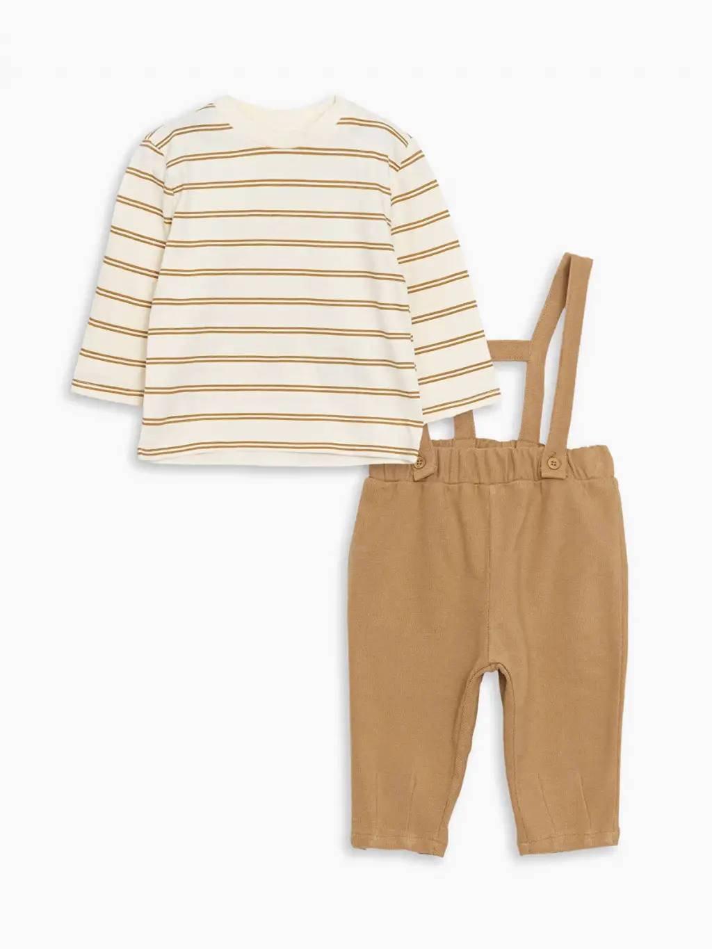 Çizgili tişört ve askılı pantolondan oluşan 2'li takım, yumuşak pamuklu penye kumaşı sayesinde bebeğinizin hassas cildine nazik bir dokunuş sunar. Tişörtün nefes alabilir yapısı ve askılı pantolonun esnek tasarımı, hareket özgürlüğü sağlar.