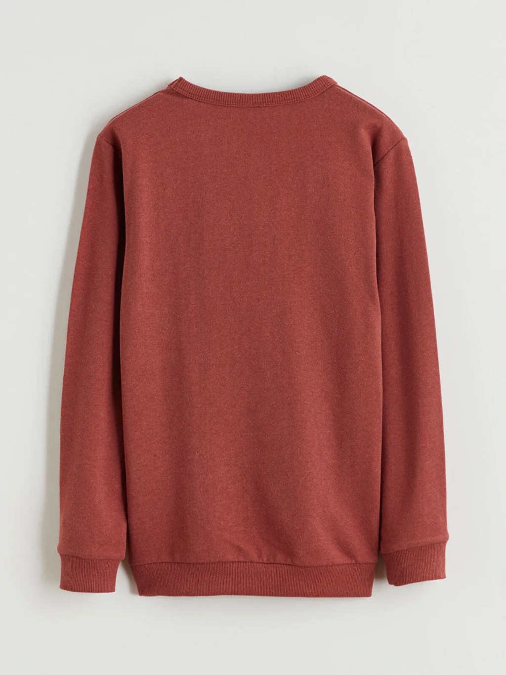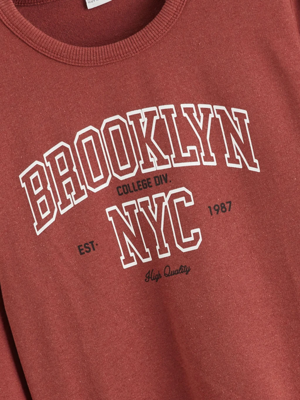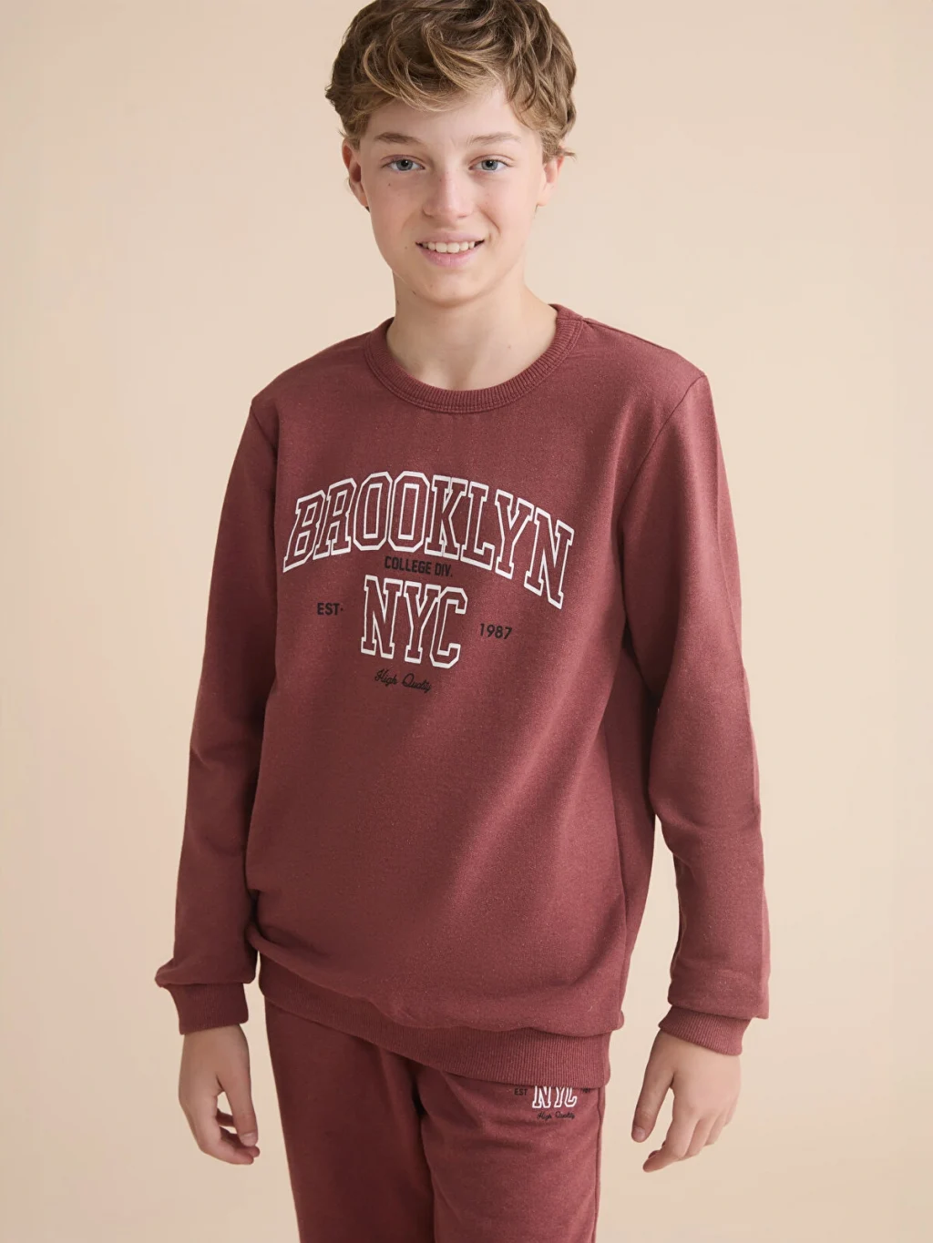 Bisiklet yakalı ve uzun kollu erkek çocuk sweatshirt, orta kalınlıkta 3 iplik kumaşa sahiptir. Önü yazı baskılı, kol ve etek ucu ribanalıdır.