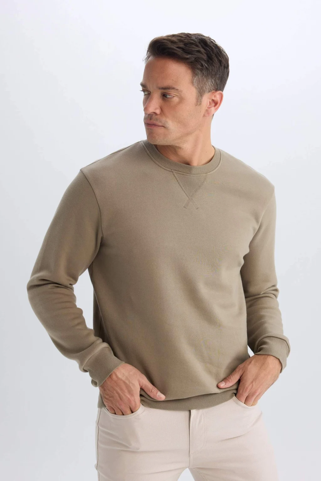 Defacto T3777 Haki Regular Fit Bisiklet Yaka Kalın Basic Düz Sweatshirt