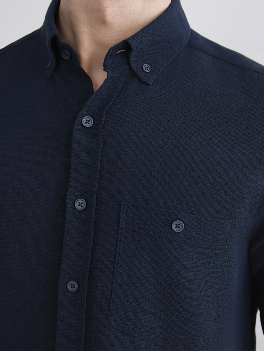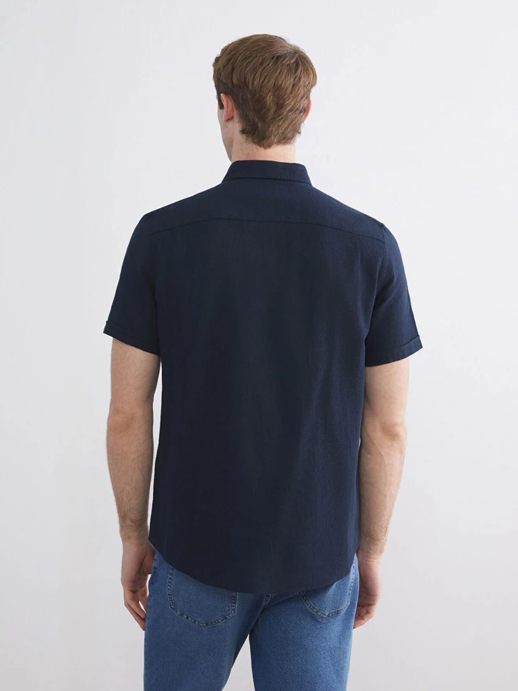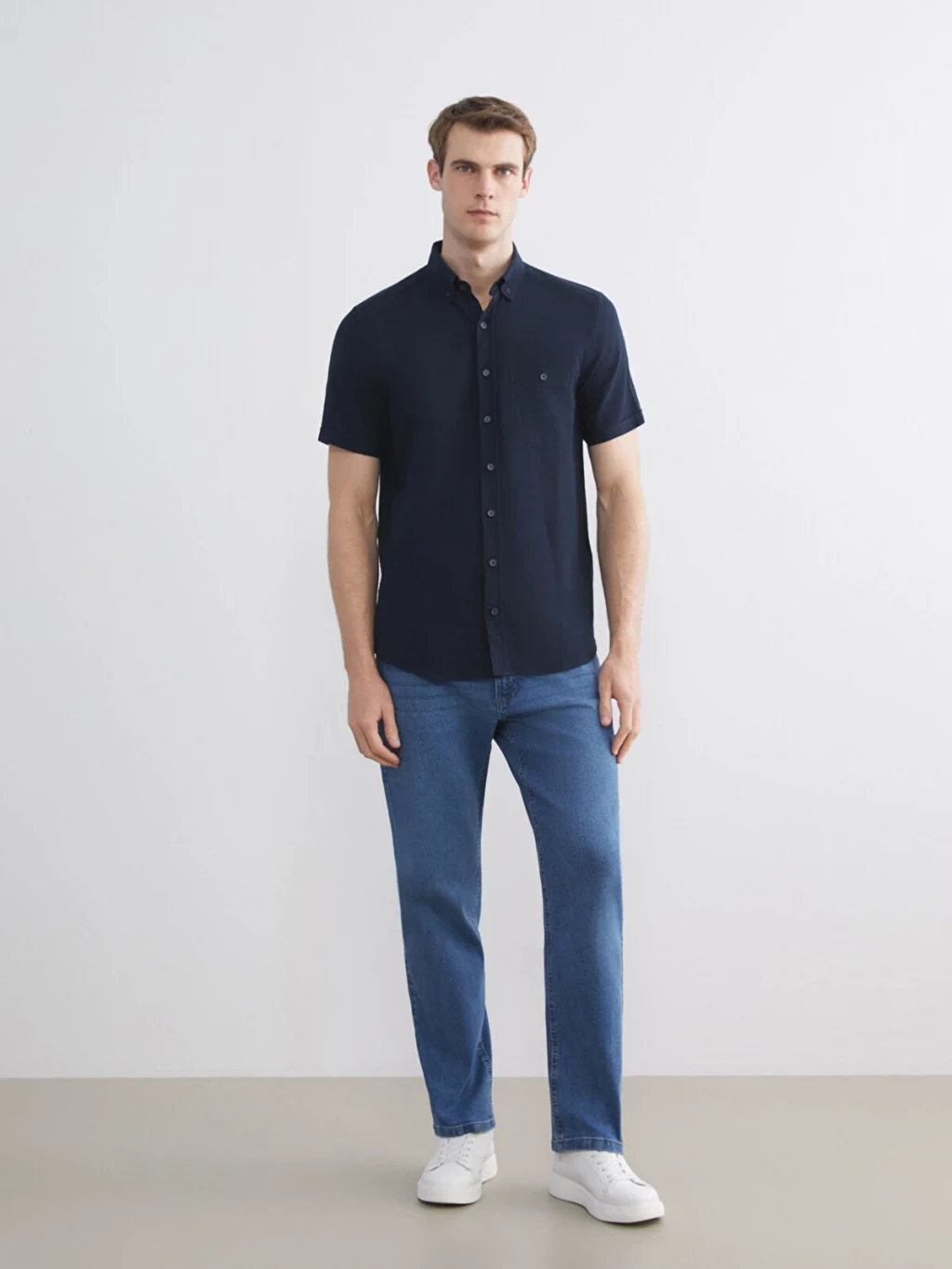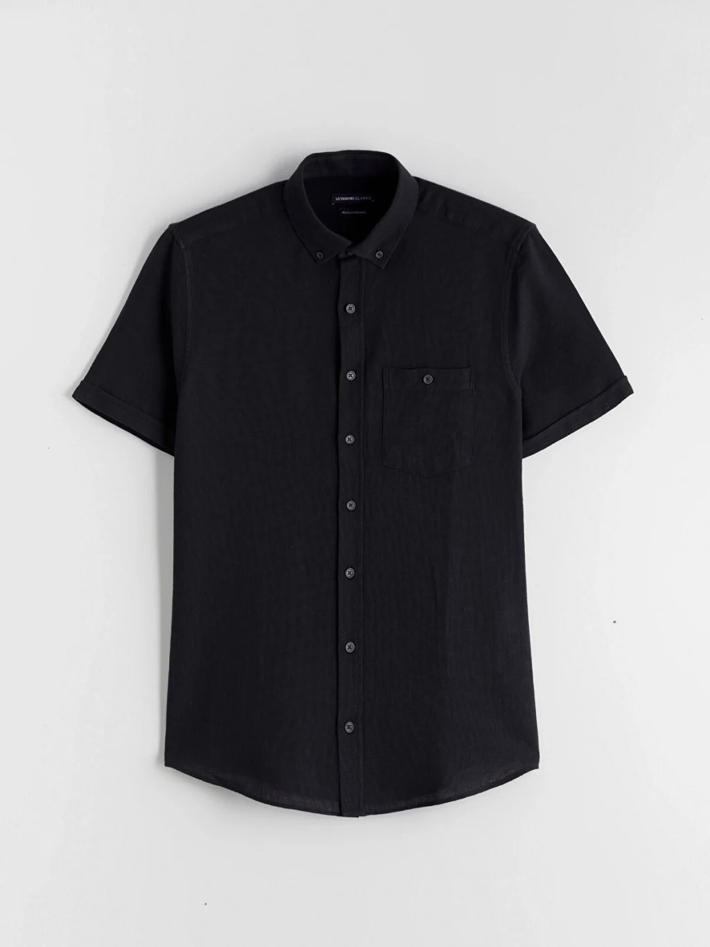 %100 pamuklu erkek gömlek, kısa kollu ve düğmeli gömlek yakalıdır. Önden düğme kapamalıdır ve düğmeli bir göğüs cebi bulunur.