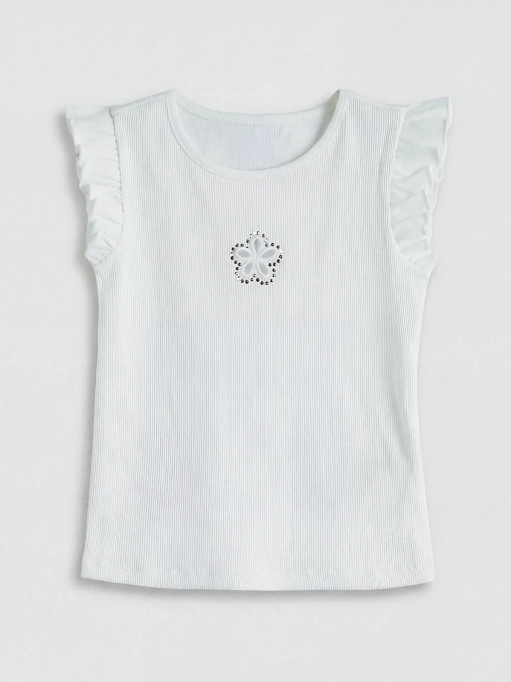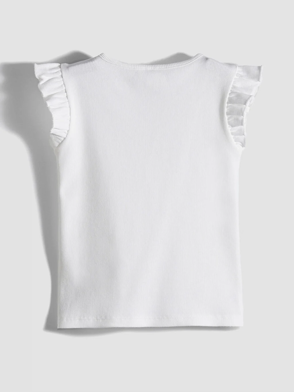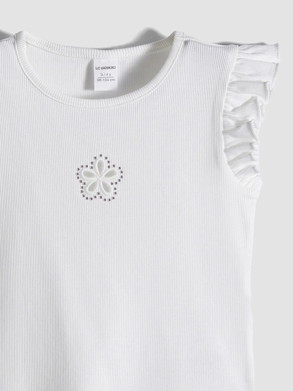 Bisiklet yakalı ve kolu fırfırlı kız çocuk atlet, kaşkorse kumaştan üretilmiştir ve önü nakış detaylıdır.