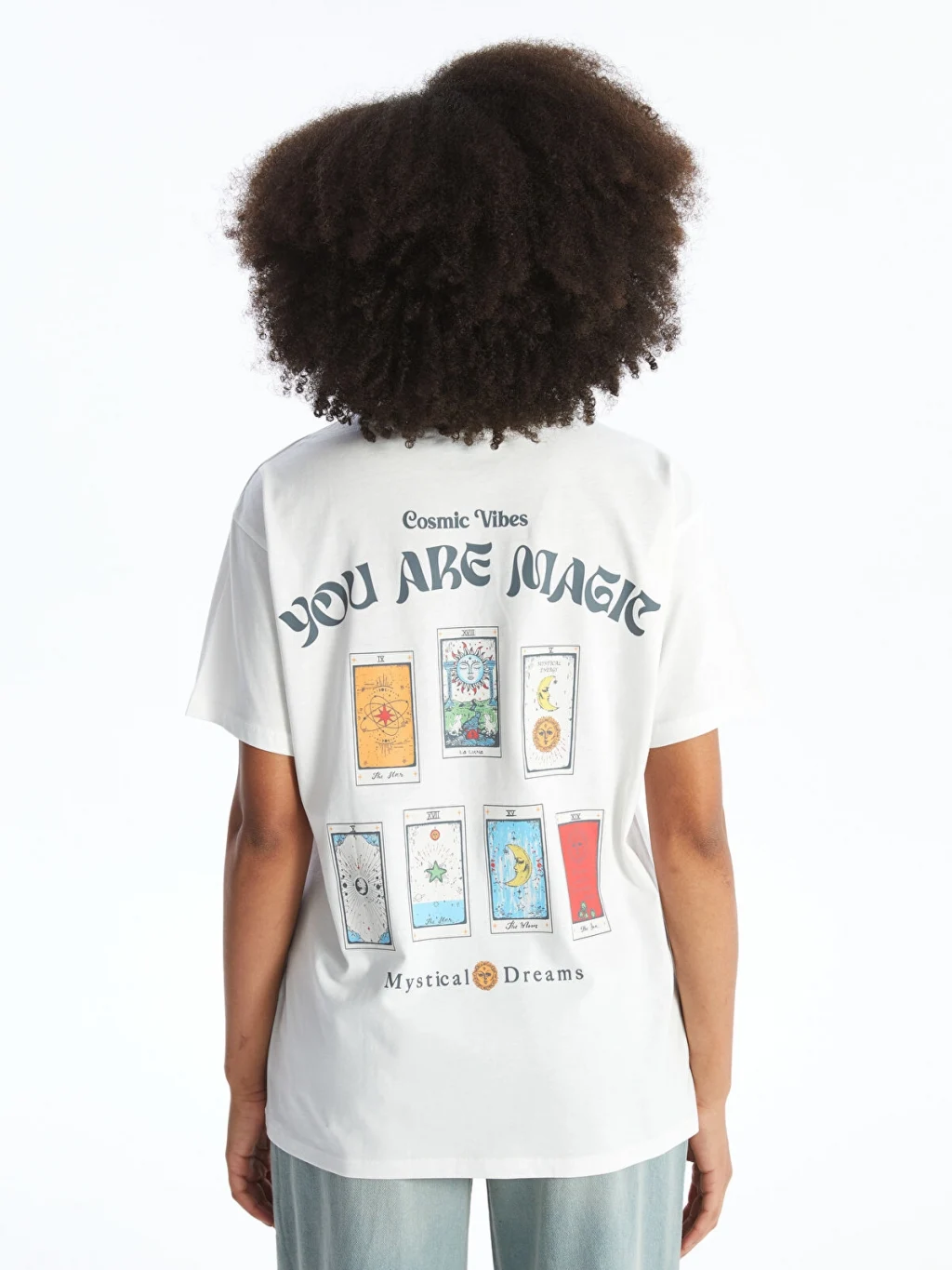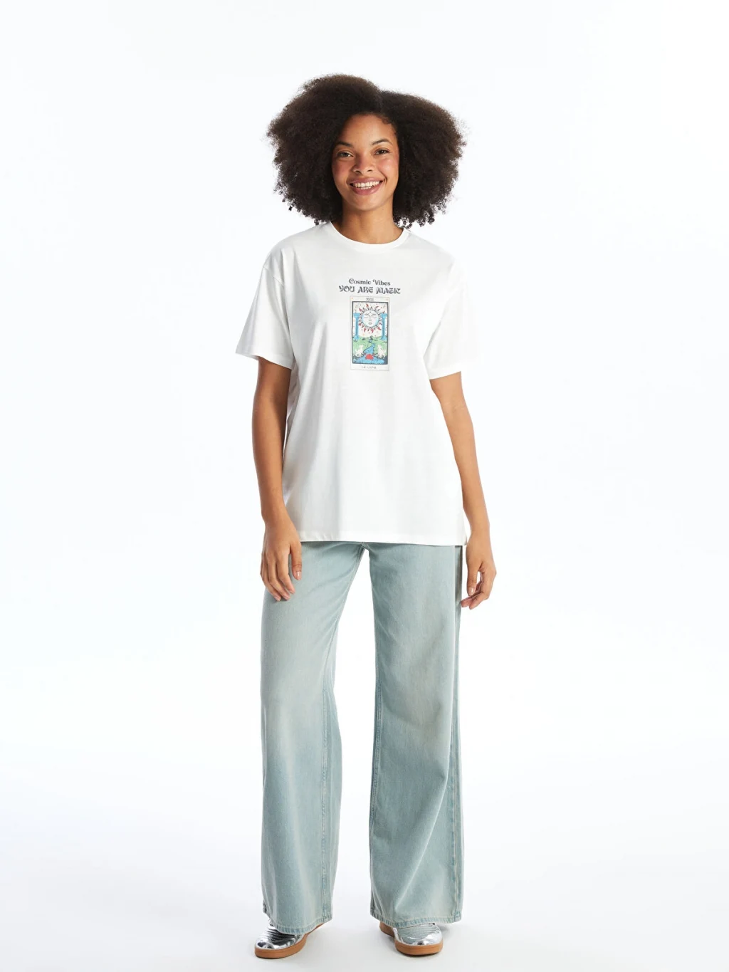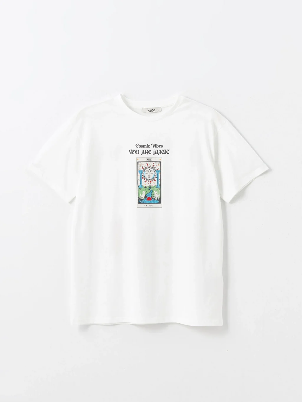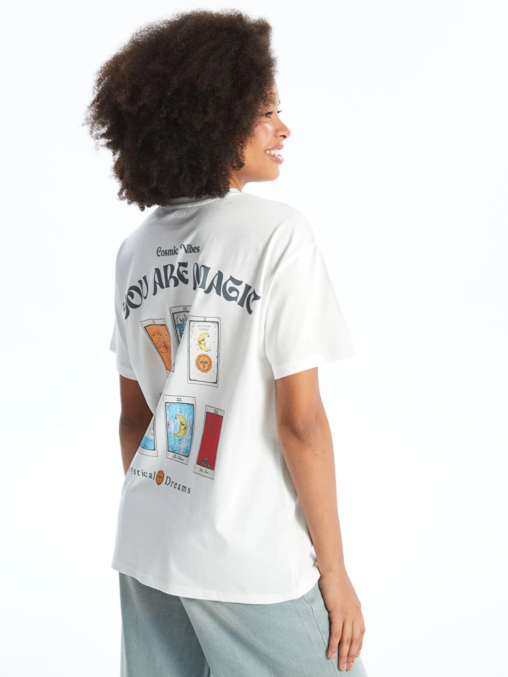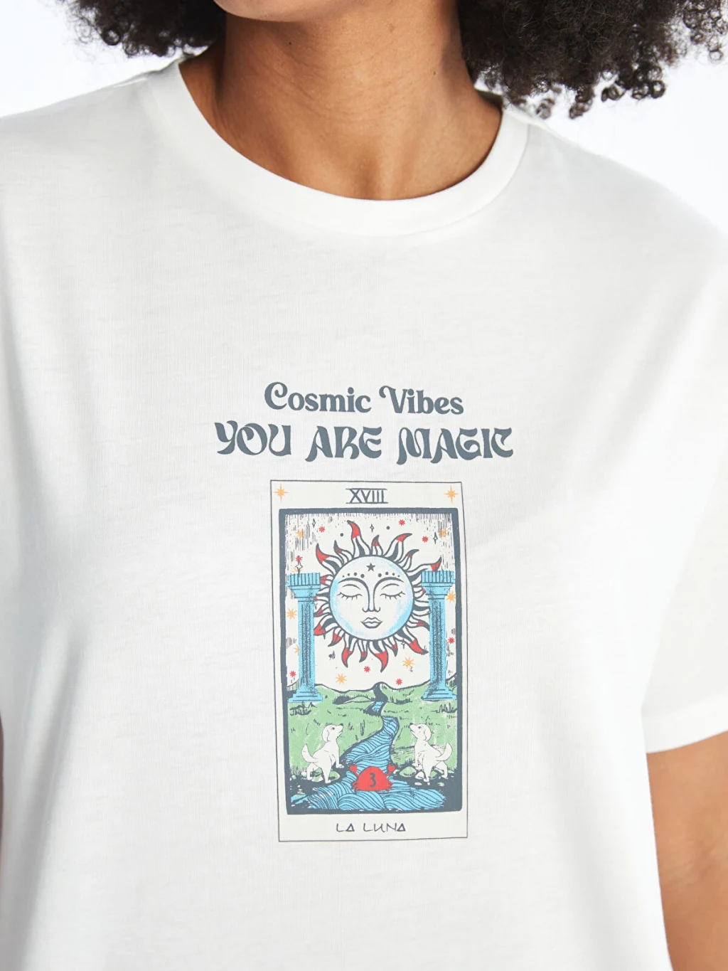 Bisiklet yaka baskılı kısa kollu tişört, süprem kumaştan üretilmiştir. Hafif ve nefes alabilen yapısı ile yaz aylarında serinlik sunar.