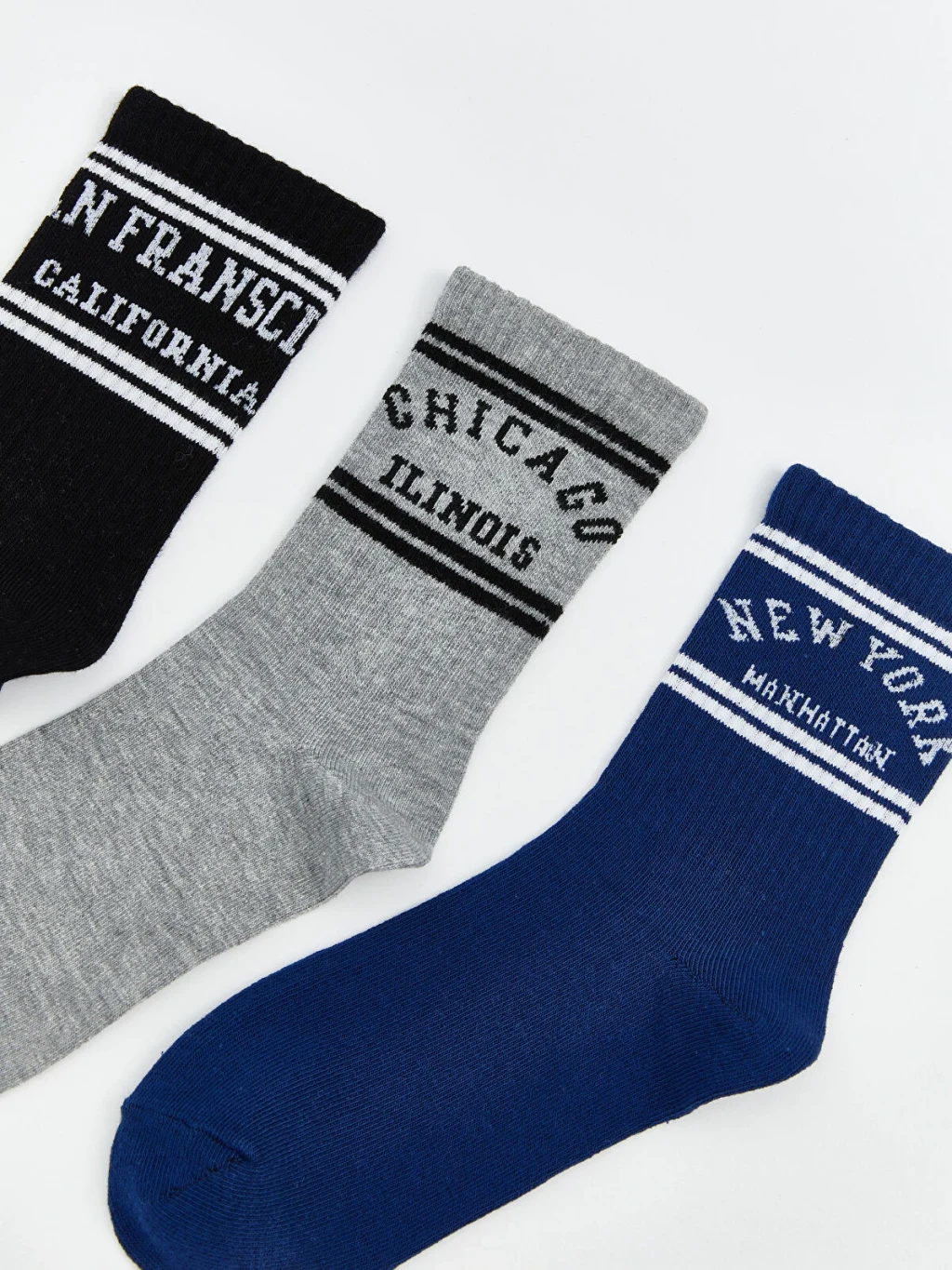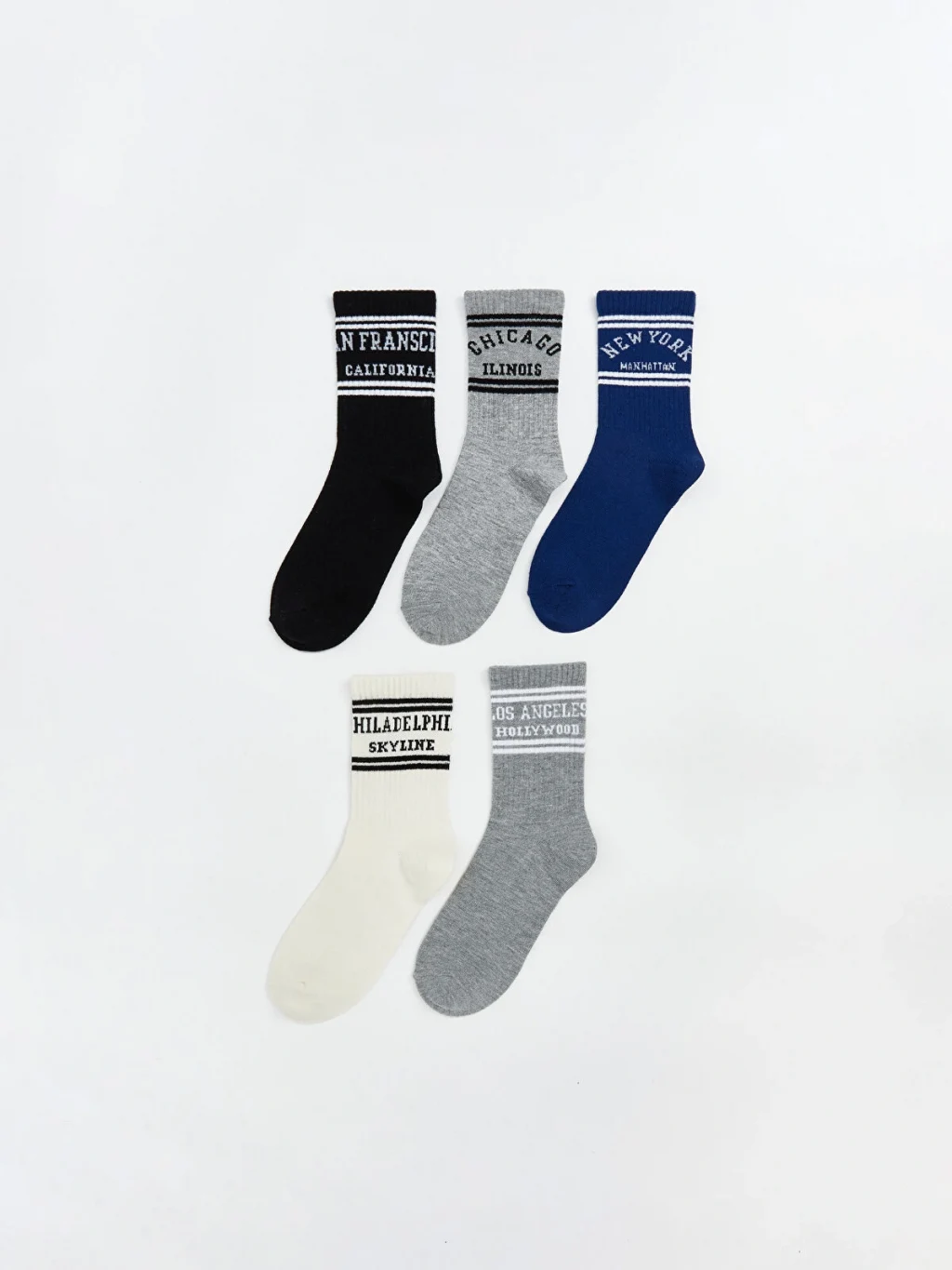 Erkek çocuk soket çorap, ribana manşetlidir. Manşet kısmı çizgili ve yazılı tasarıma sahiptir. Beşli paket halinde sunulur.