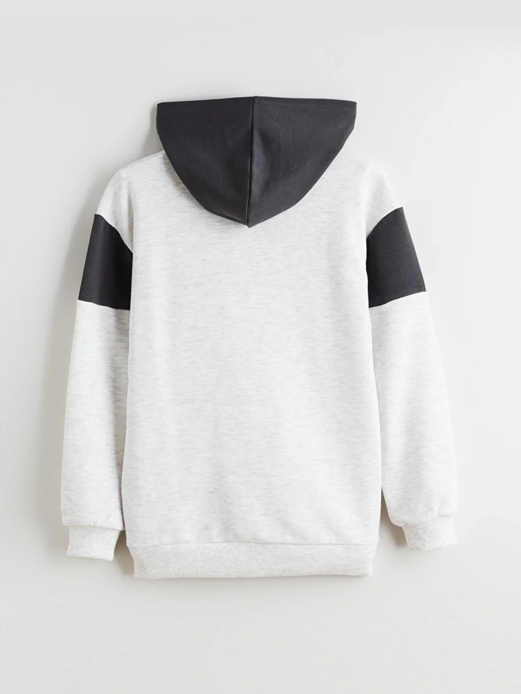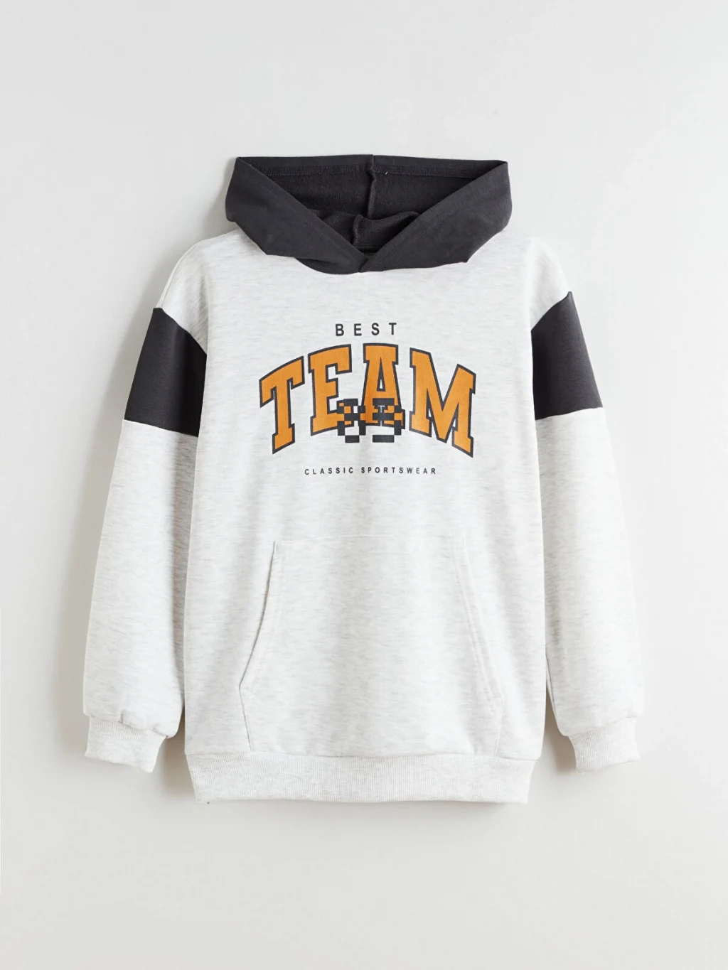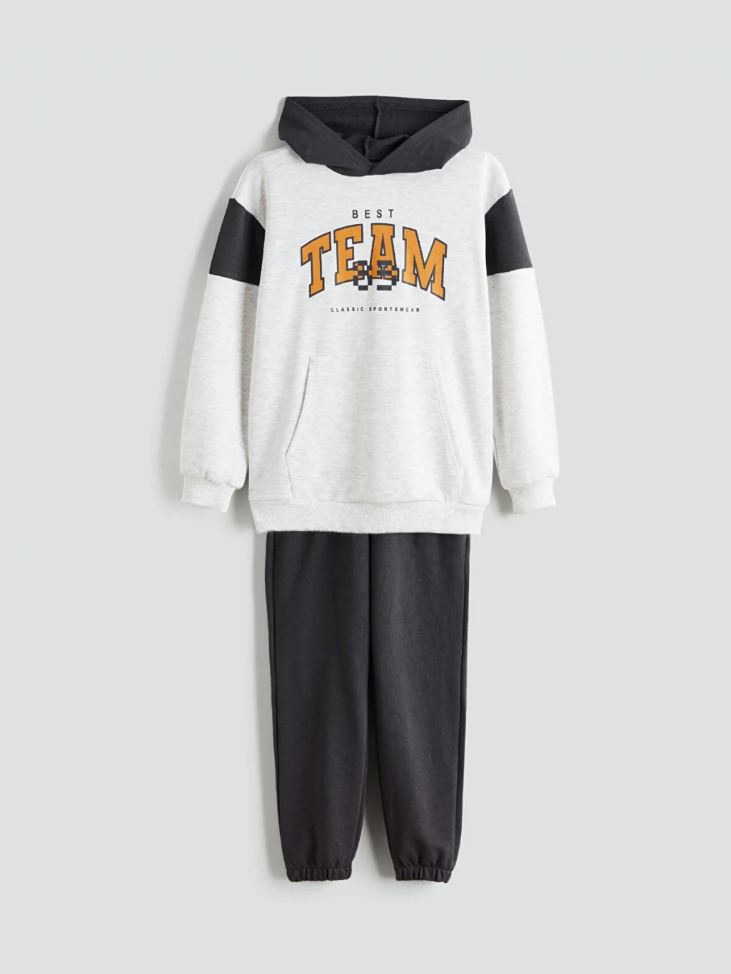 Erkek çocuk takım; kapüşonlu, uzun kollu, önü baskılı, kanguru cepli sweatshirt ve beli ile paçaları lastikli eşofman alttan oluşur. 3 iplik kumaştır.