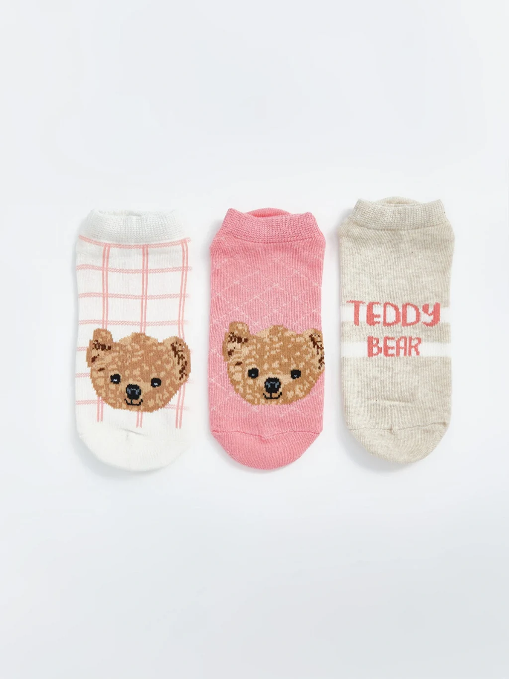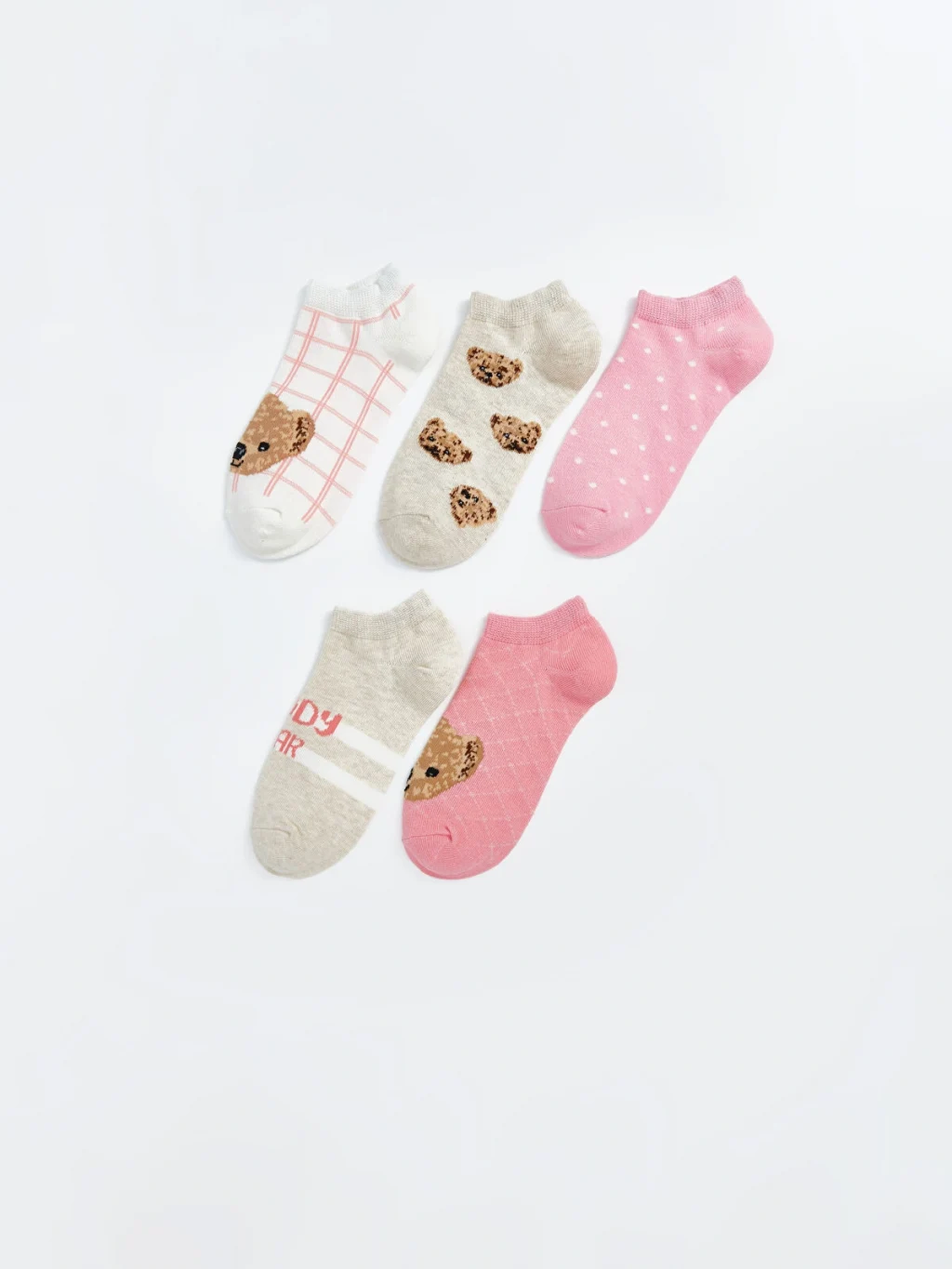 Kız çocuk için beş çiftten oluşan patik çorap seti, ayı figürlü, ekose ve puantiyeli gibi farklı desenlere sahiptir.
